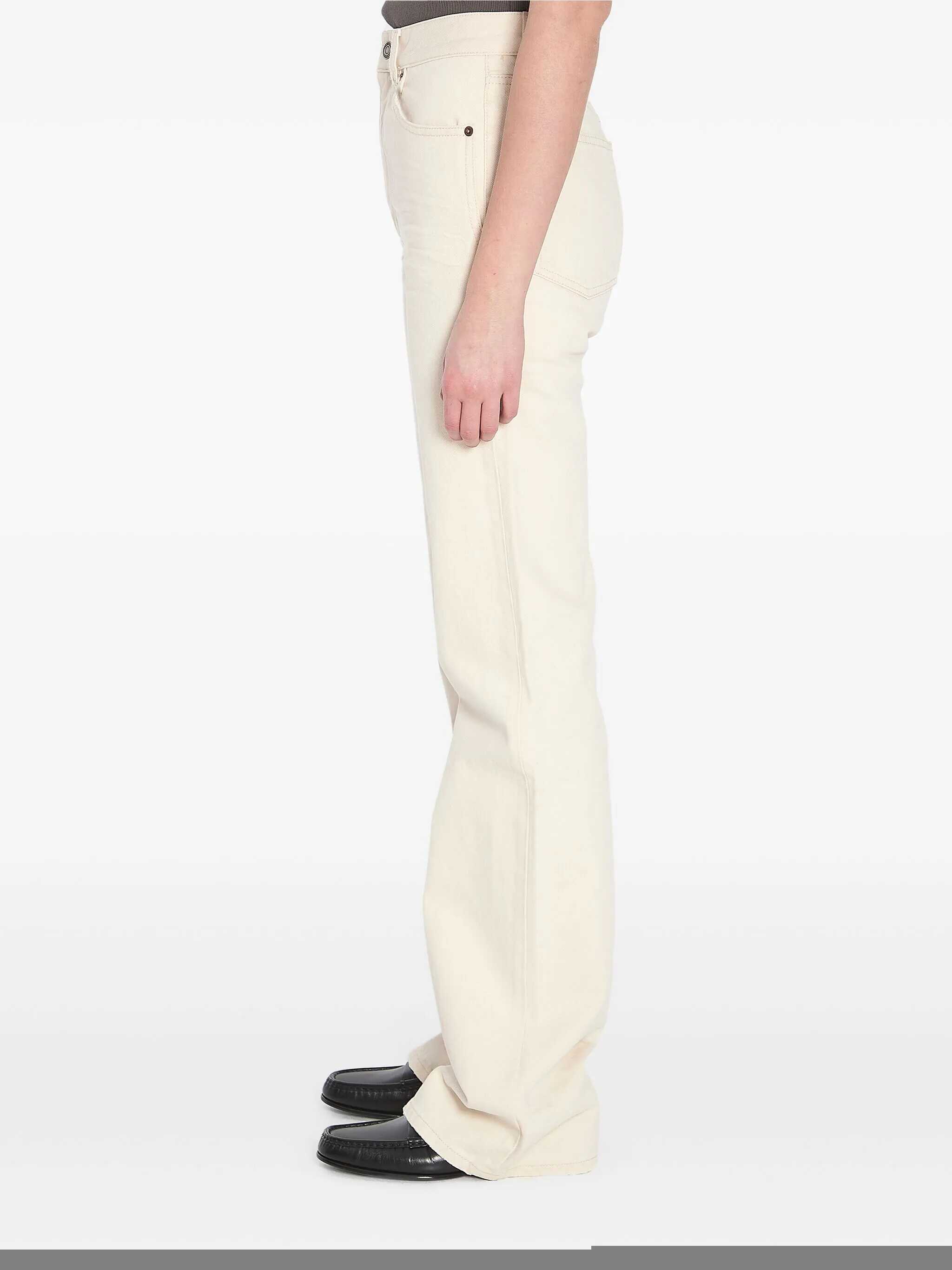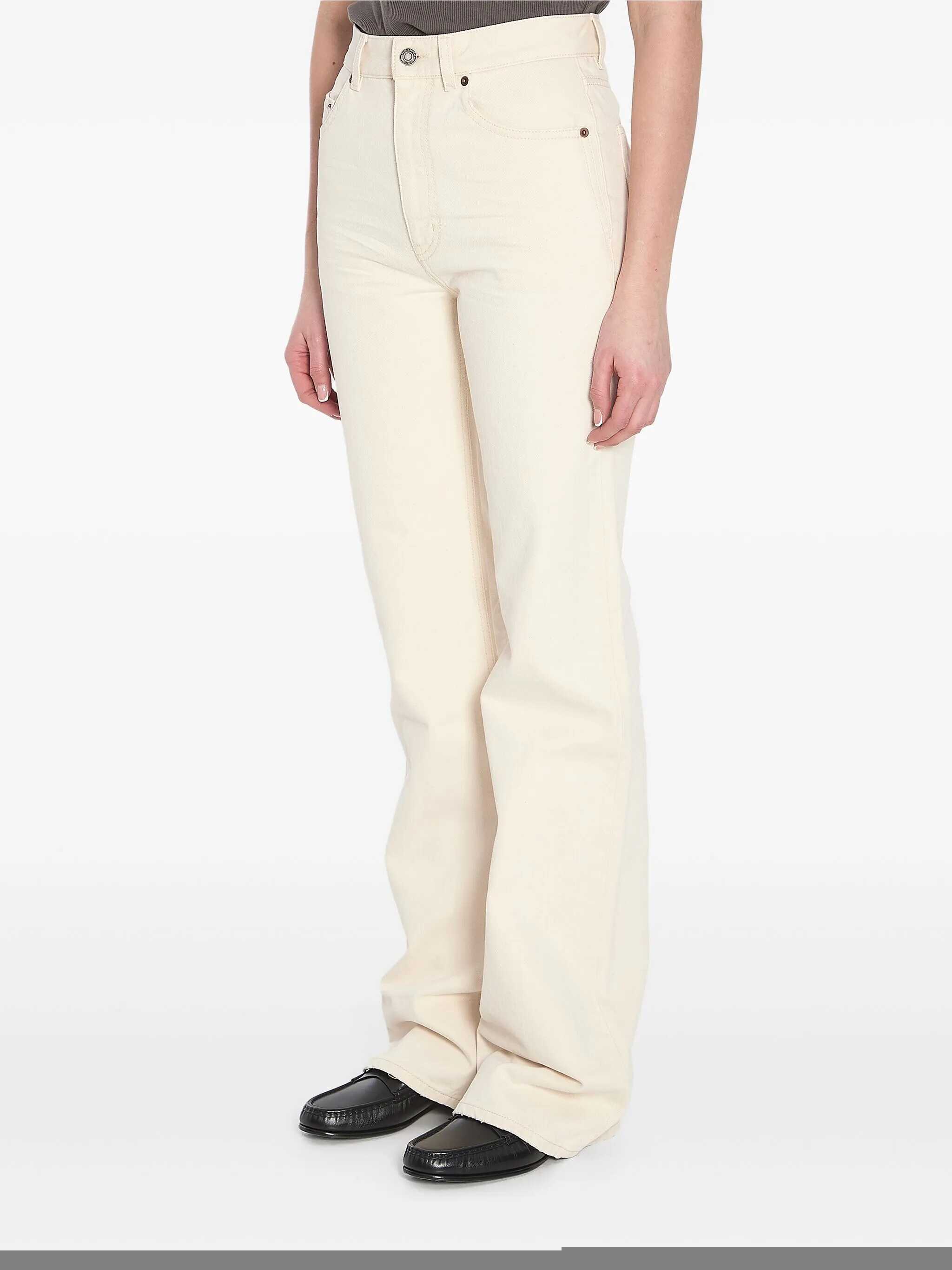 70s high-waisted jeans in milky white cotton denim. They feature a button and zip closure, belt loops, five pockets, boot-cut flared legs, and a beige leather logo patch on the back.