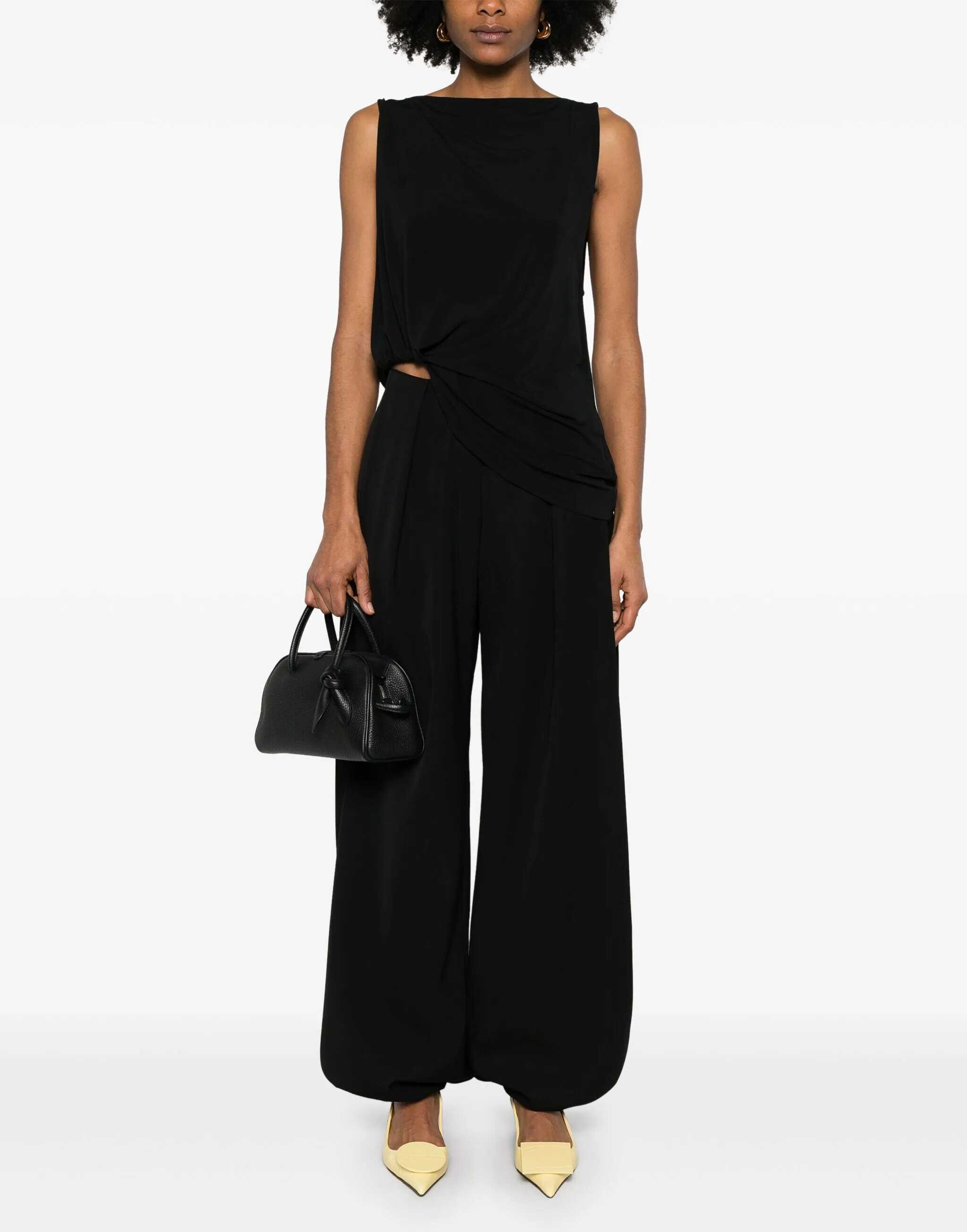The Le Haut Peplo Top by Jacquemus is a garment with a unique and refined style. This sleeveless top features a wide collar, which gives a distinctive and modern touch to the design, creating a clean yet bold line. The most interesting detail is the crisscross design on the front, which adds movement and structure to the garment, creating an interesting and sophisticated visual effect.