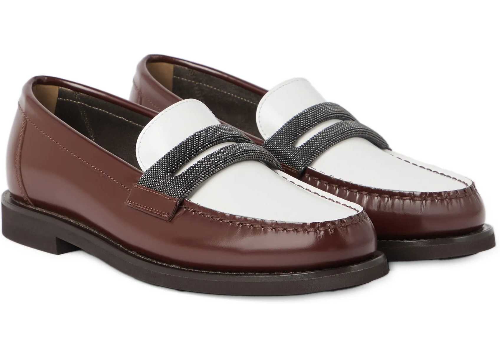 Brunello Cucinelli's leather Loafers are the perfect blend of elegance and comfort. The round toe offers a comfortable fit, while the leather block heel adds stability and a touch of sophistication. The two-tone pattern gives the design a modern and distinctive look, while the branded insole completes the look with an exclusive detail. An ideal pair of loafers for those seeking a balance between classic style and innovation.
