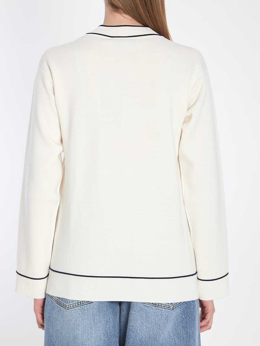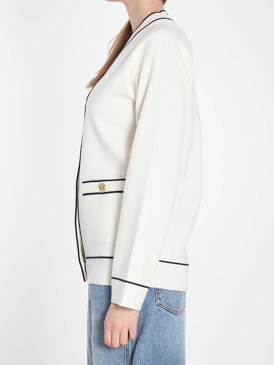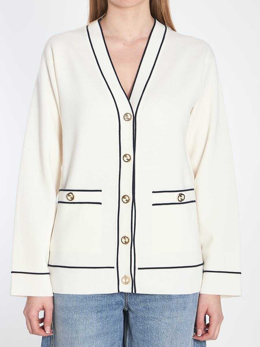 Fine wool white cardigan with dark blue piping finishes. It features long sleeves, a button closure with Round GG Interlocking buttons, dropped shoulders, two front patch pockets with buttons, and ribbed finishes.