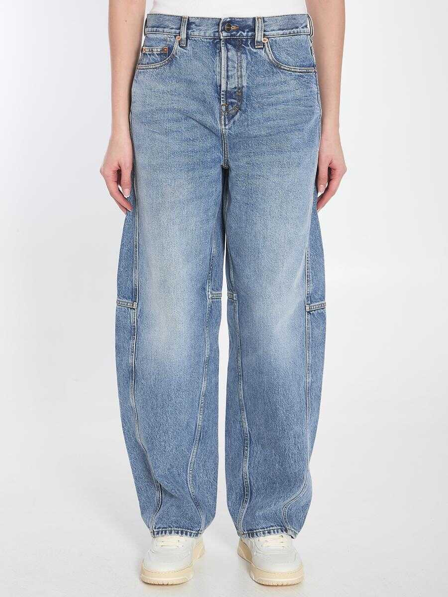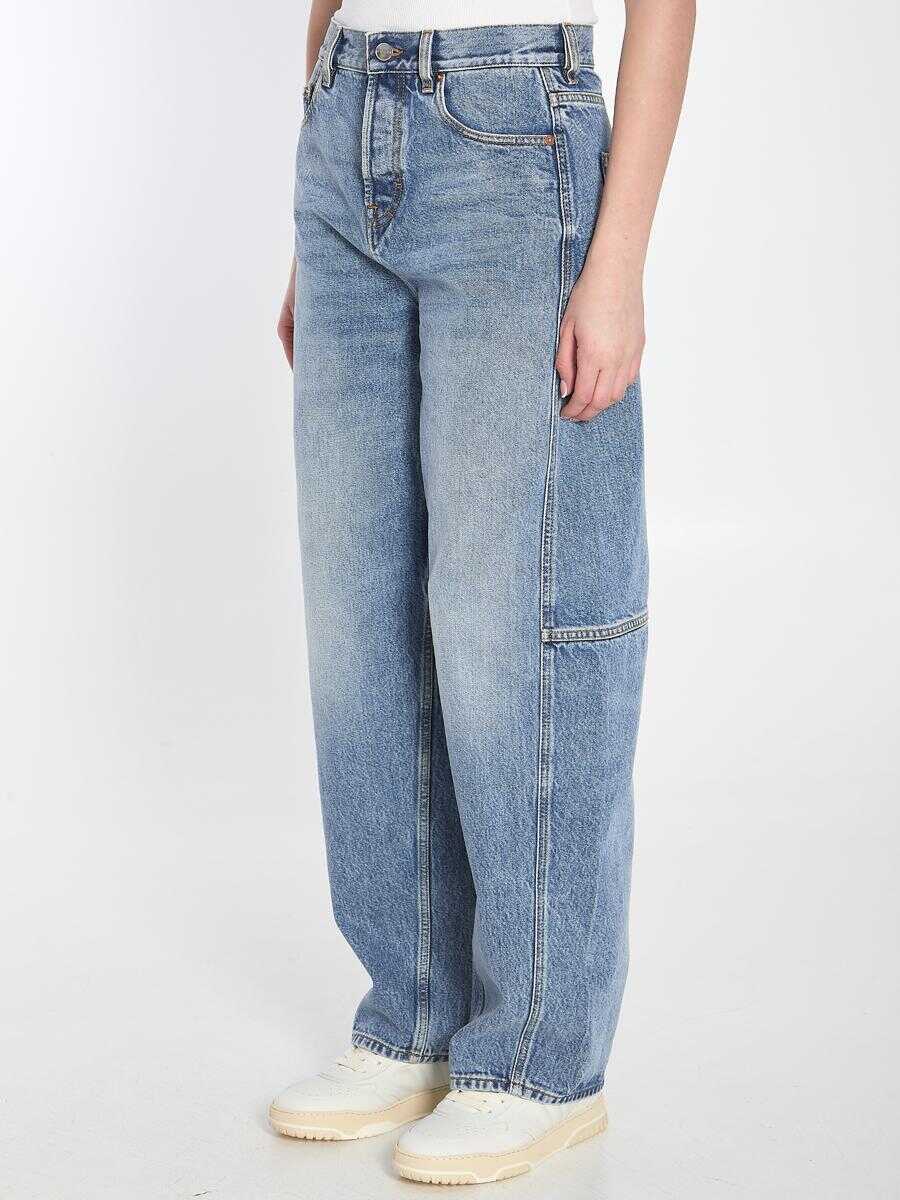 Balloon jeans in light blue cotton denim. They feature a petite fit, a button closure with an engraved logo, five pockets, belt loops, wide legs with stitching details, and a Gucci Rosso Ancora red naplak patch on the back. Petite fit.