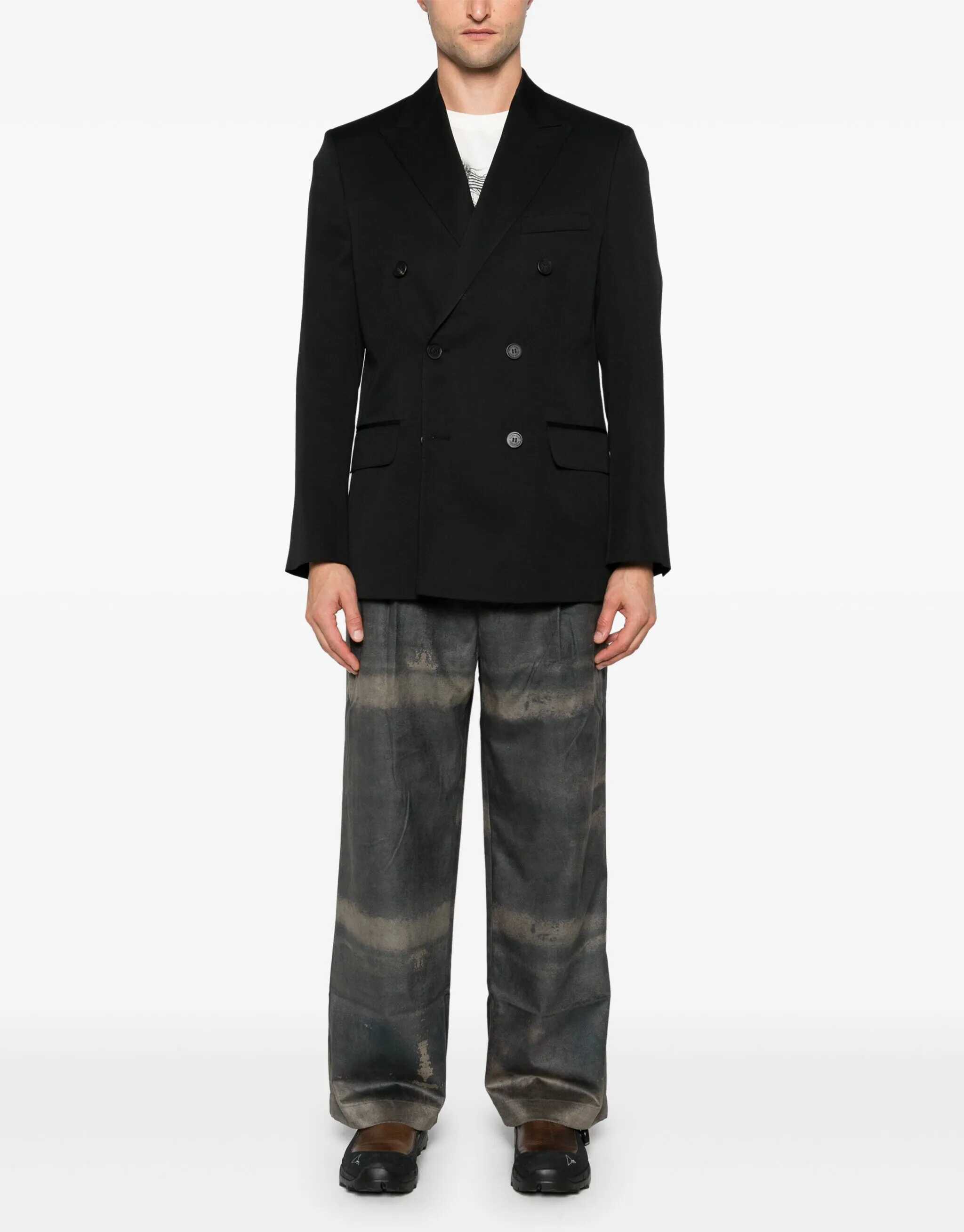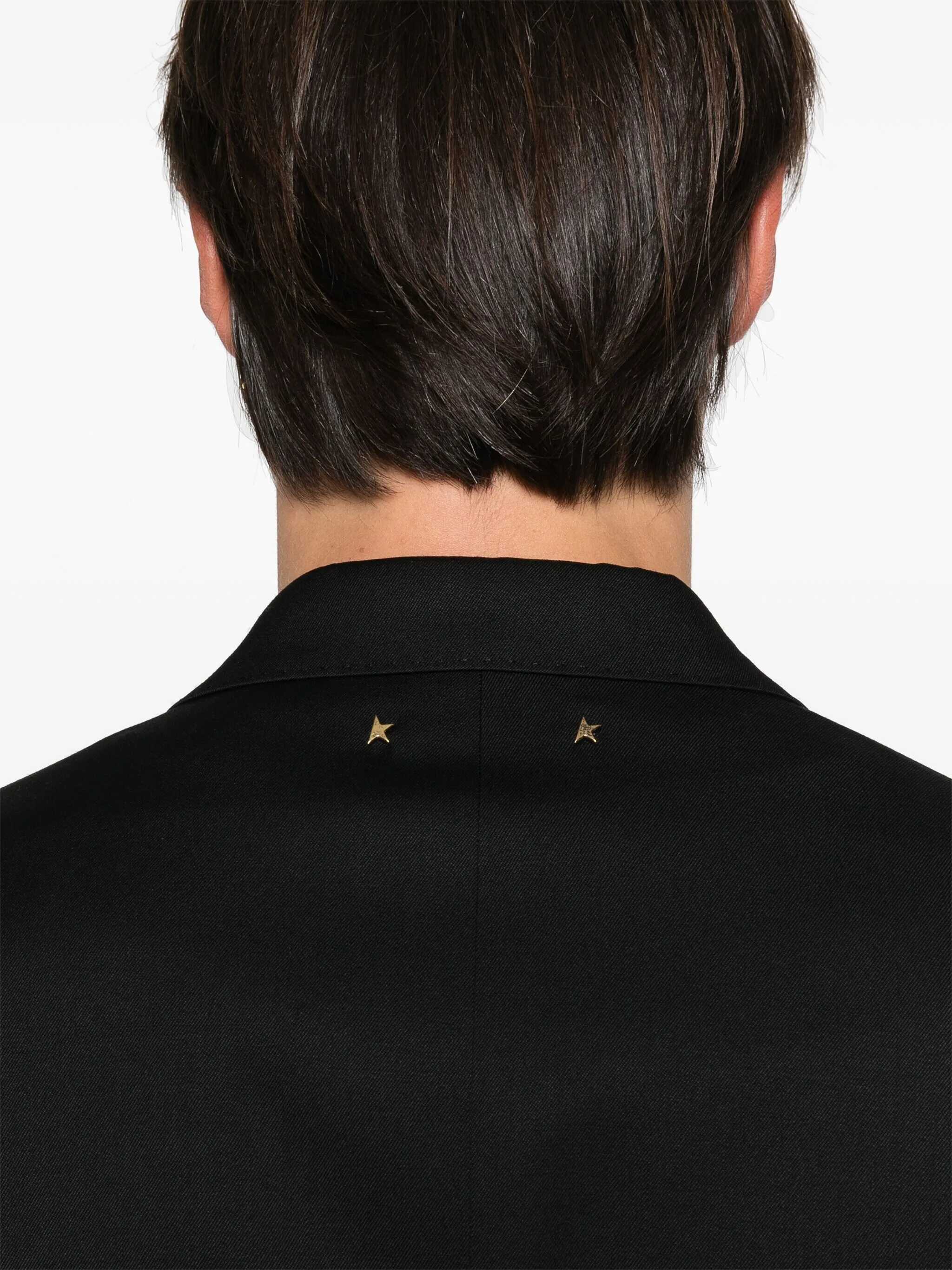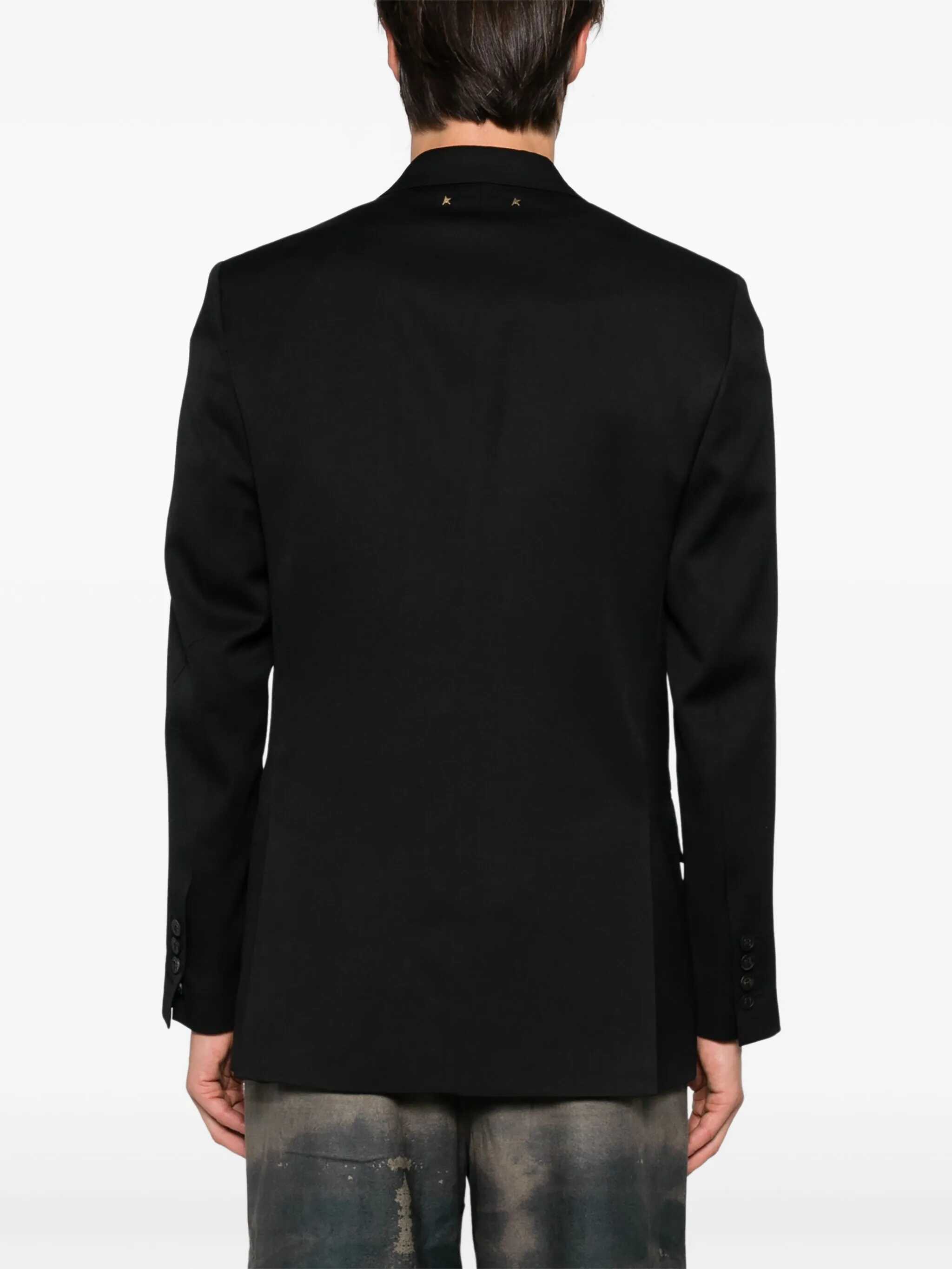 Golden Goose's Double-breasted Blazer features a front button closure, emphasizing its classic, structured design. It features peaked lapels, an elegant detail that gives the garment a sophisticated look. On the front, the blazer features two flap welt pockets and a front welt breast pocket, which add functionality and a touch of sophistication. The back of the blazer is enhanced by two slits, which allow for greater freedom of movement and complete the design in a harmonious way.