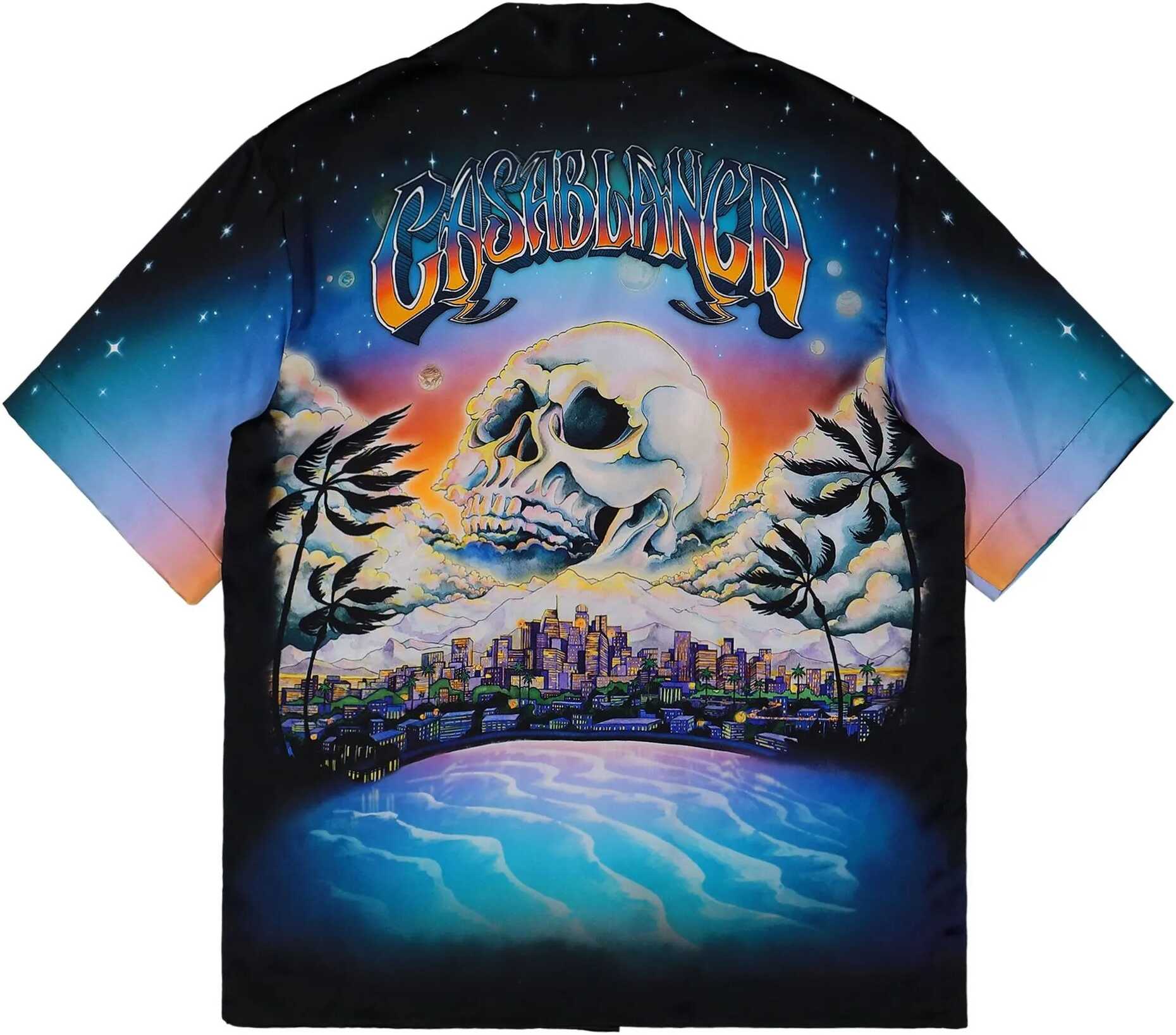 La Prémonition short-sleeve satin silk shirt with a multicolor sci-fi print. It features a Cuban collar, hidden button closure, a chest pocket, and a logo on the back.