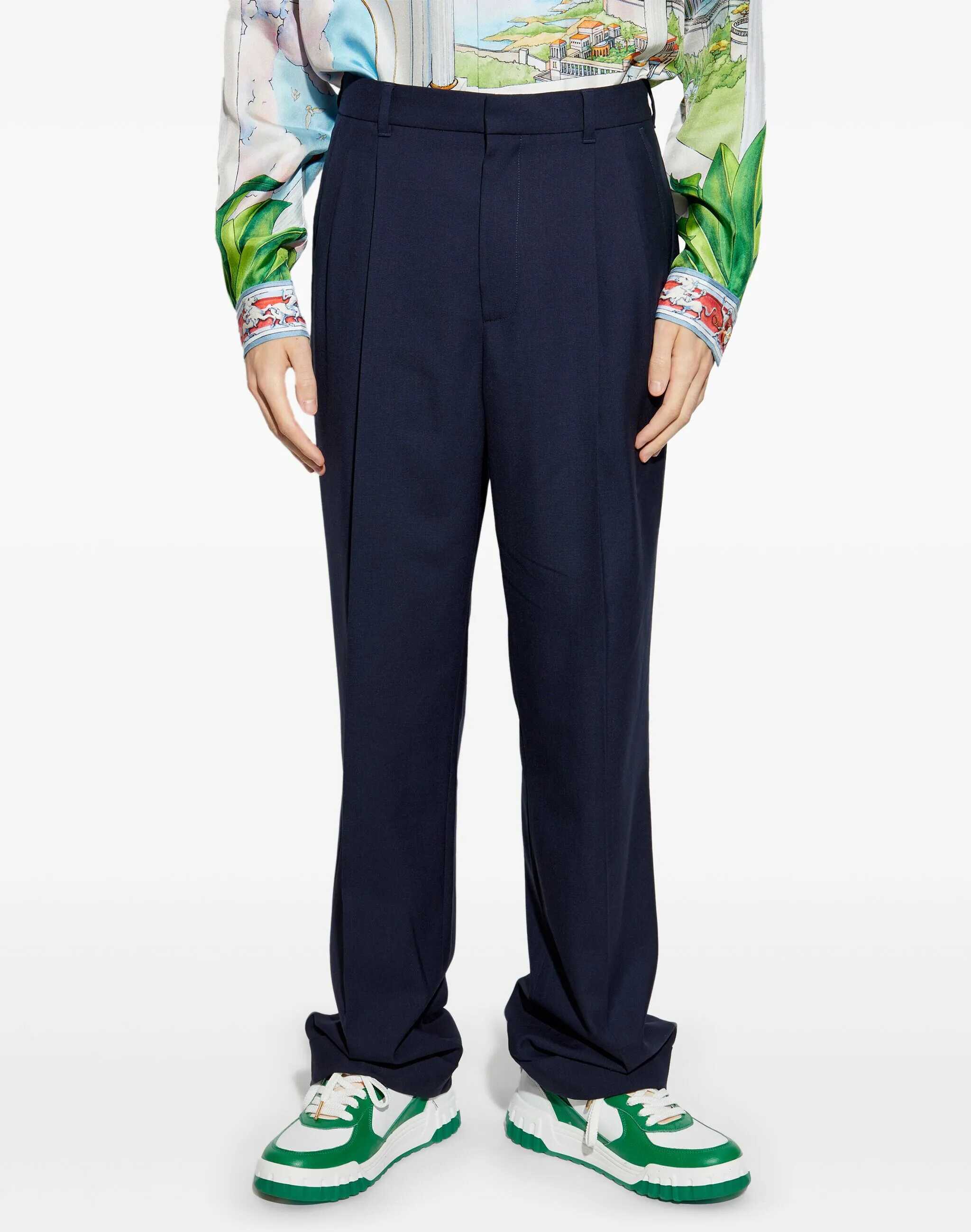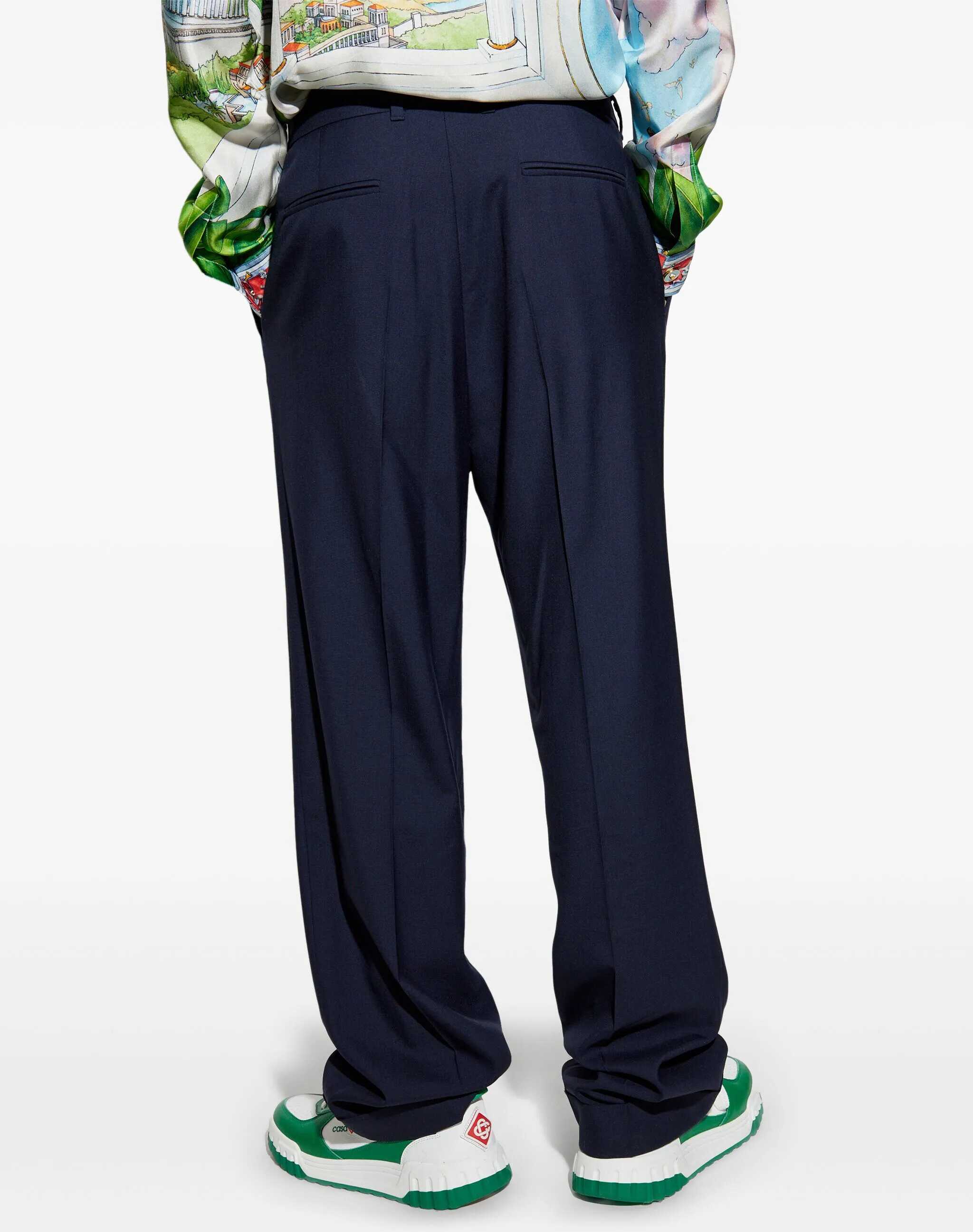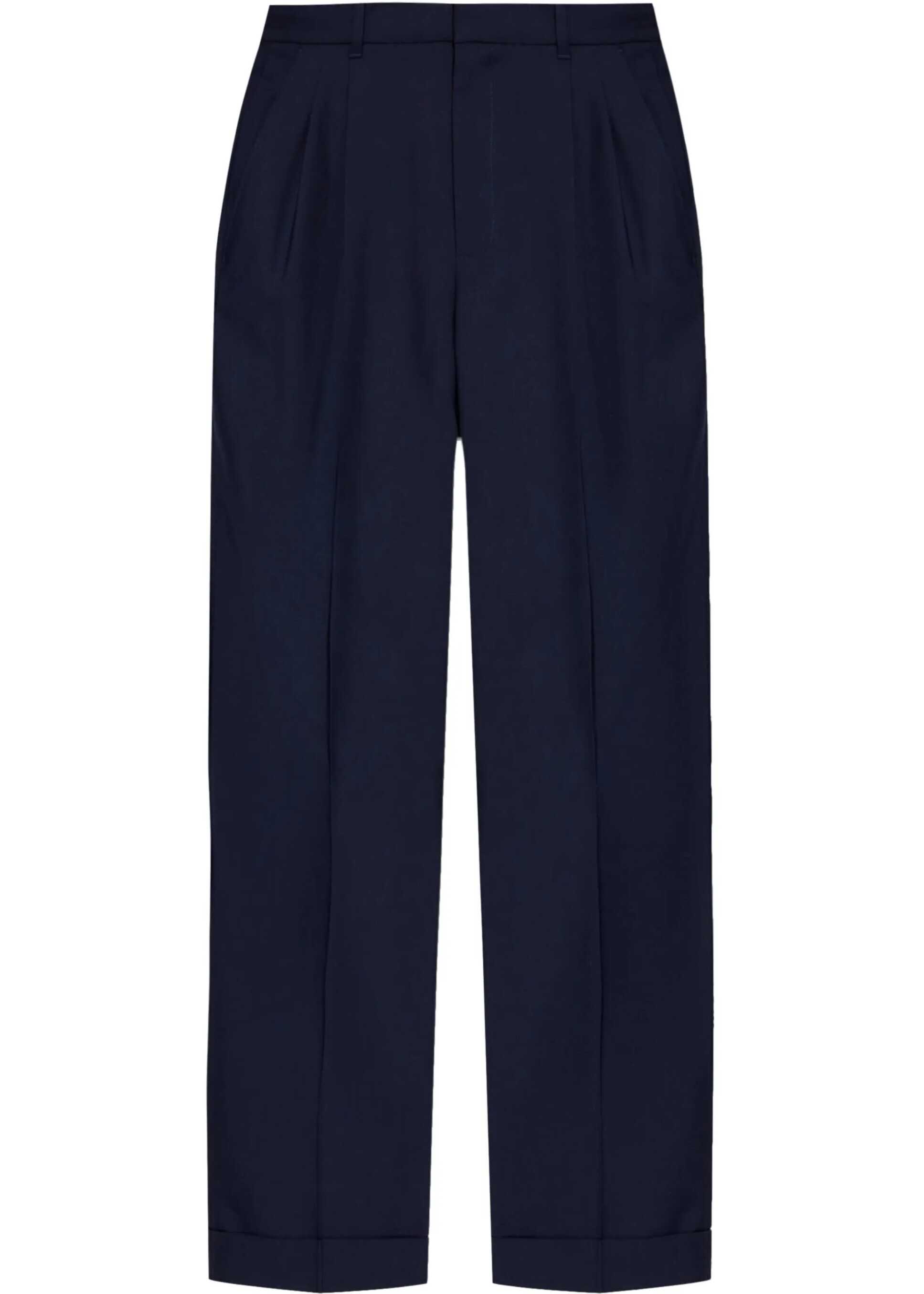 Tailored blue wool trousers. They feature a hook, button, and zip closure, front pleats, two side pockets, two welt back pockets, belt loops, and slim legs. Regular fit.