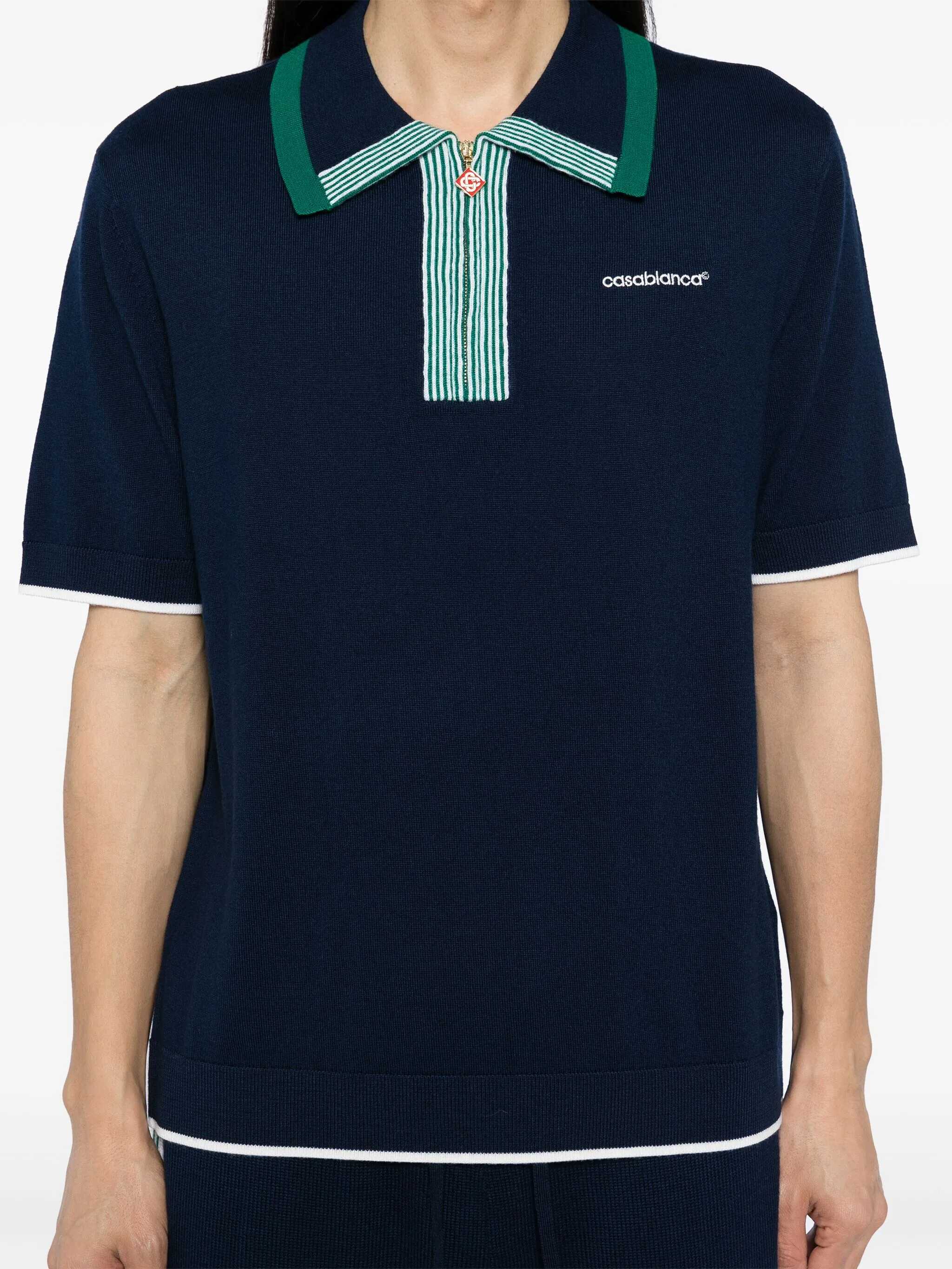 Short-sleeved tennis polo shirt in navy blue wool knit. It features a pointed collar with a dark green trim, green and white striped placket with a zip and a diamond-shaped zipper pull with Monogram, white piped cuffs and hem, and ribbed collar, cuffs, and hem. Classic fit.