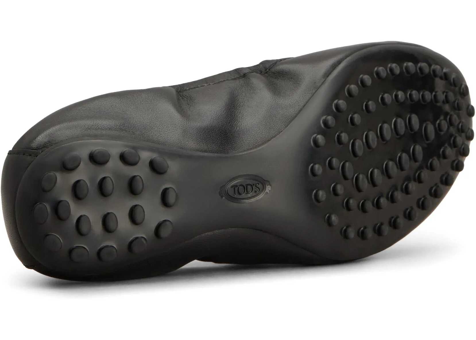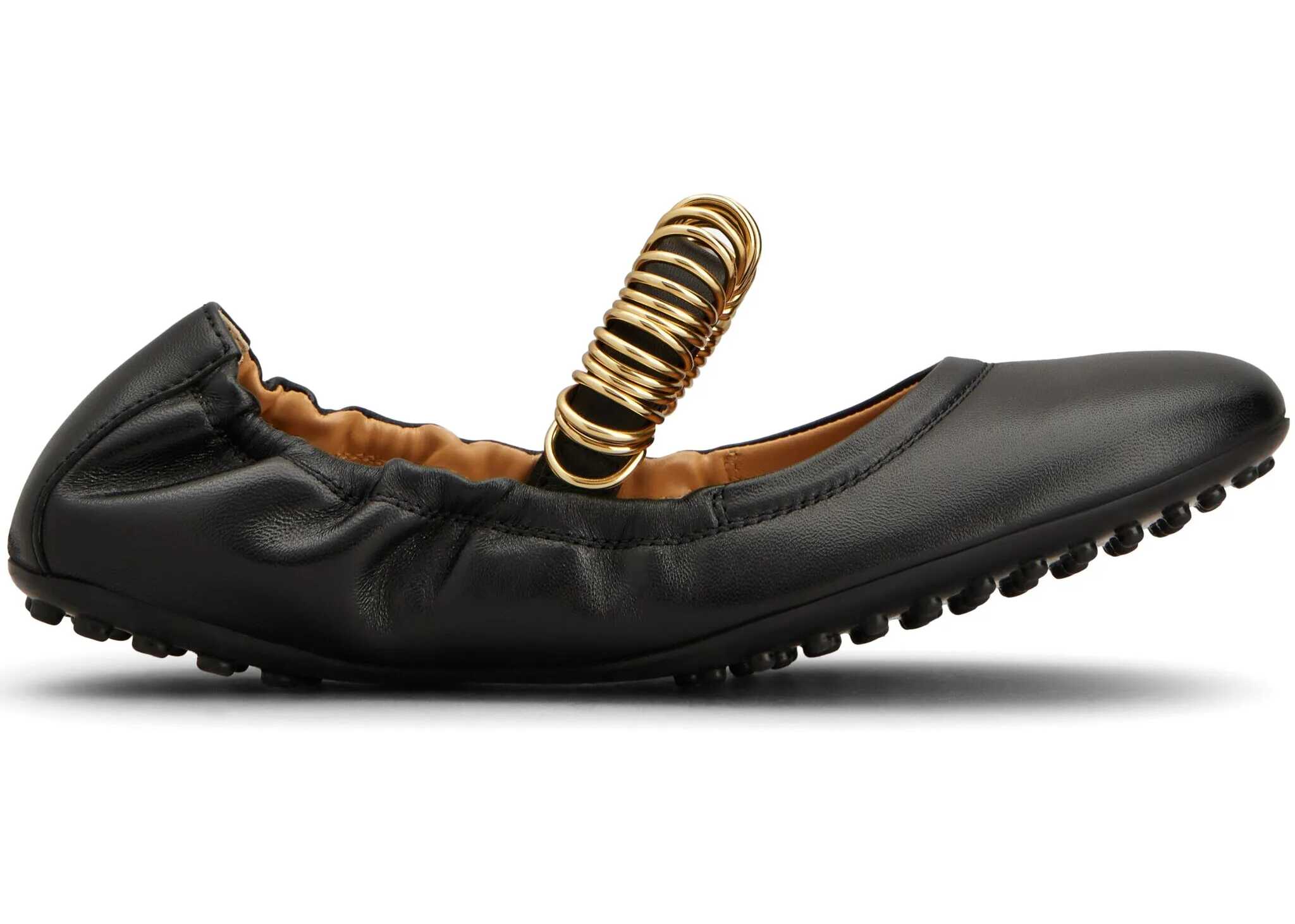 Black leather ballet flats with an elastic trim. They feature a round toe, a top strap with gold-tone metal eyelets, and a rubber sole with rubber studs. Dust bag included. Any leather imperfections are not to be considered manufacturing defects, but a peculiarity of the material.