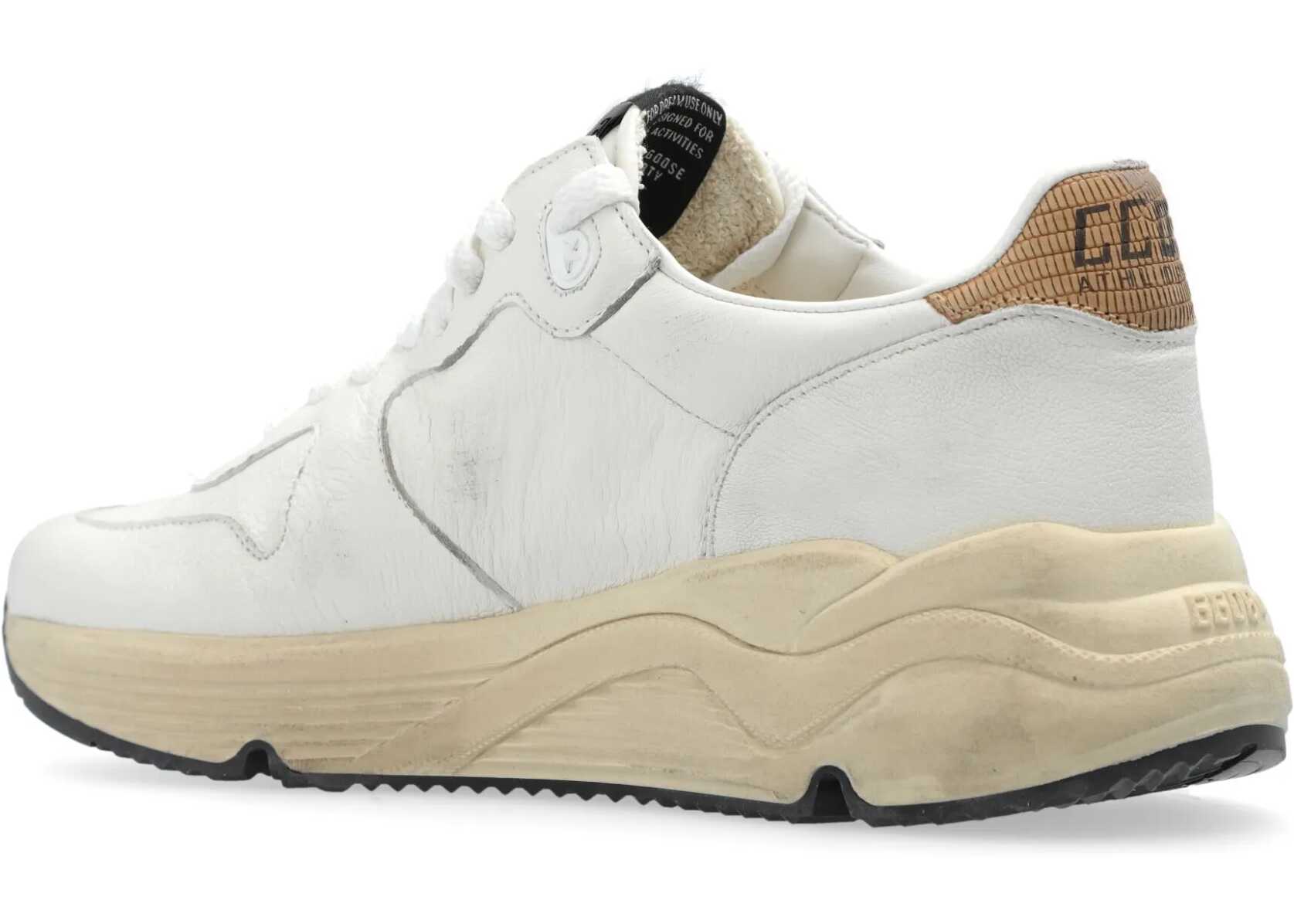 Running Sole sneakers in white nappa leather with a vintage treatment. They feature a round toe, lace-up closure, a golden leather star on one side, a logo label on the tongue, a beige faux snake leather heel tab with logo, and a rubber sole. Dust bag included. Any imperfections in the leather should not be considered manufacturing defects but rather a characteristic of the material.