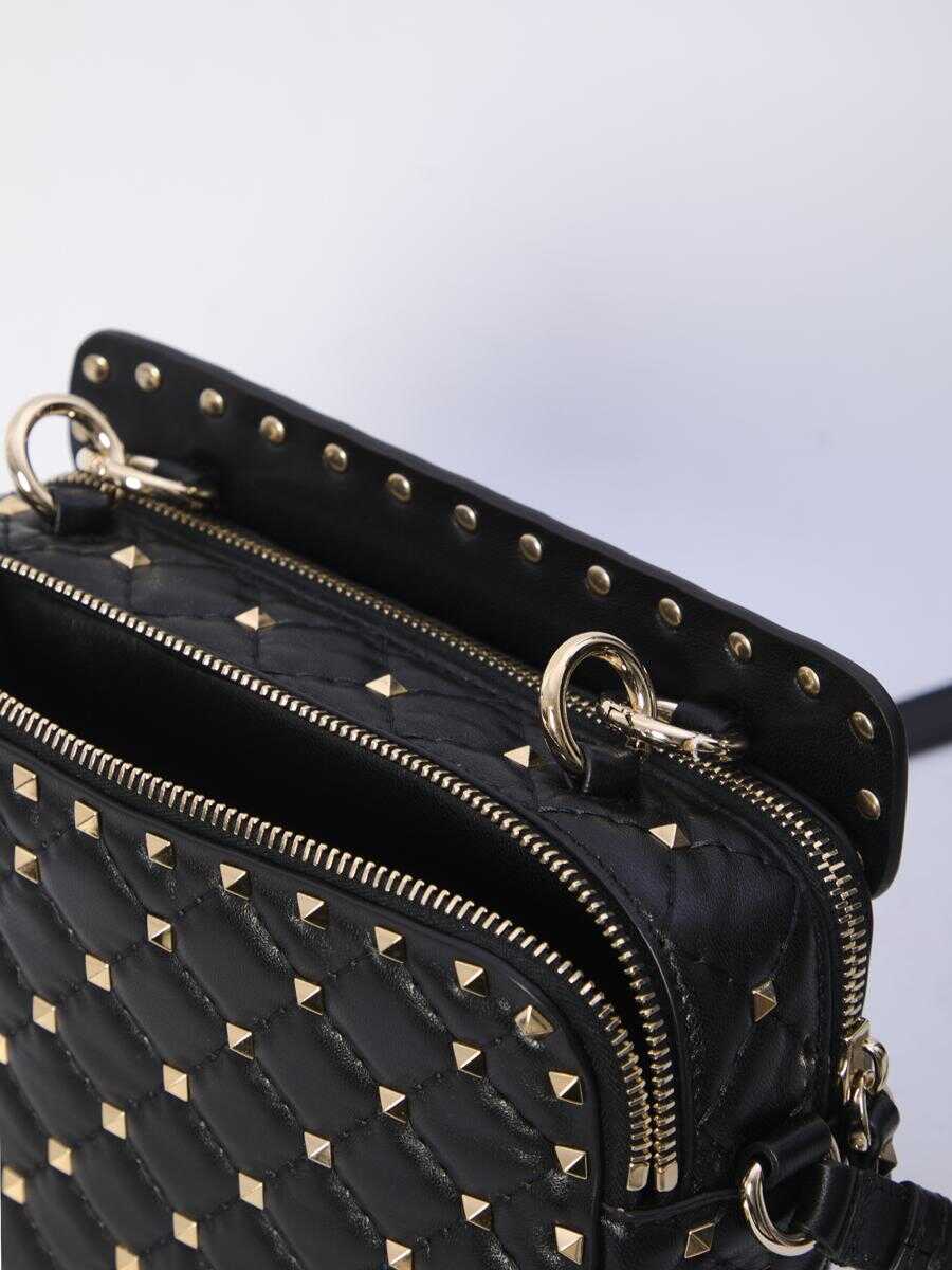 Rockstud crossbody bag in black lambskin leather with a quilted diamond pattern and all-over gold-finish Rockstud embellishments. It features a removable black leather top handle with Rockstud details, an adjustable smooth leather strap, two main compartments with zip closures, and three internal card slots. Dust bag included. Any imperfections in the leather should not be considered manufacturing defects but rather a characteristic of the material.