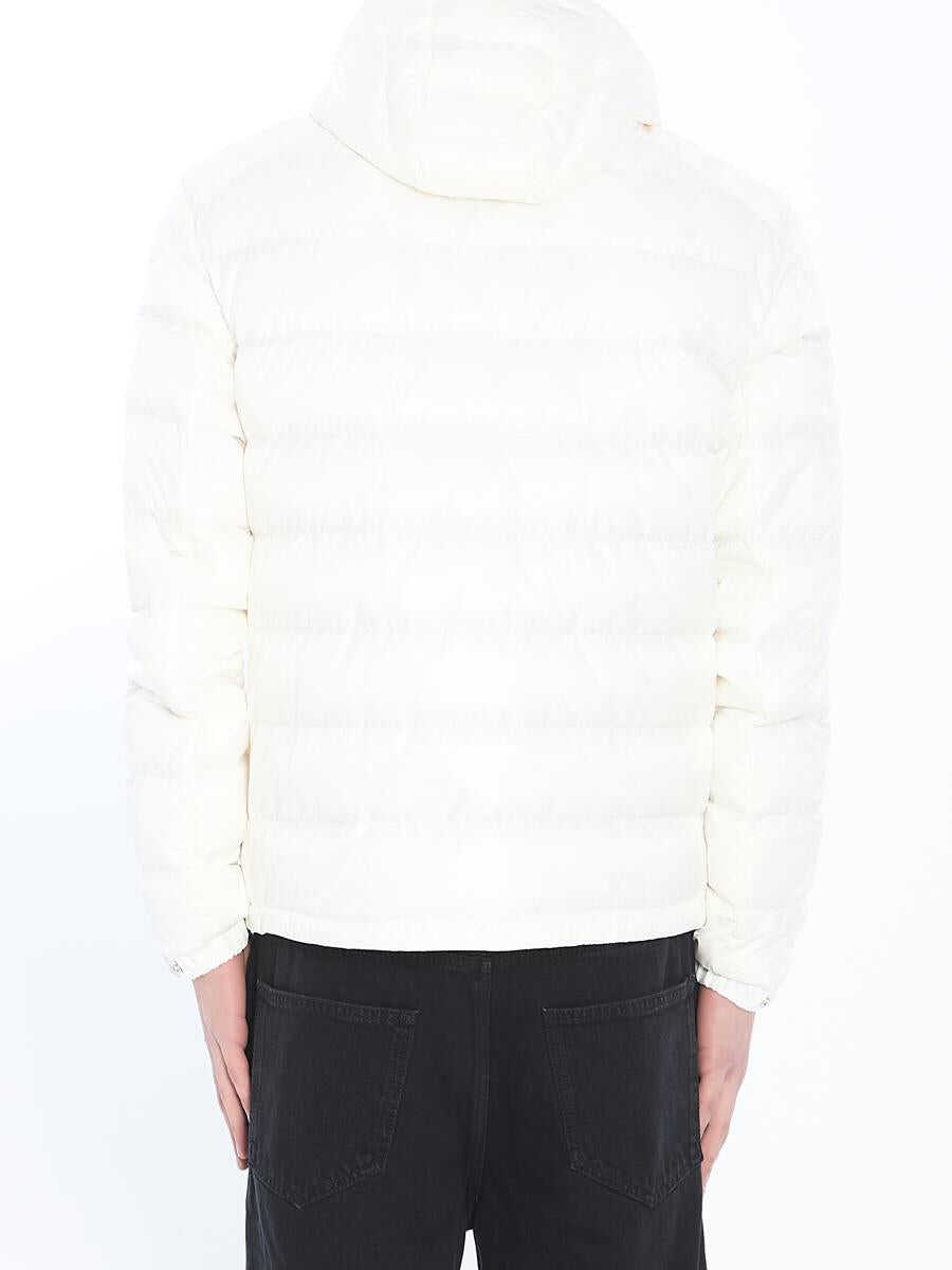 White micro-chic nylon padded Gliere down jacket. It features a hood with a drawstring, zip and snap button closure, two side zip pockets, adjustable elastic cuffs with snap buttons, a Moncler logo patch on the left sleeve, and a drawstring at the bottom of the jacket. Regular fit.