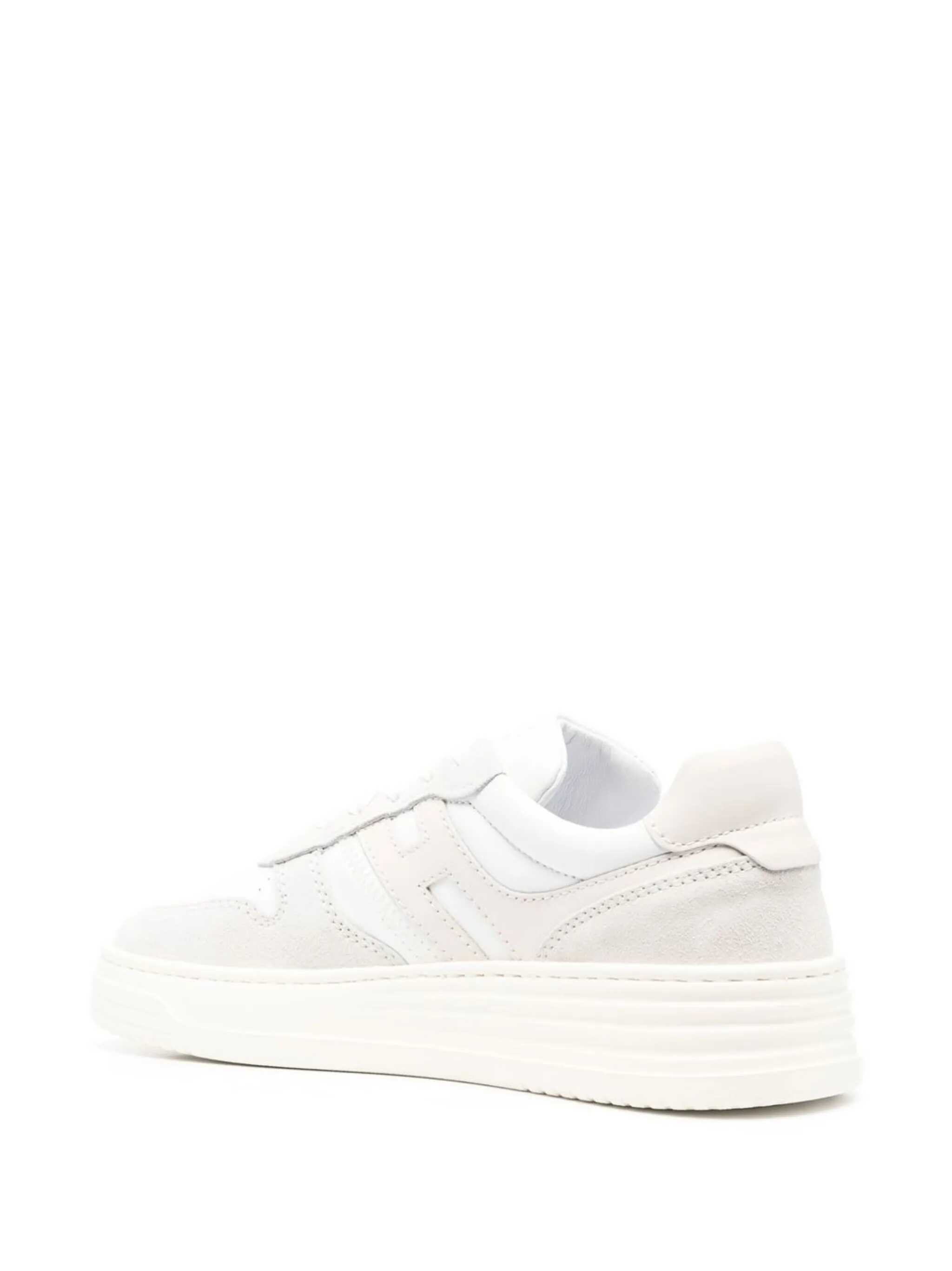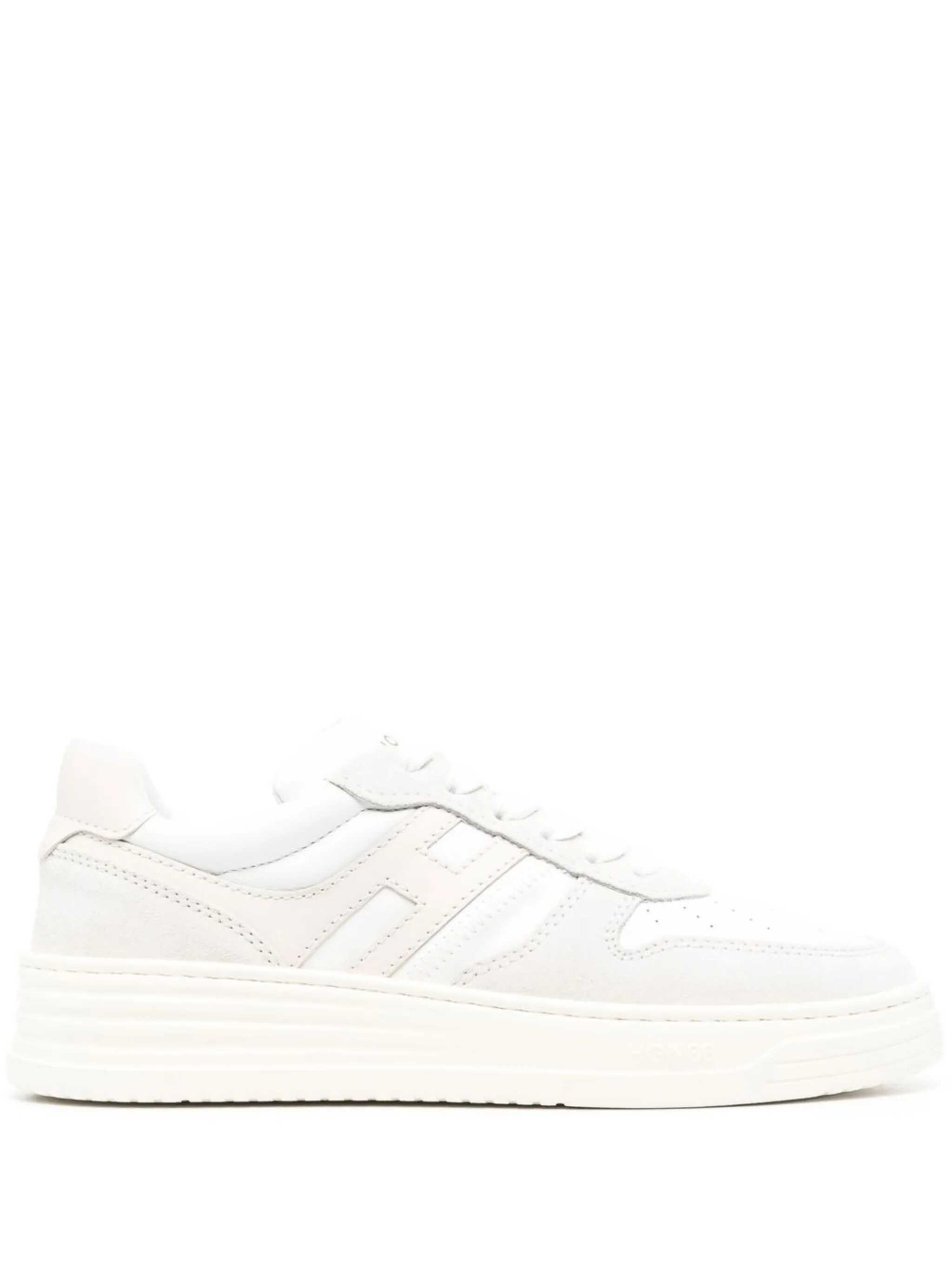 Hogan H630 sneakers in textured white leather. They feature an elongated "H" wrapping around the heel on the sides, a stitched detail on the sides, a perforated toe, a tongue with a logo, a memory foam insole, and a rubber sole. A dust bag is included. Additional laces are also included. Any imperfections in the leather should not be considered manufacturing defects, but rather a characteristic of the material.