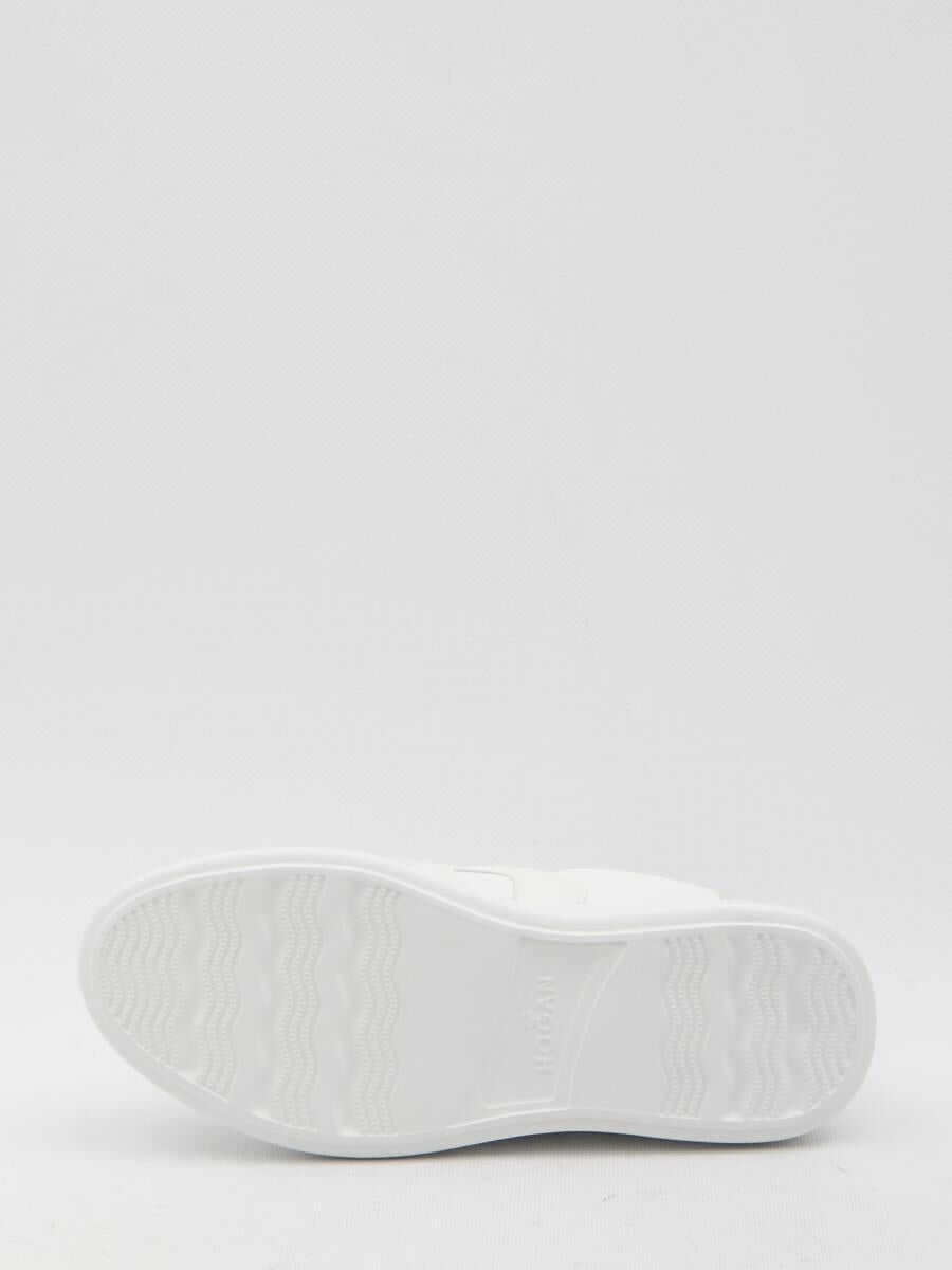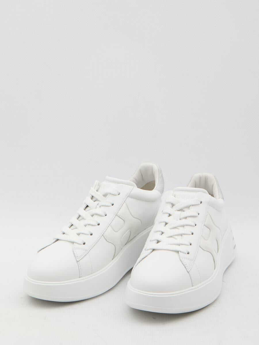 Hogan Rebel sneakers in white leather with a silver glitter fabric heel tab and silver details. They feature a lace-up closure, a wavy side "H" in patent leather, a logo on the tongue, a memory foam insole, and a rubber sole with silver grooves at the back. A dust bag is included. Additional laces are also included. Any imperfections in the leather should not be considered manufacturing defects, but rather a characteristic of the material.