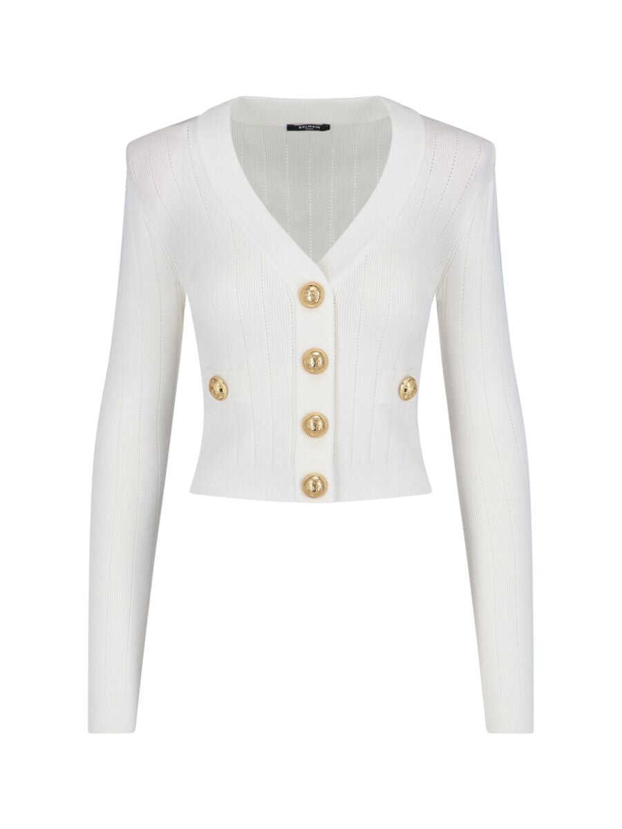 Crop cardigan, front closure with logo buttons, front pockets with buttons, long sleeves