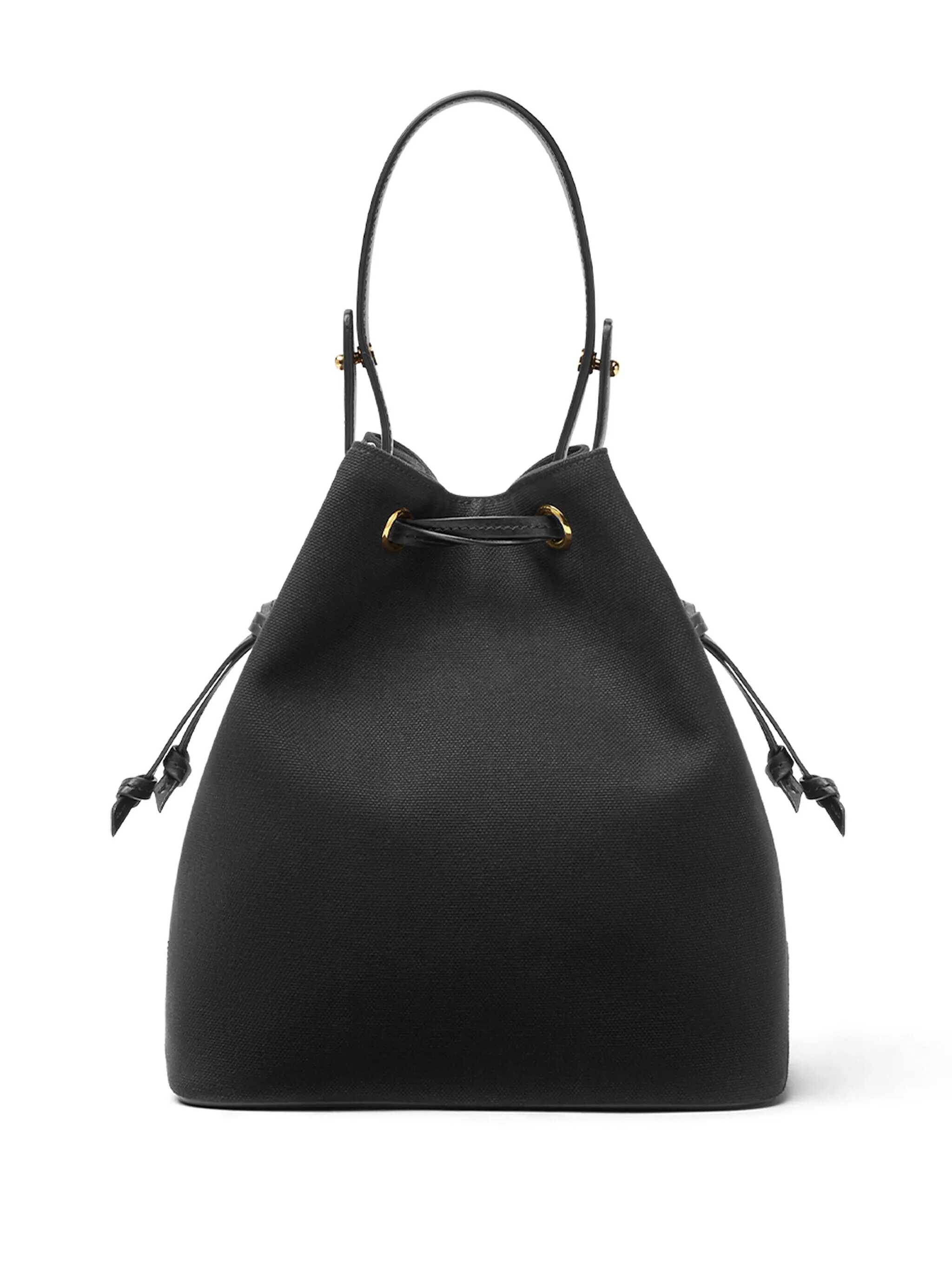 La Medusa' canvas bucket bag with leather logo and front metal Medusa detail, adjustable drawstring closure, removable leather handle, adjustable and removable leather shoulder strap
