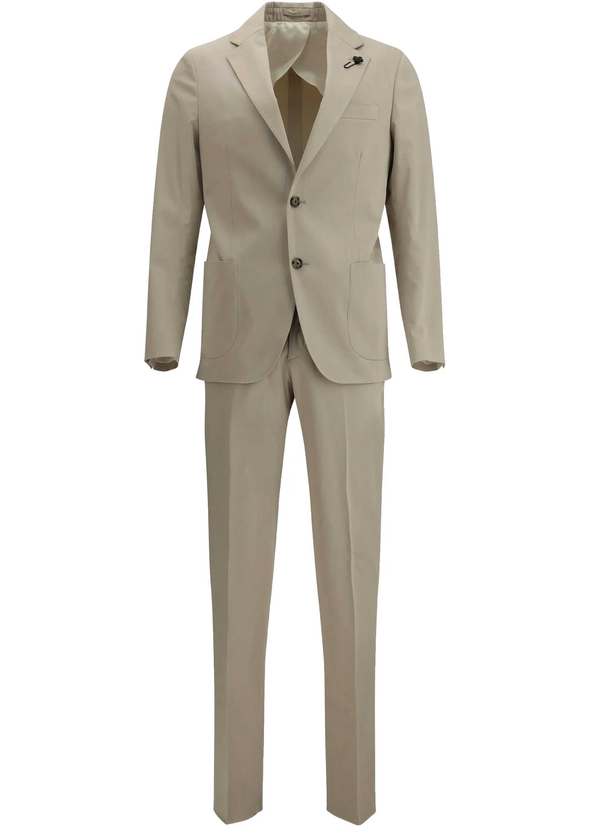 Lardini's single-breasted Suit is the epitome of contemporary sartorial elegance. With a front button closure and classic lapels, the jacket features a refined and versatile silhouette suitable for a variety of formal occasions. The two patch pockets on the front and the breast pocket add practical yet discreet details, while the iconic flower brooch appliqué on the lapel gives a distinctive and classy touch, a symbol of the brand's high-quality craftsmanship. Straight pants, with two side welt pockets and a front zipper-and-button closure, complete the look with a clean, modern fit. Waistband loops offer the option to further customize the fit. A perfect suit for those looking for an elegant suit, but with unique details that enhance its sophistication and contemporary style.