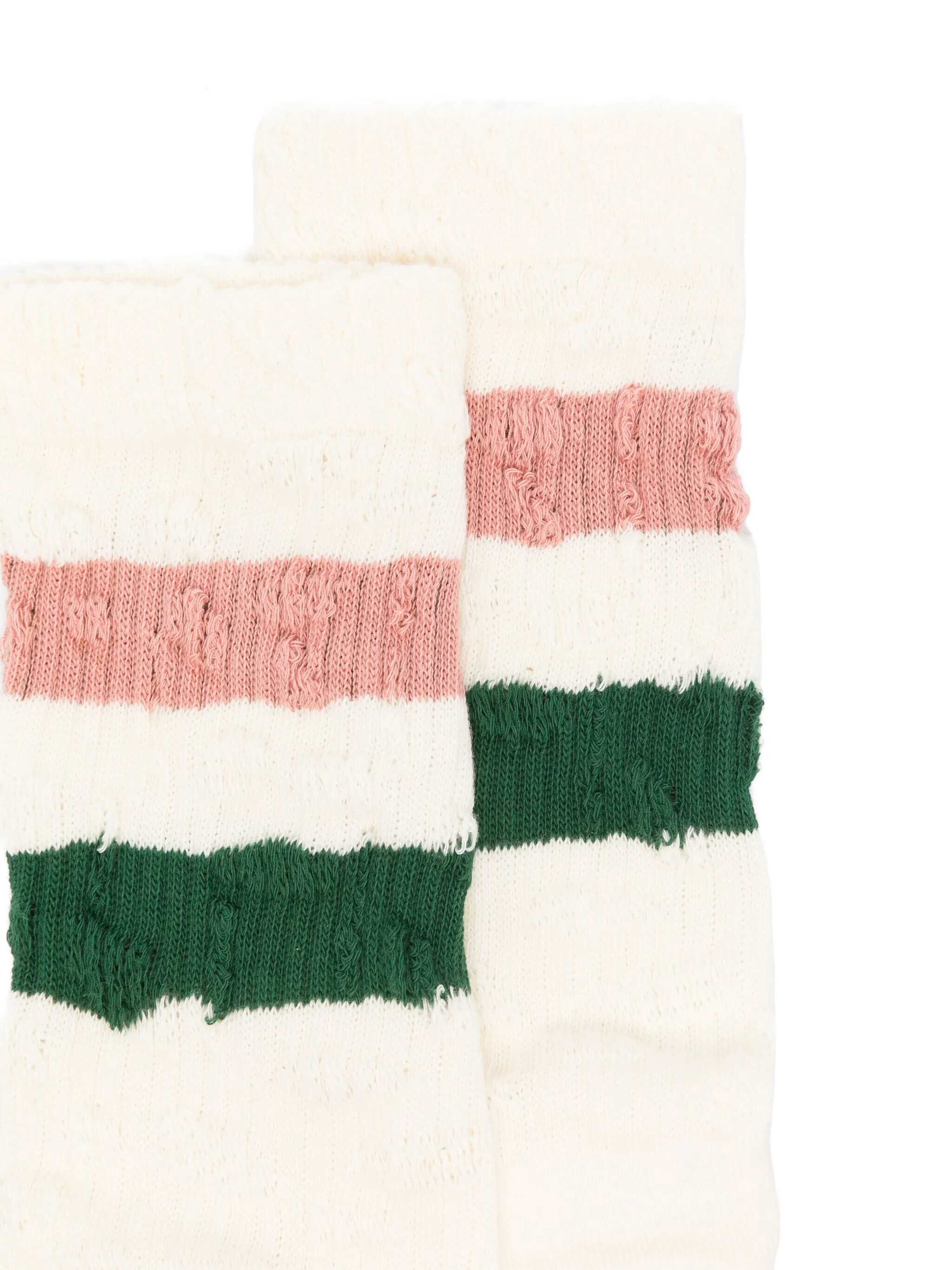 A vintage feel and craftsmanship are some of our distinctive components: these socks in a worn-white version feature distressed details on the leg and pink and green stripes.