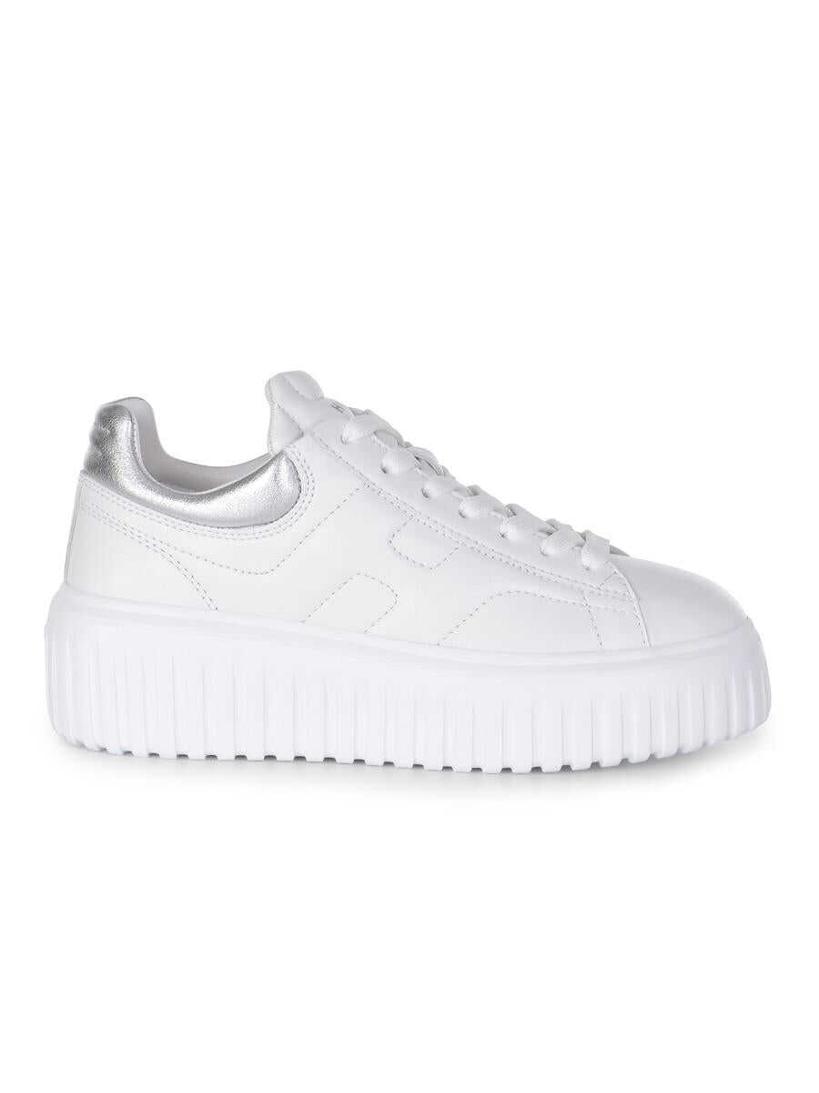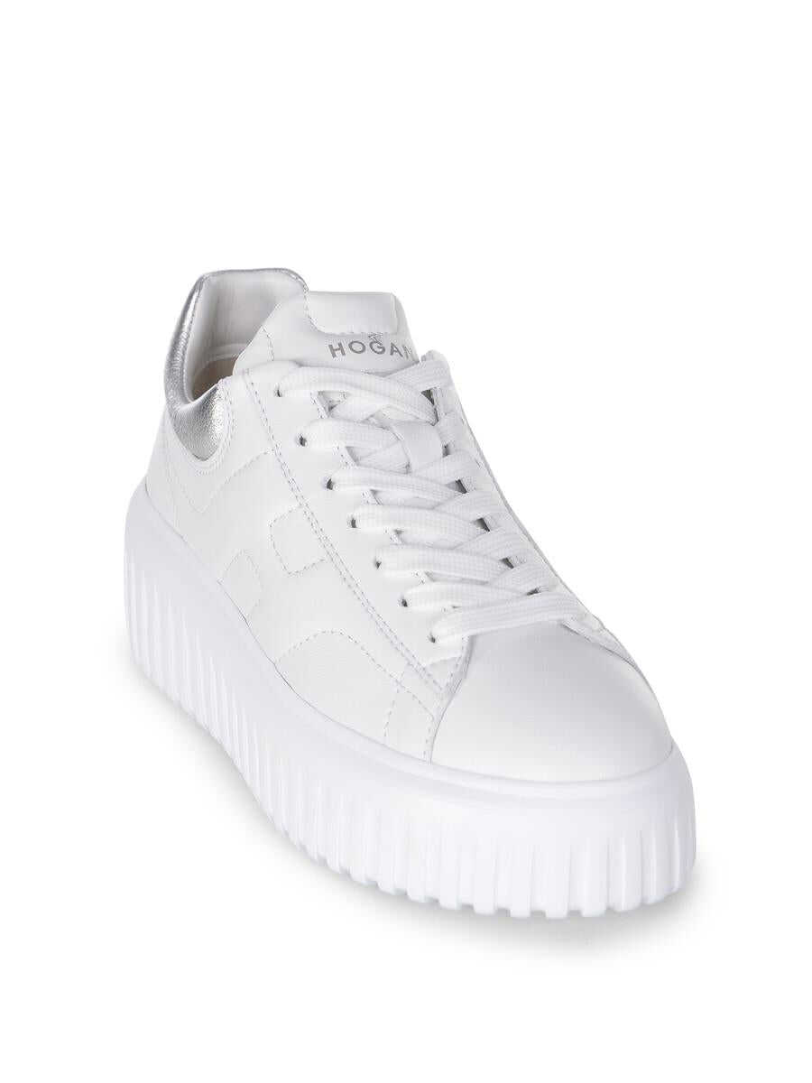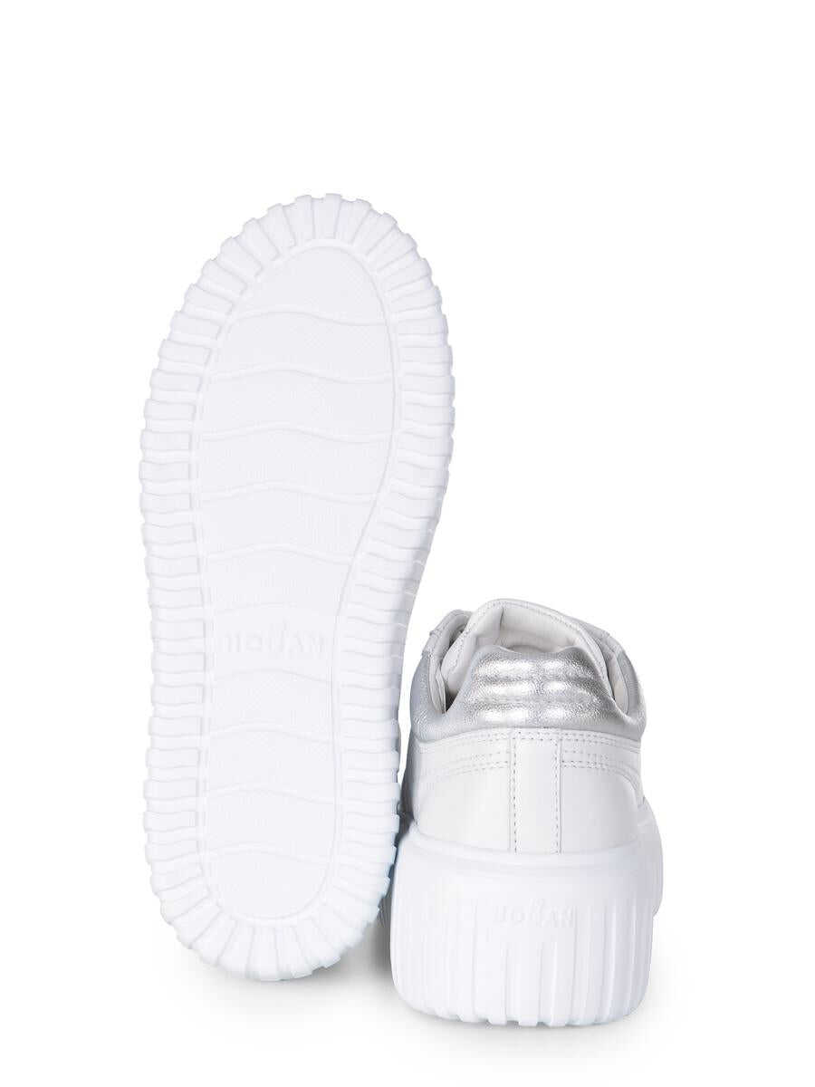 Hogan "H-Stripes" sneakers made of Ivory leather. Lace-up. Back in silver leather. 8 mm memory foam insole 50 mm sole in light rubber with stripes pattern. Total height 5.8 cm
