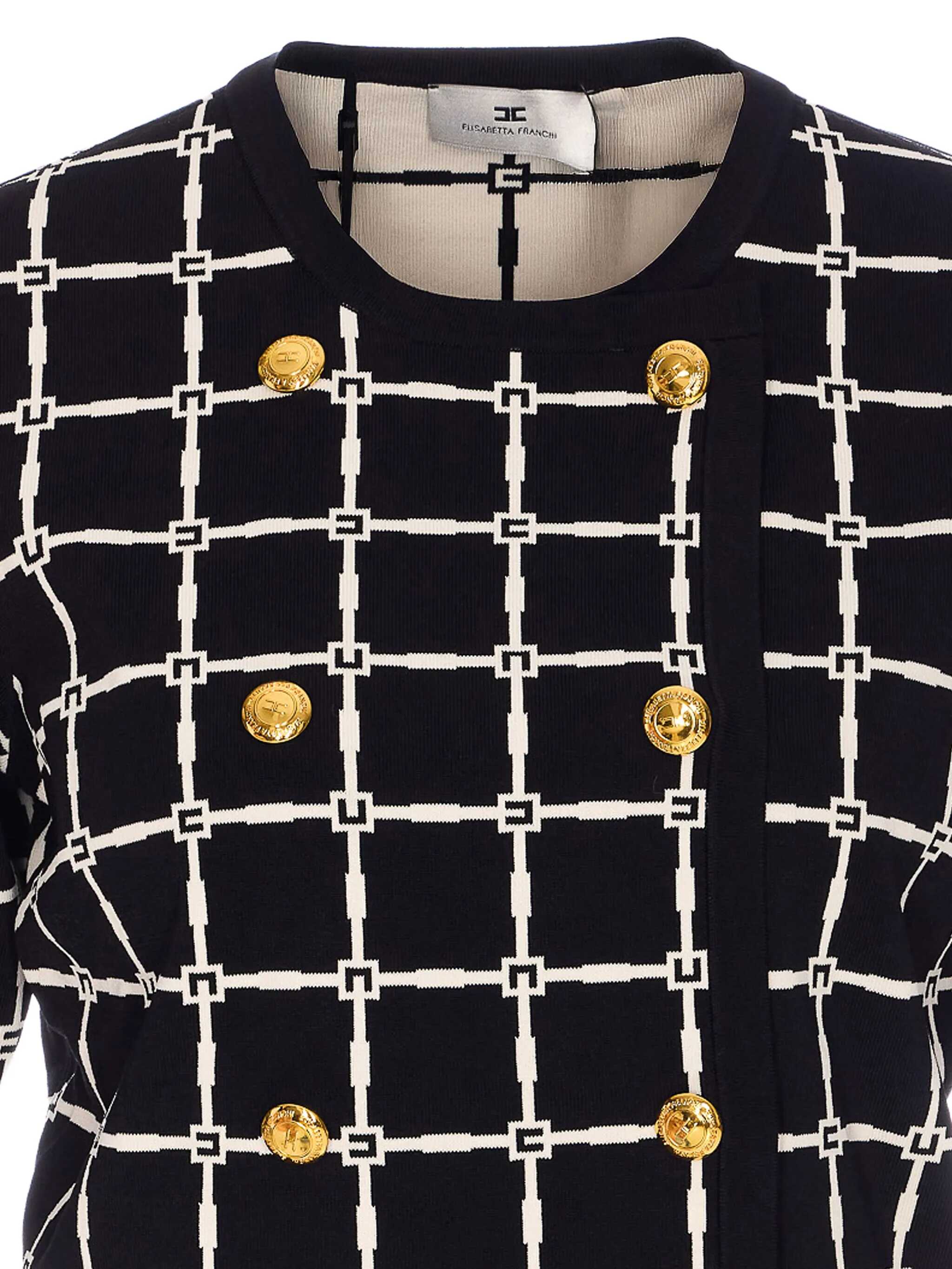 Jacquard cardigan with a crew neck and ¾ sleeves, featuring a logo motif that runs the length. The double-breasted closure is embellished with gold metal logo buttons, which add a touch of light to the garment. Regular fit. An elegant and sophisticated garment perfect for any occasion.