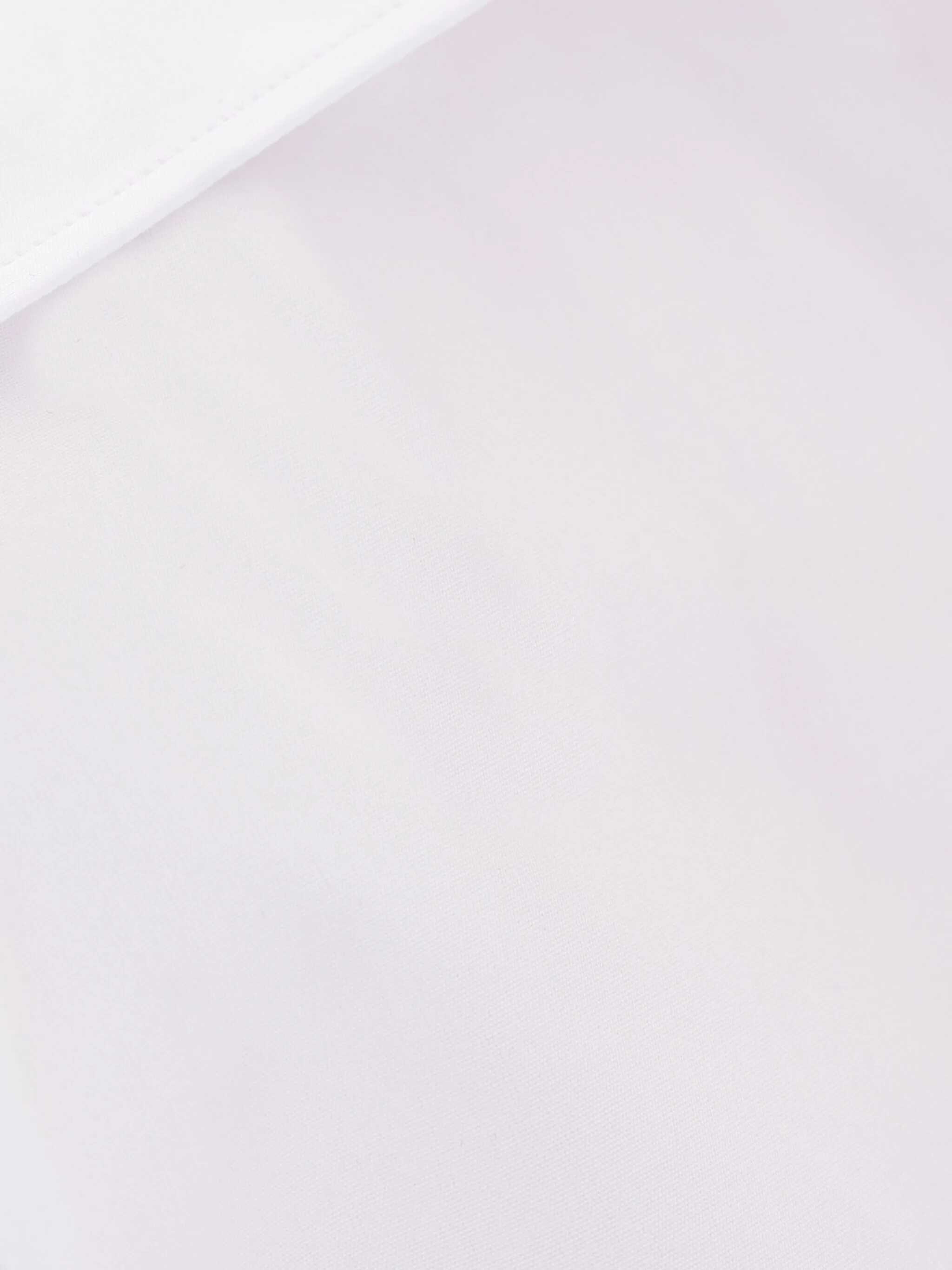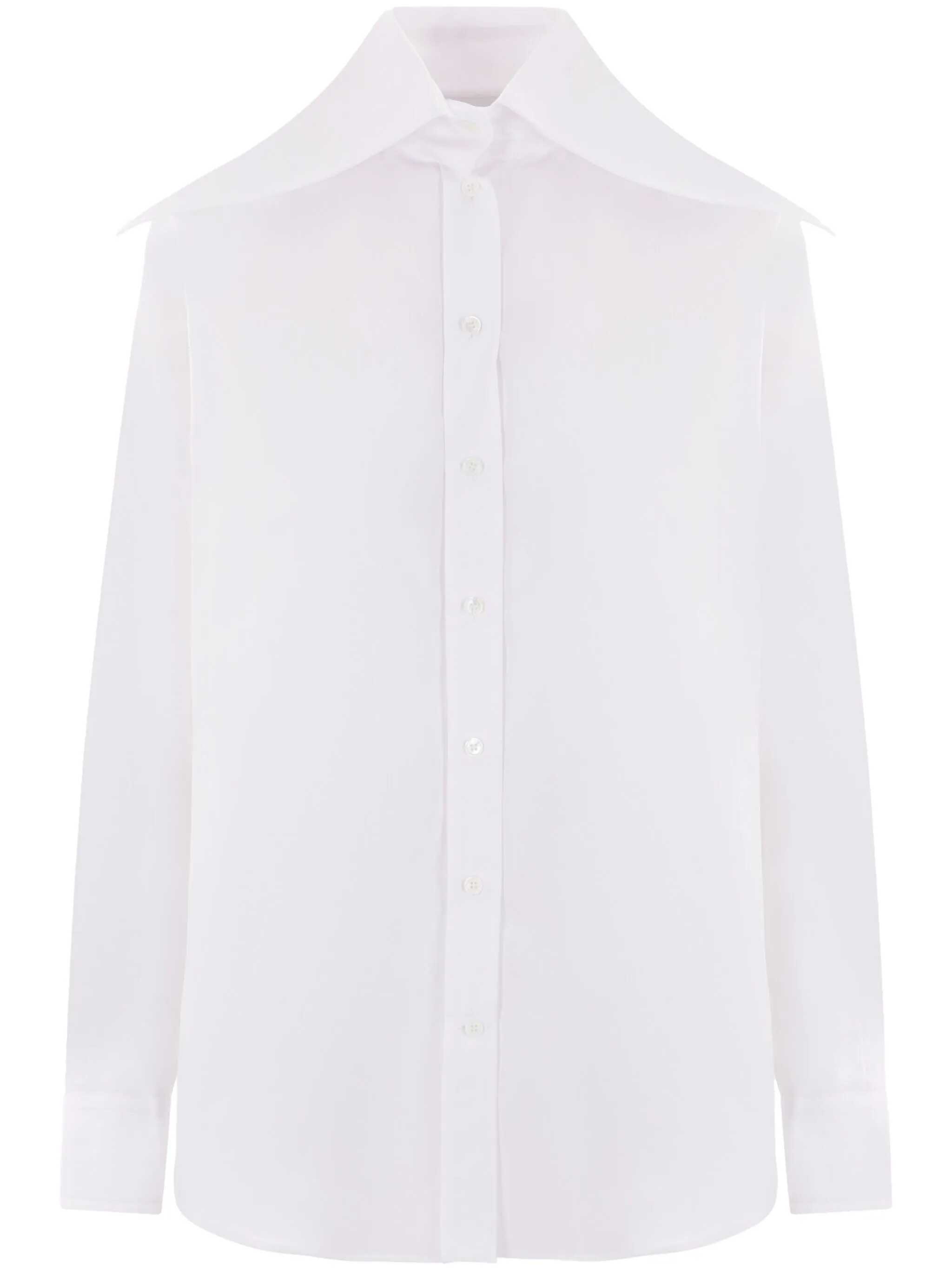 Alexander McQueen shirt crafted from white cotton poplin. Featuring an oversized pointed collar, front button closure, long sleeves with buttoned cuffs, and a rounded hem.