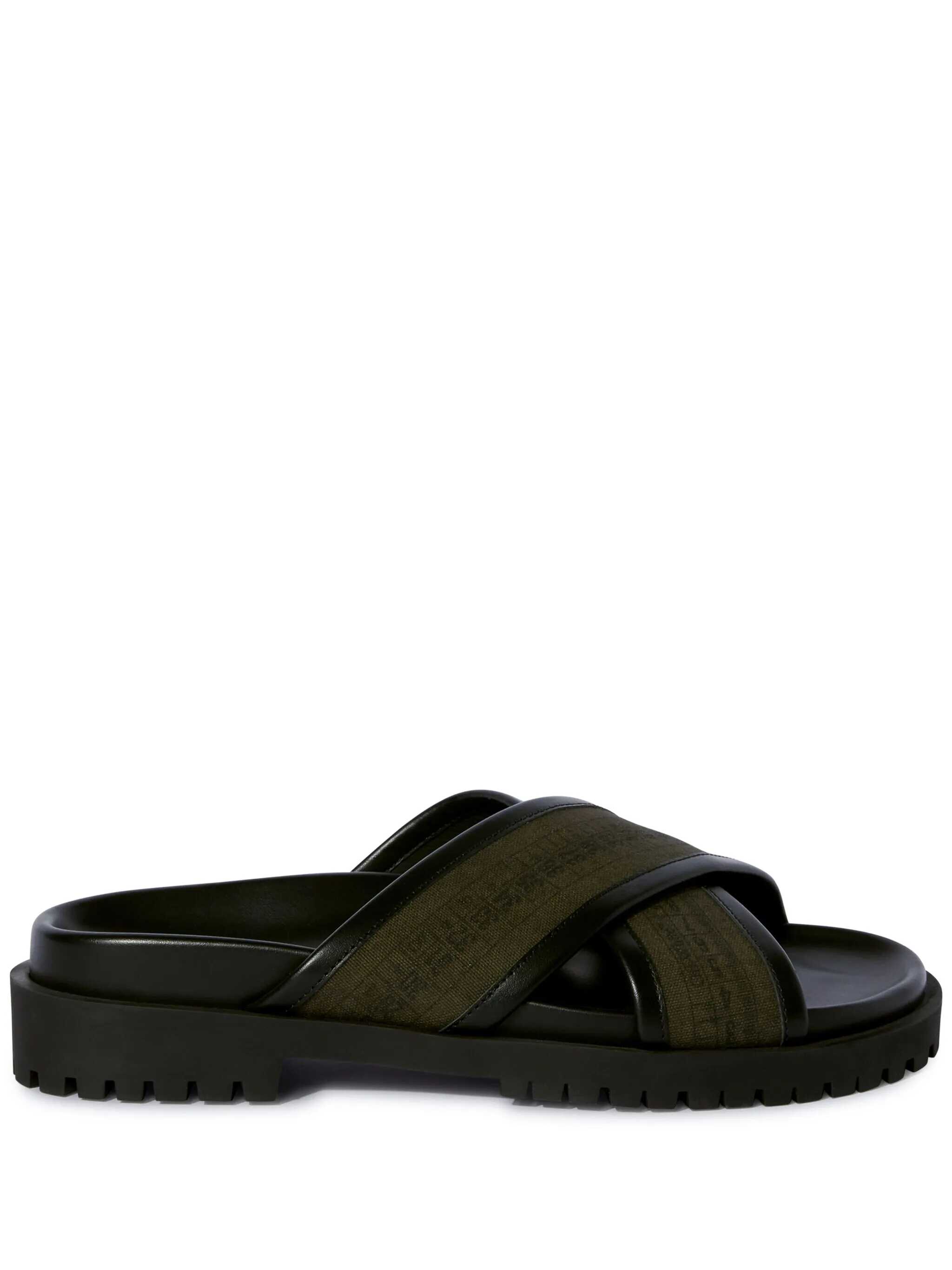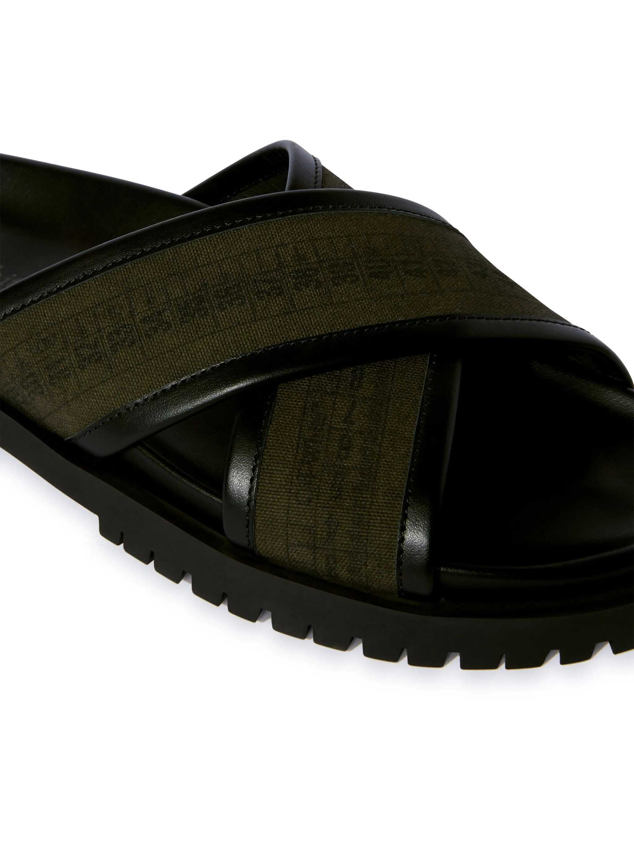 Sandals with crossover design. Rubber sole. Cotton bands at front feature a dressmaker's ruler-style pattern. Heel height:3 Platform height:2