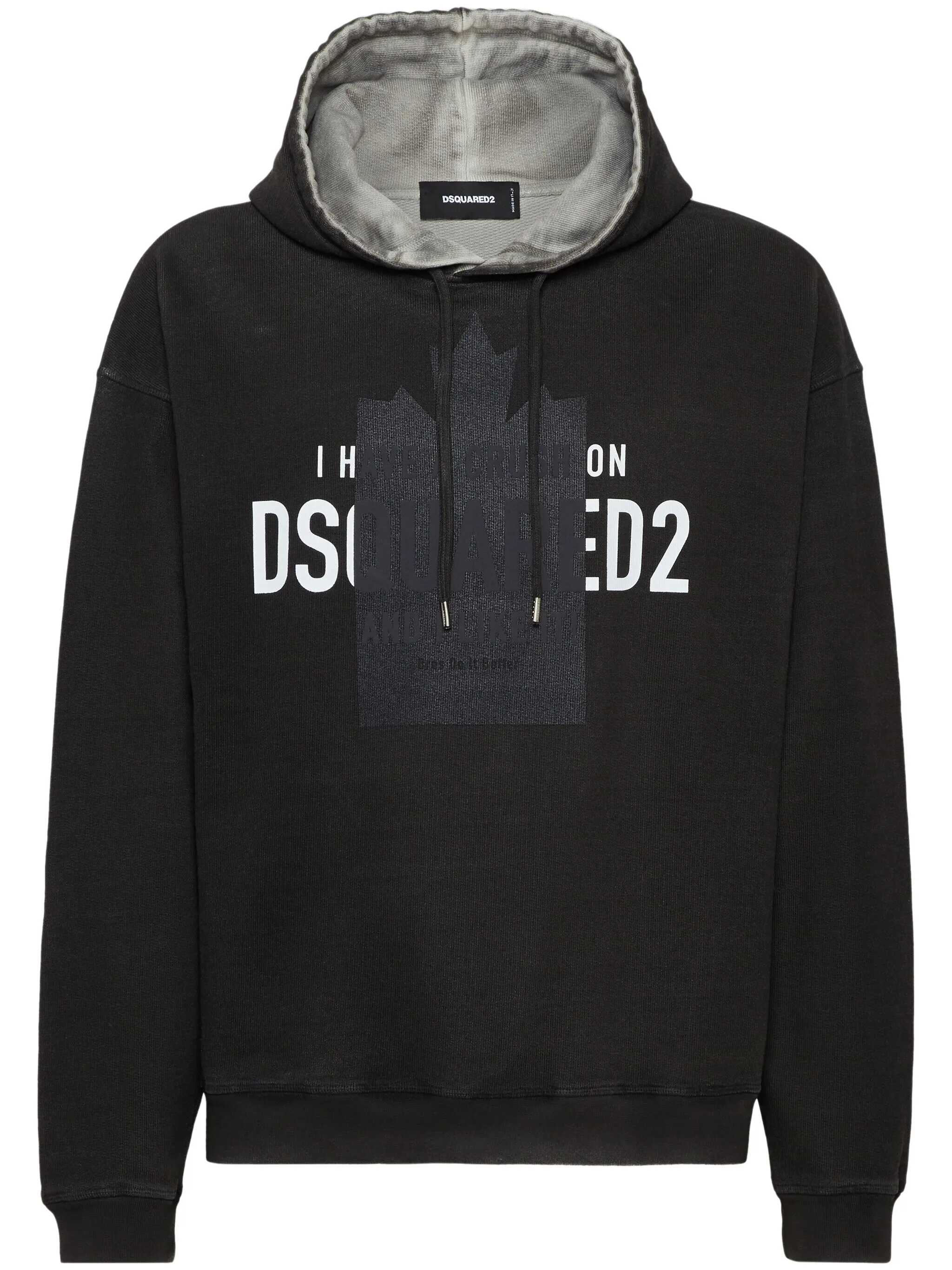 Dsquared2 sweatshirt made of black cotton. Sleeves. Ribbed cuffs. Hood with drawstring. Contrasting print and logo on the front. Contrasting interior. Ribbed bottom.