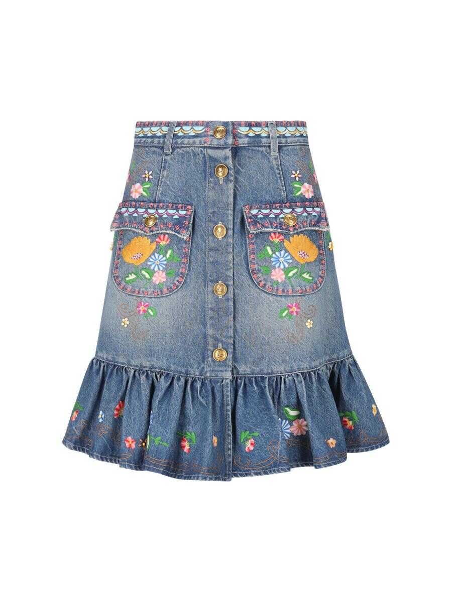 Valentino Garavani midi skirt with floral embroidery, an iconic garment that enhances femininity with couture elegance. The precious workmanship and romantic line make this skirt perfect for ceremonies, special events or sophisticated looks with timeless appeal. - Material: 100% cotton - Color: blue - All over floral embroidery - Front button closure - Made in Italy - Item code: 6B3DD19H94T558