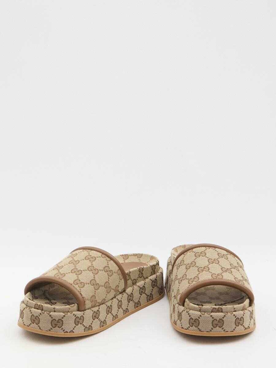 Platform sandals in beige and dark brown Original GG fabric. They feature brown leather trim, a brown leather patch with an embossed logo on the insole, a platform covered in GG fabric, and a rubber sole. Dust bag included. Any imperfections in the leather are not to be considered manufacturing defects but rather a characteristic of the material.