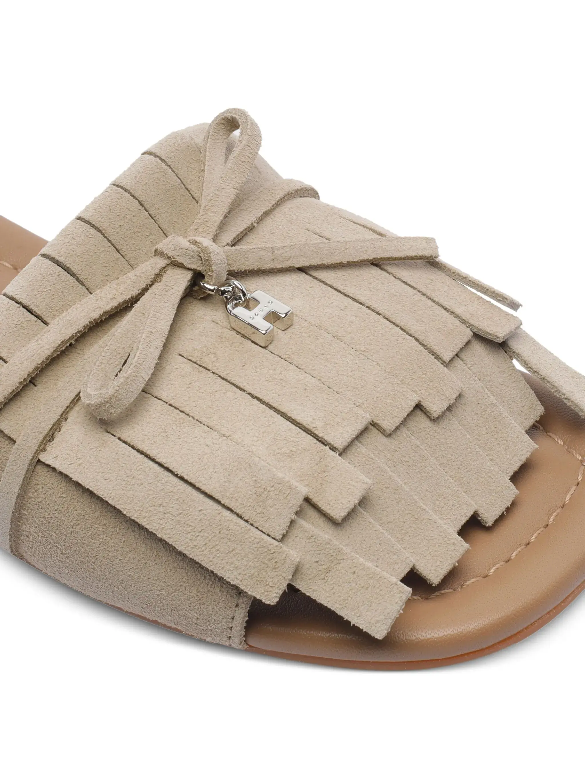 Hogan slippers made of Fango leather. Tan-colored leather interior with engraved logo. Suede upper band with tone-on-tone fringes. Silver logo "H" pendant on the band.