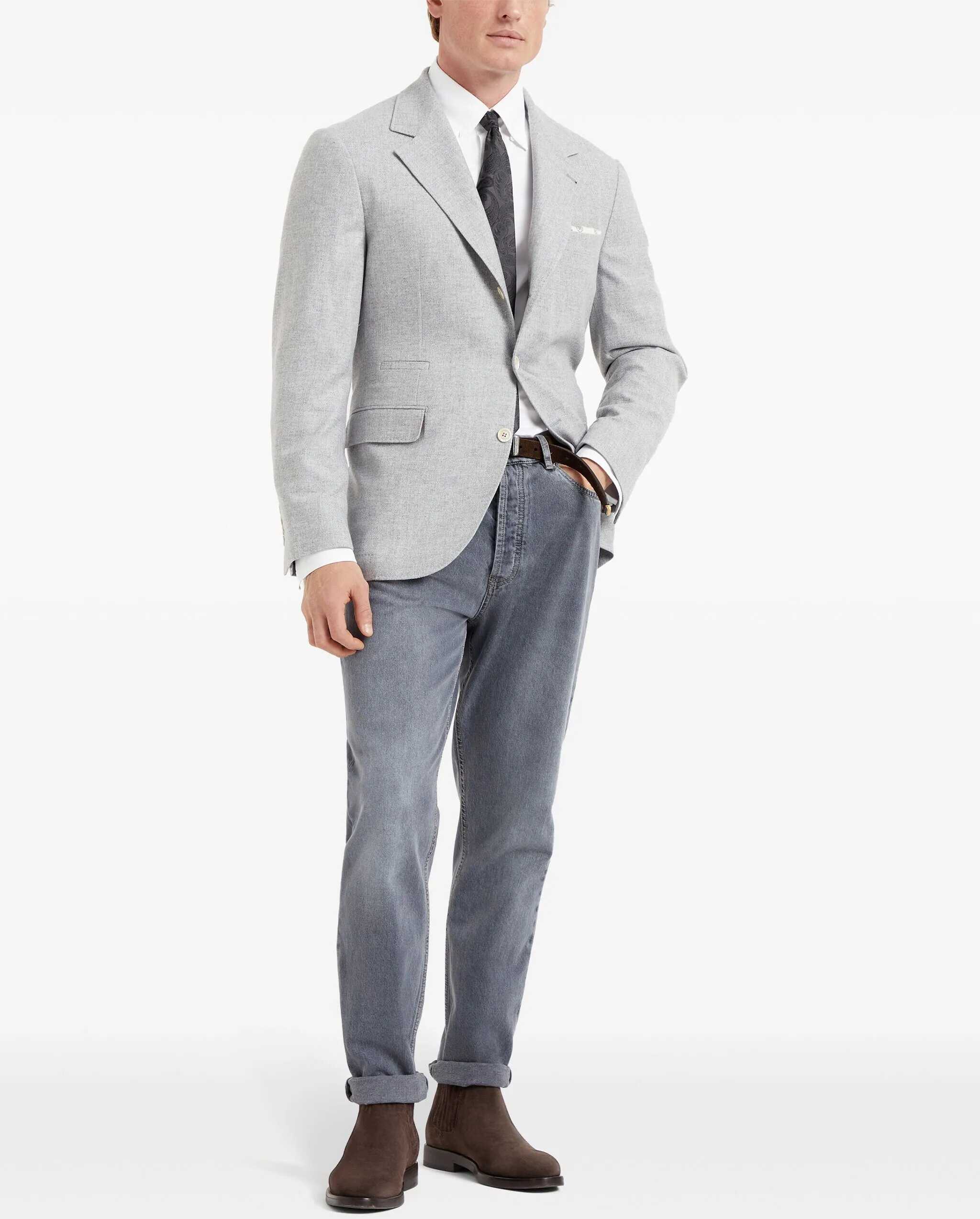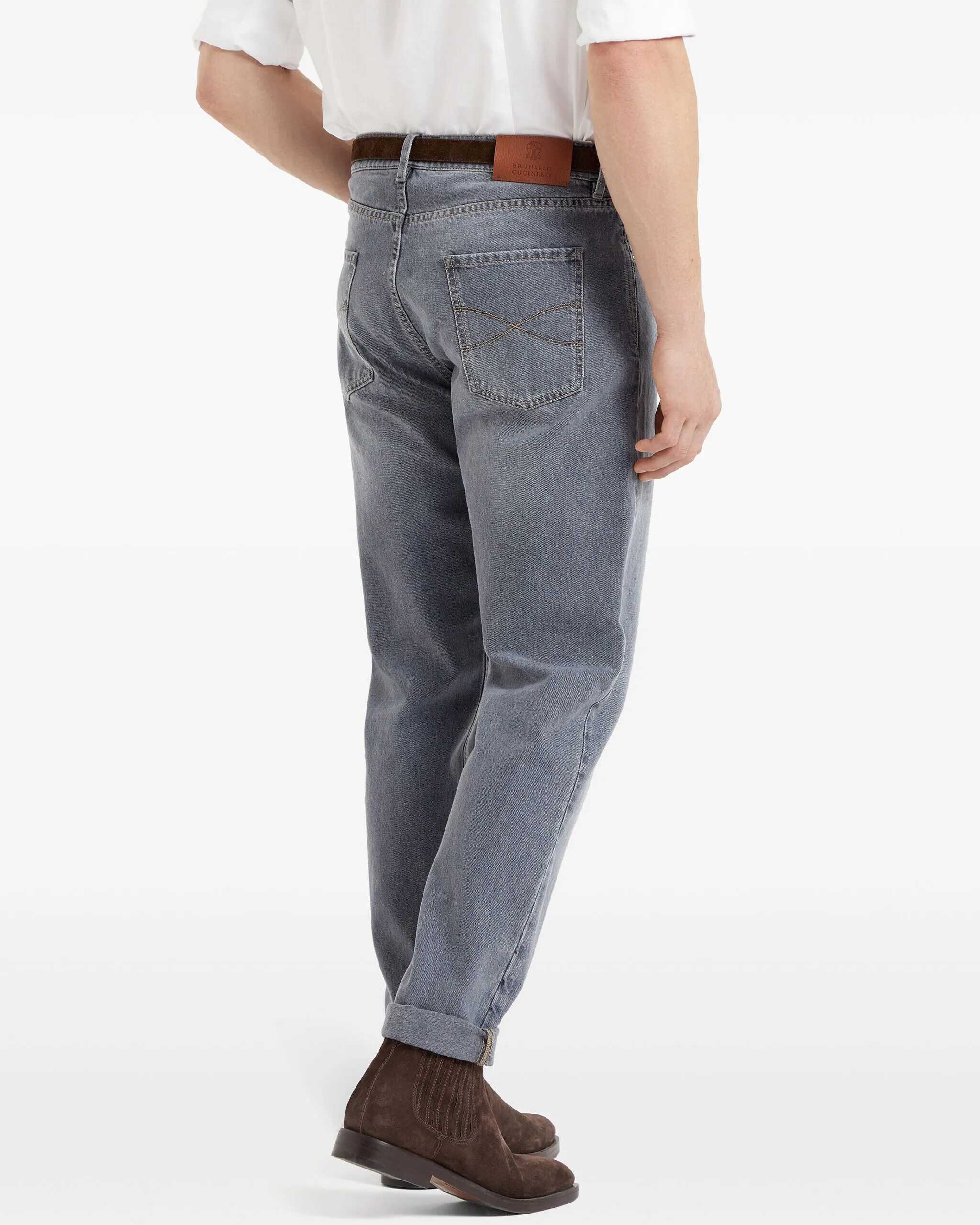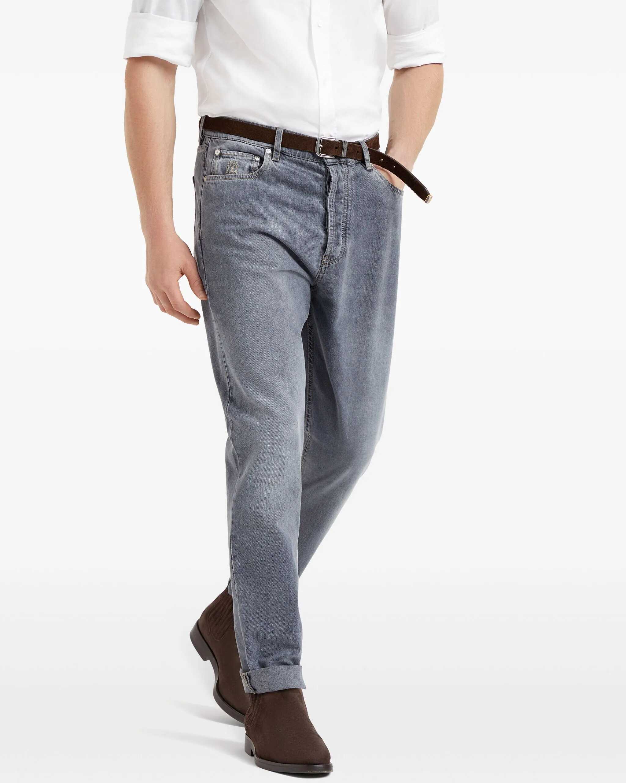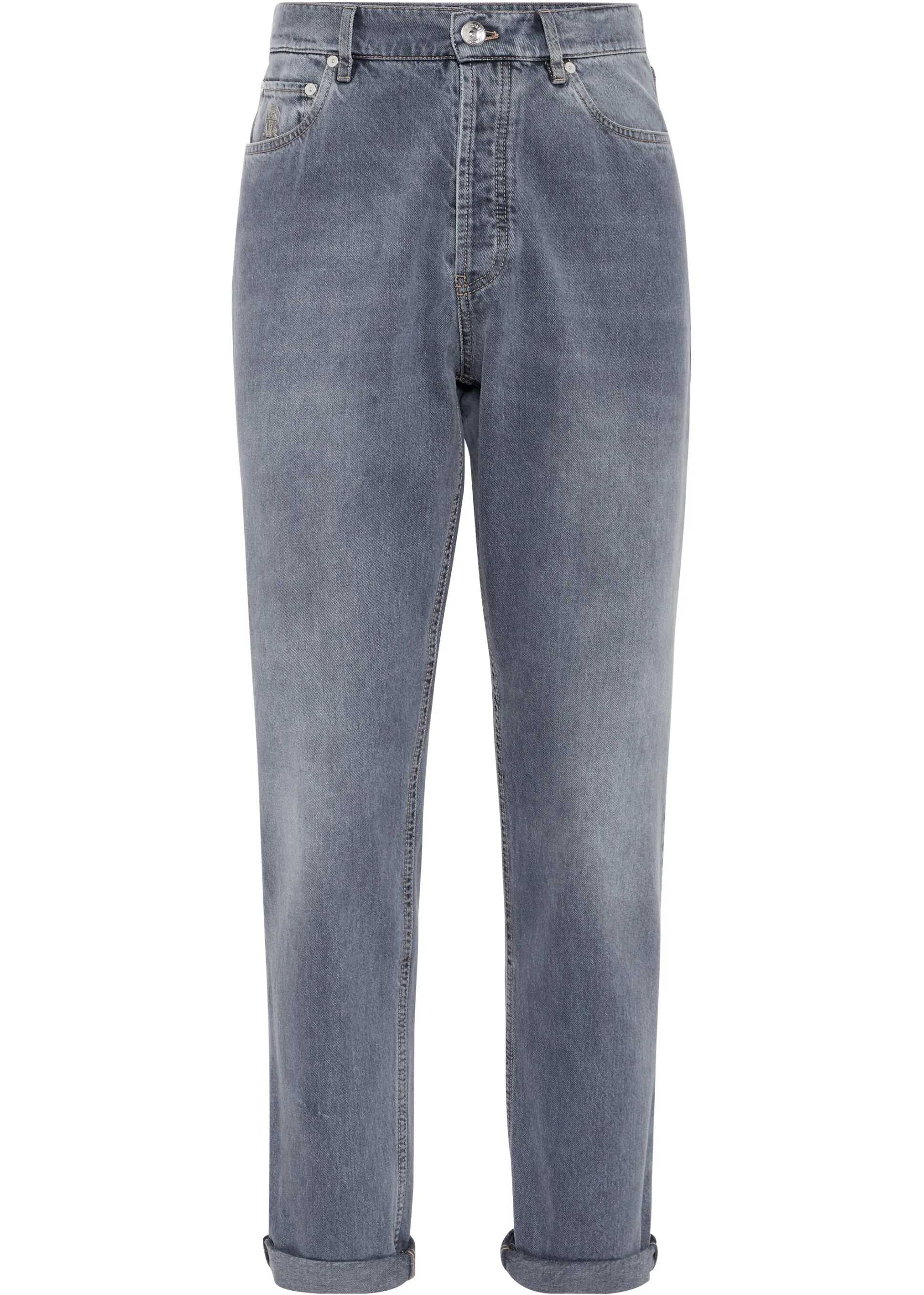 Brunello Cucinelli's five-pocket straight cotton Jeans feature a classic denim design with a front button closure and belt loops on the waistband. The brand's iconic pressure-printed signature leather patch is applied to the back, adding a distinctive, high-quality touch. The turn-up hem gives a tailored detail, completing a sleek and contemporary look. A pair of refined jeans, ideal for a casual-chic look.