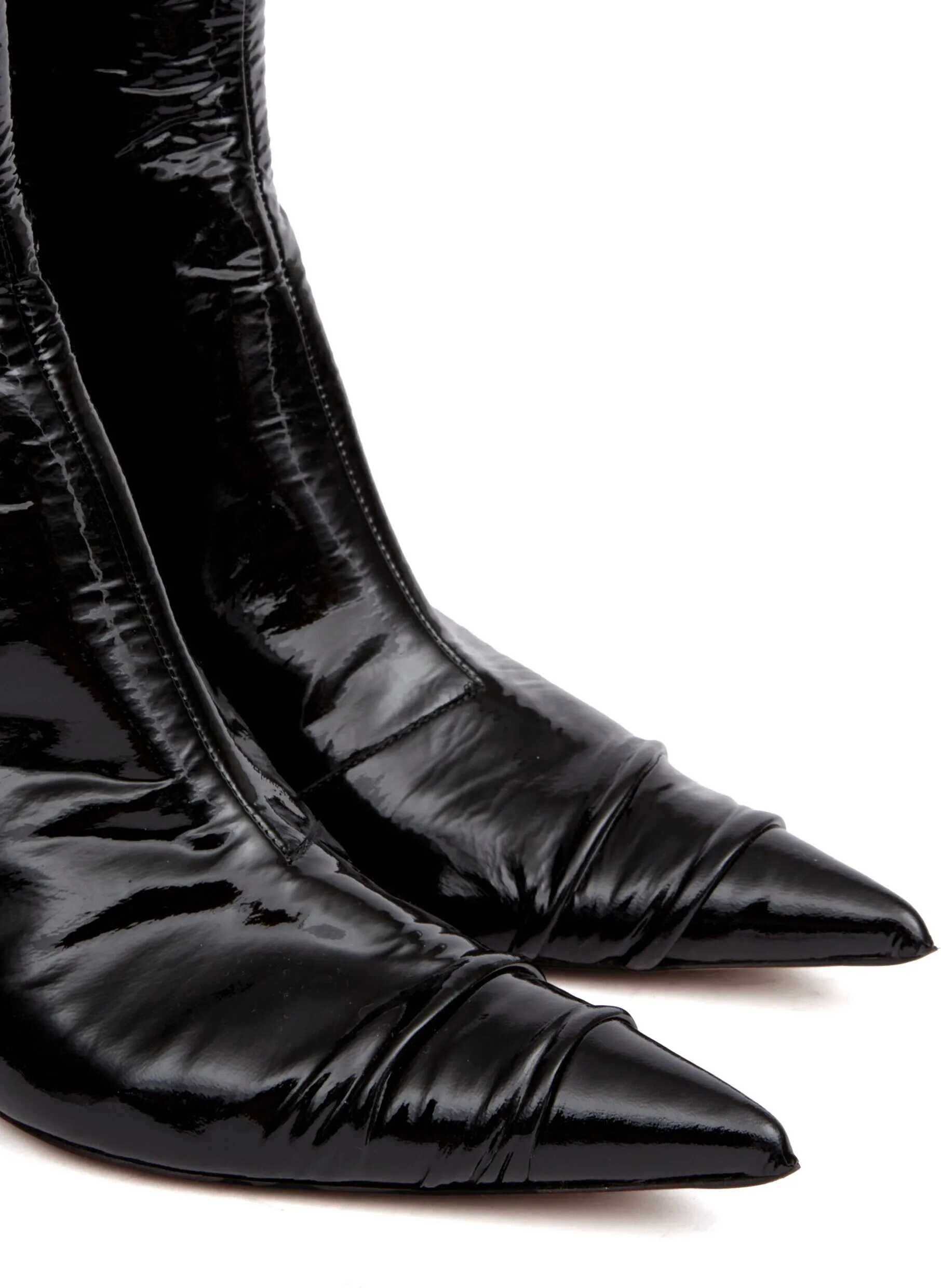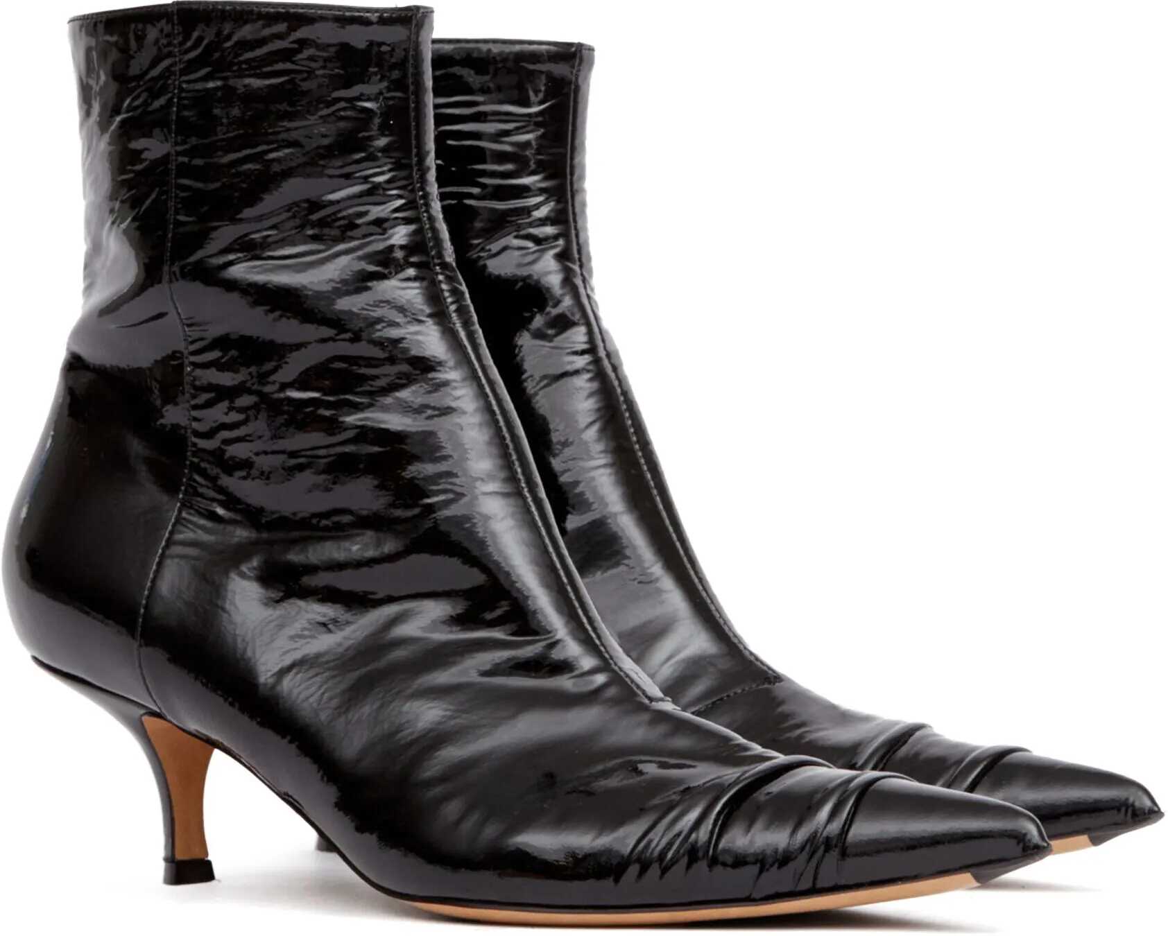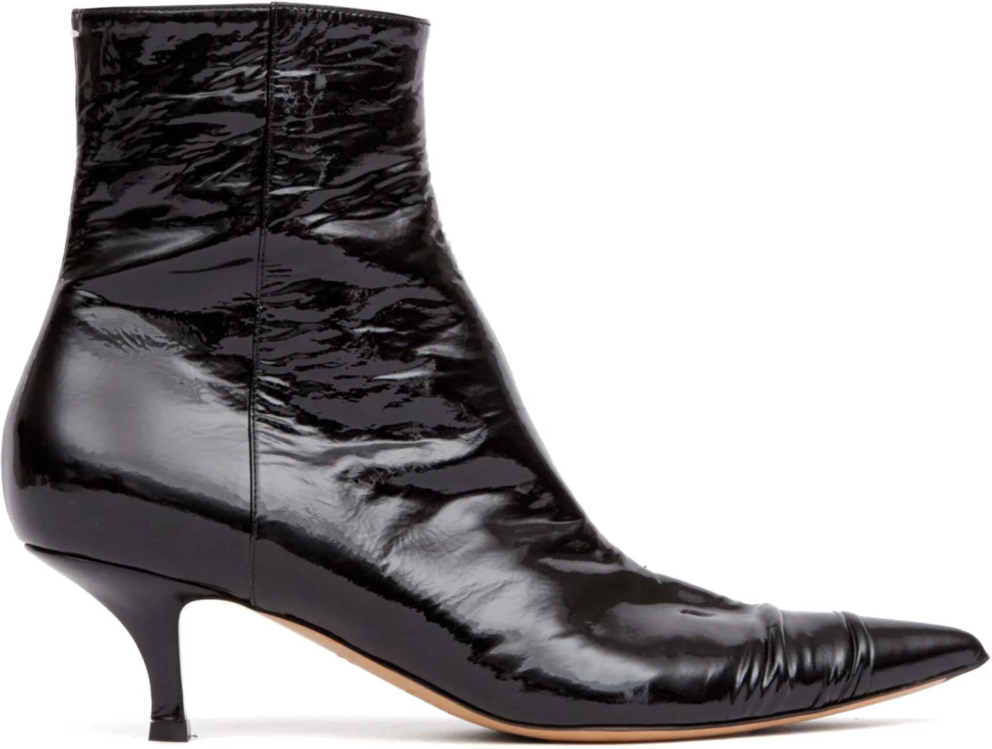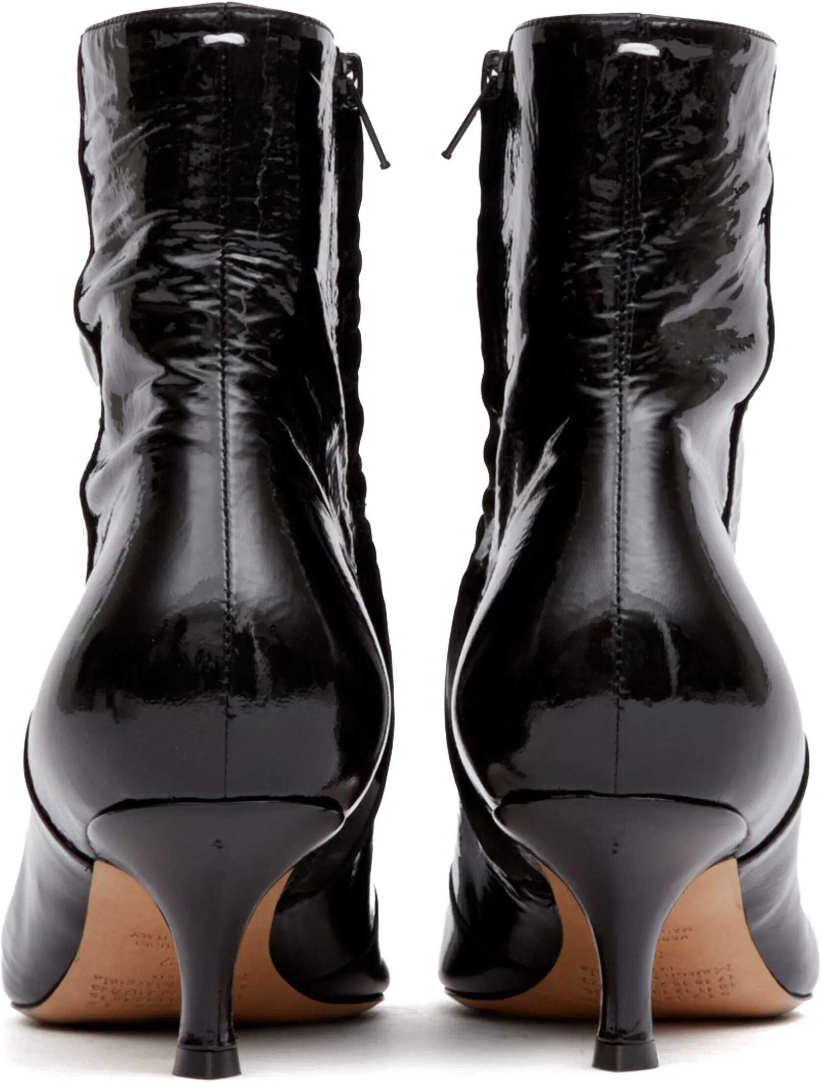 Margiela's Kinkies Ankle Boots in shiny leather feature a zip fastening on the inner side panel, for a comfortable and practical fit. The leather kitten heel offers an elegant and refined touch, while the elongated toe gives a slender and sophisticated look. The branded insole adds a distinctive and high-quality detail. A pair of ankle boots with a modern design, perfect for an elegant and versatile look.
