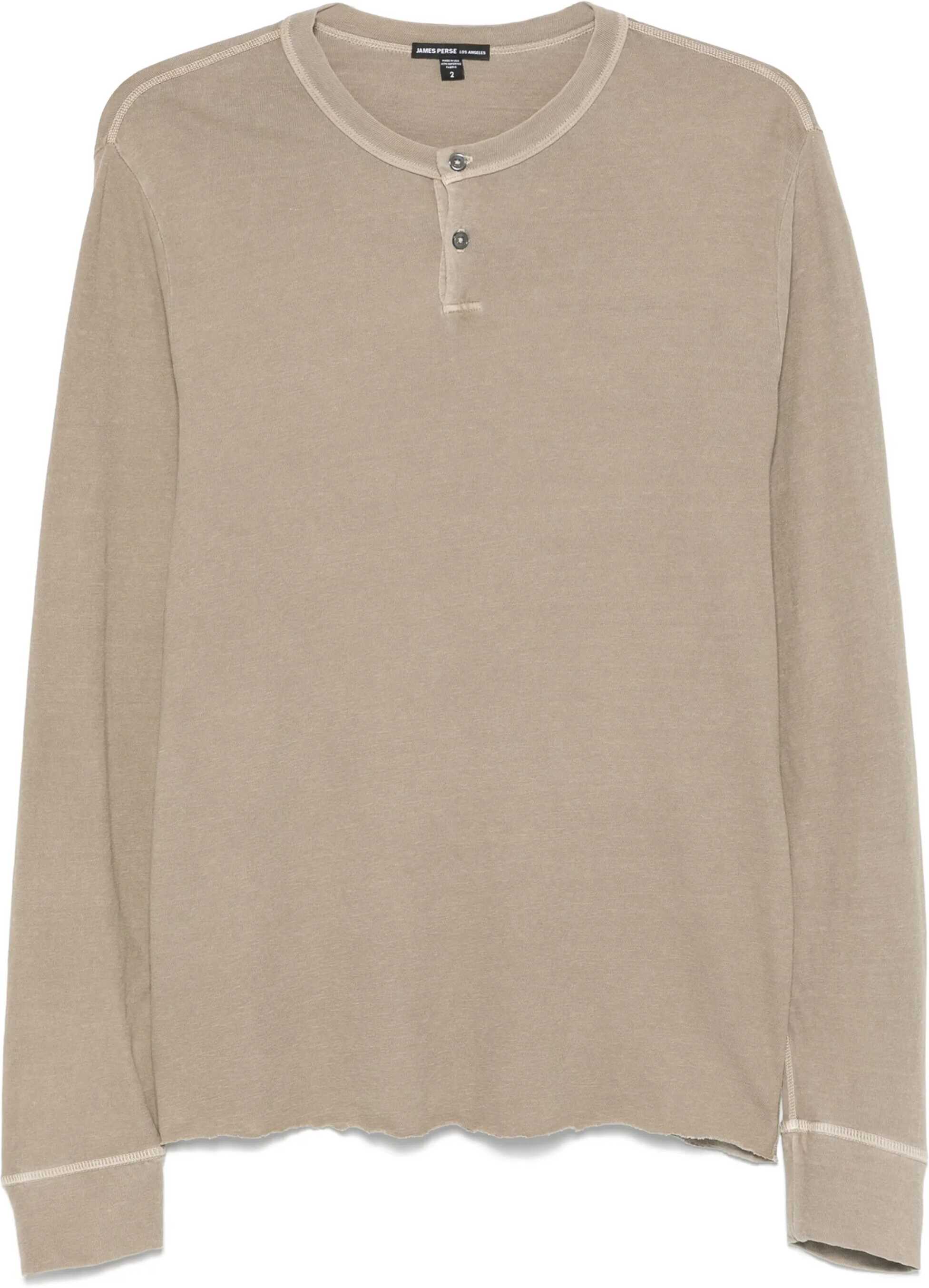 Beige lightweight slub Henley crewneck short-sleeve jersey. It features a placket with three buttons, ribbed cuffs and neckline, and a raw hem. Classic fit.