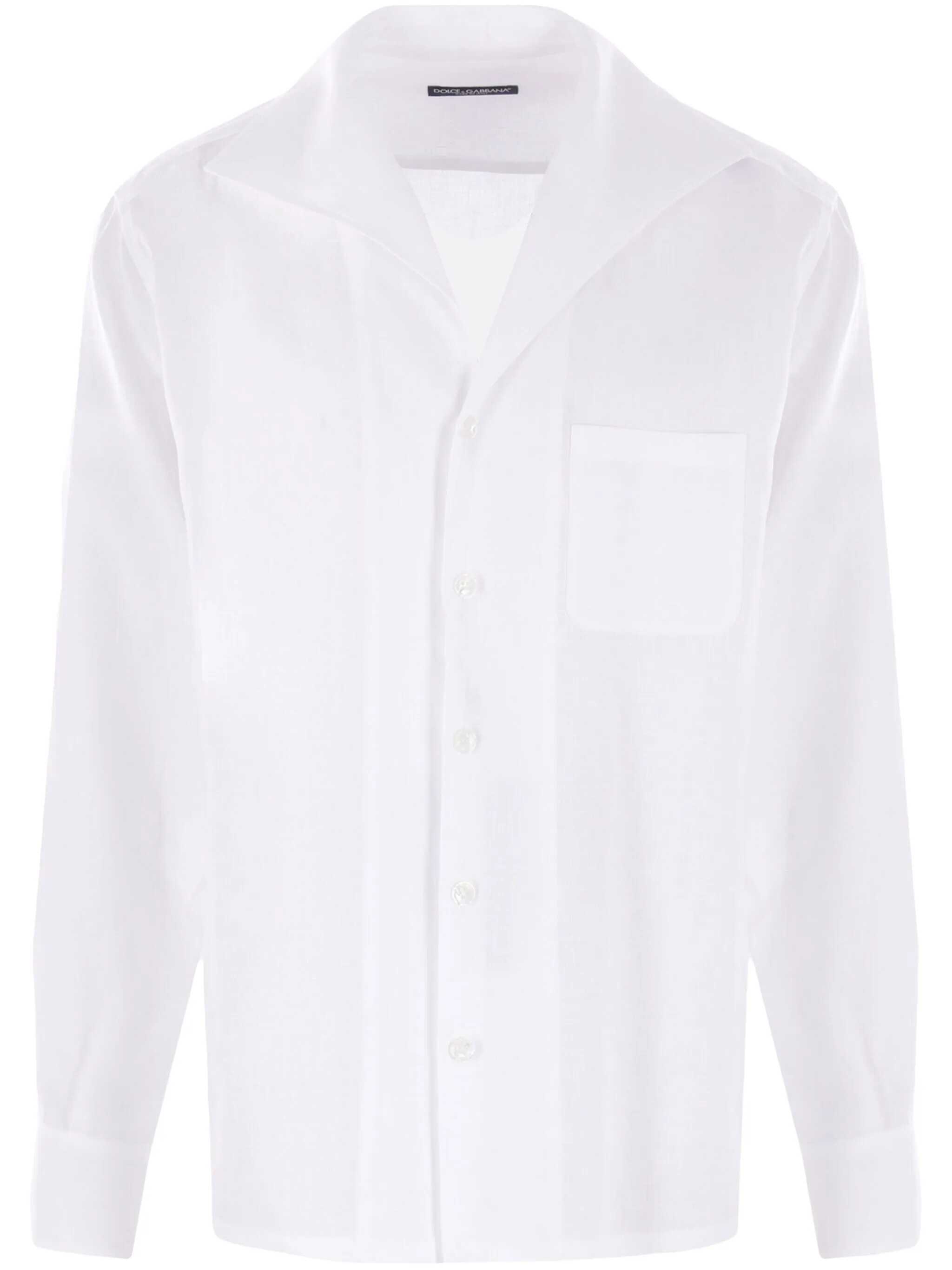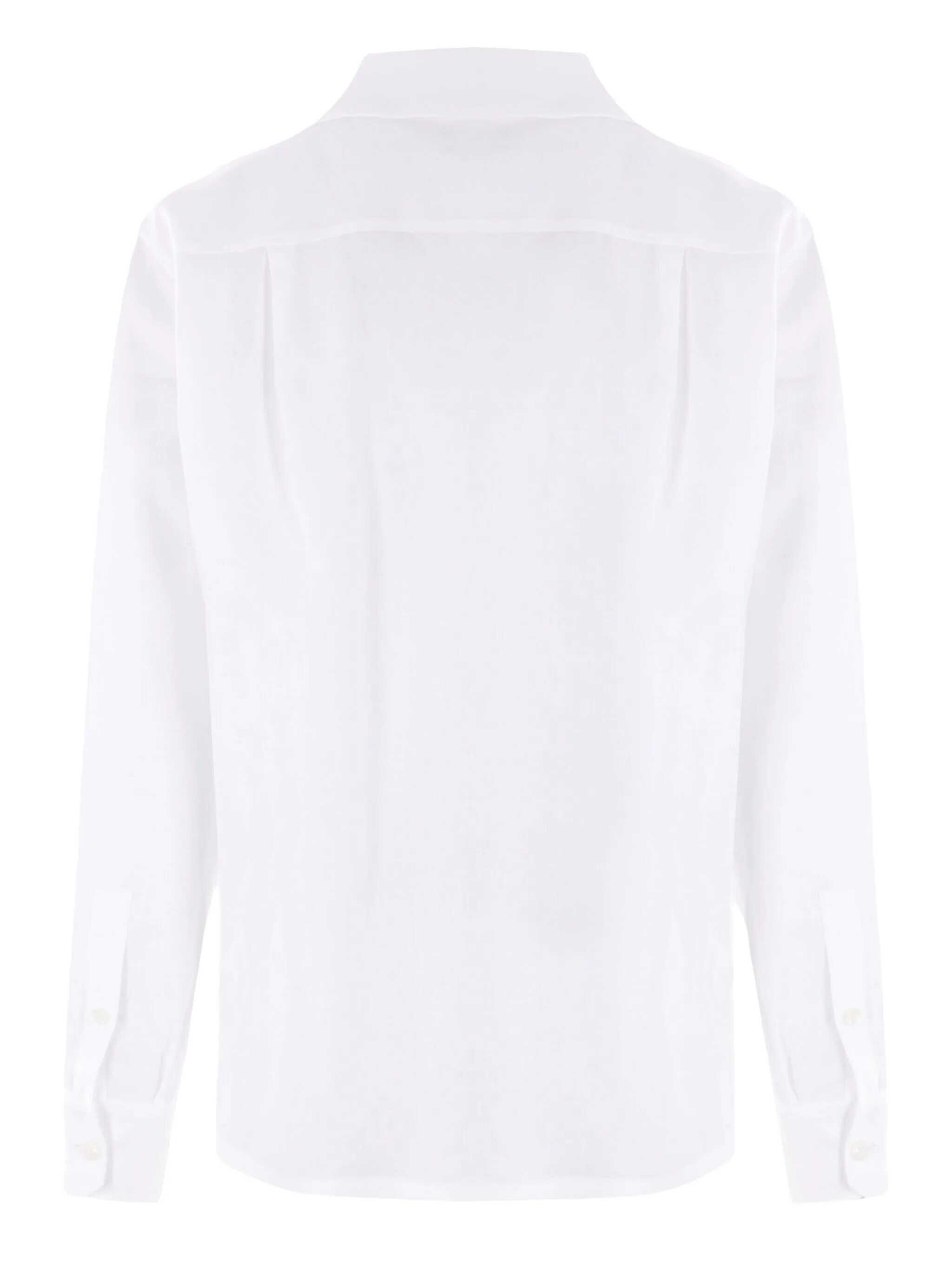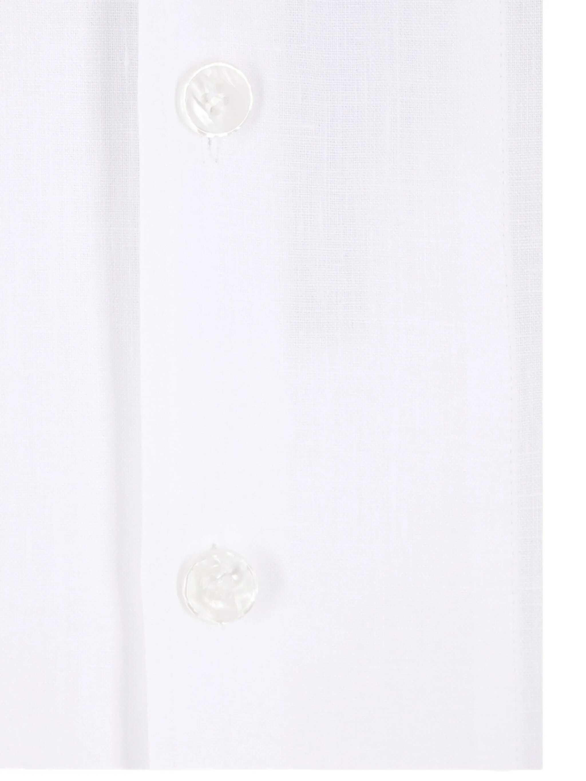 White linen shirt. Cuban collar. Button cuffs Chest pocket. Button closure.