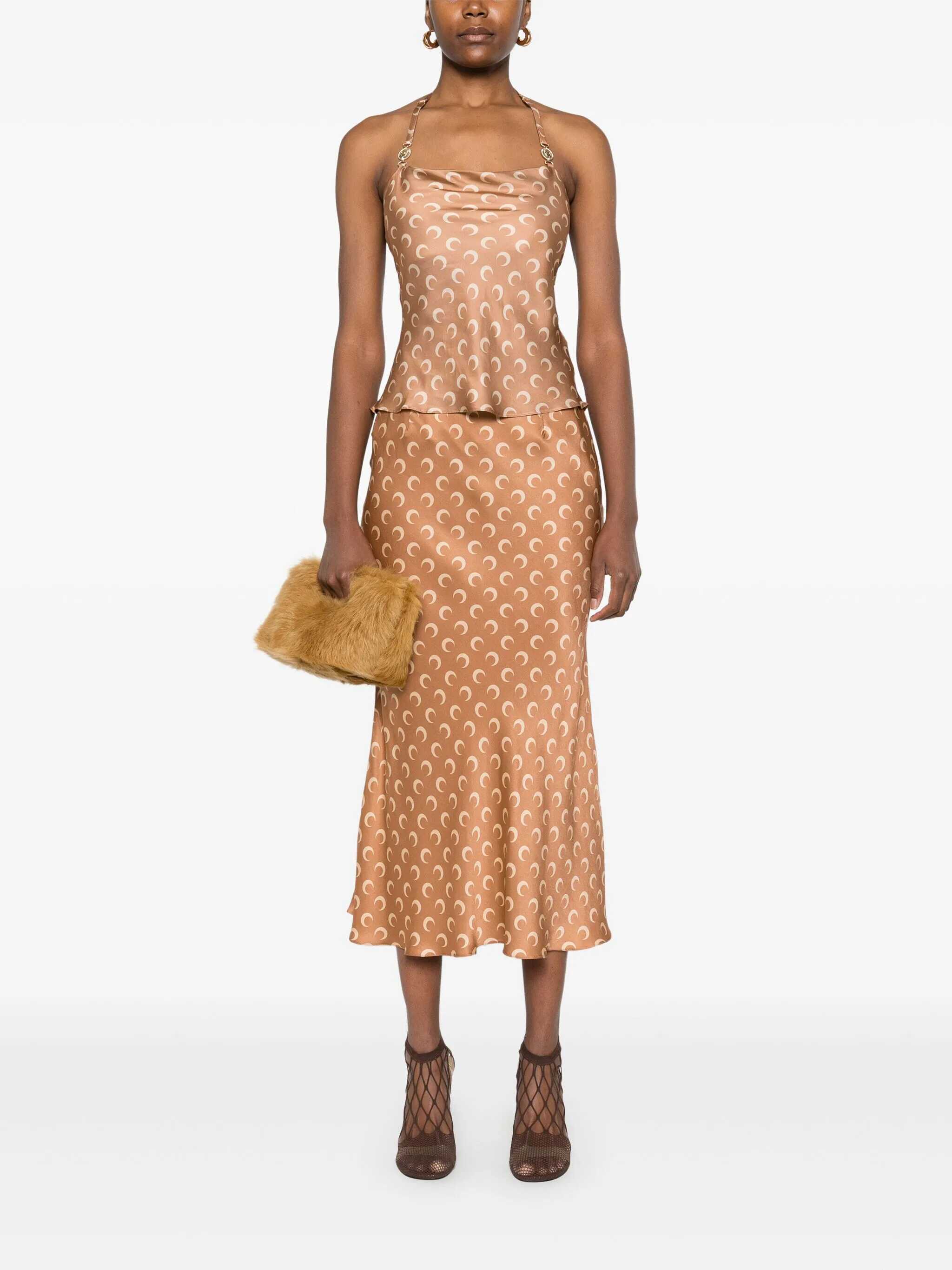 The Moon midi Skirt is an elegant model in satin fabric, which offers a refined shine. The pattern with the iconic Moon logo adds a distinctive and modern touch. The side zip closure ensures a comfortable and secure fit. Perfect for a sophisticated and contemporary look, ideal for those seeking a chic but bold style.