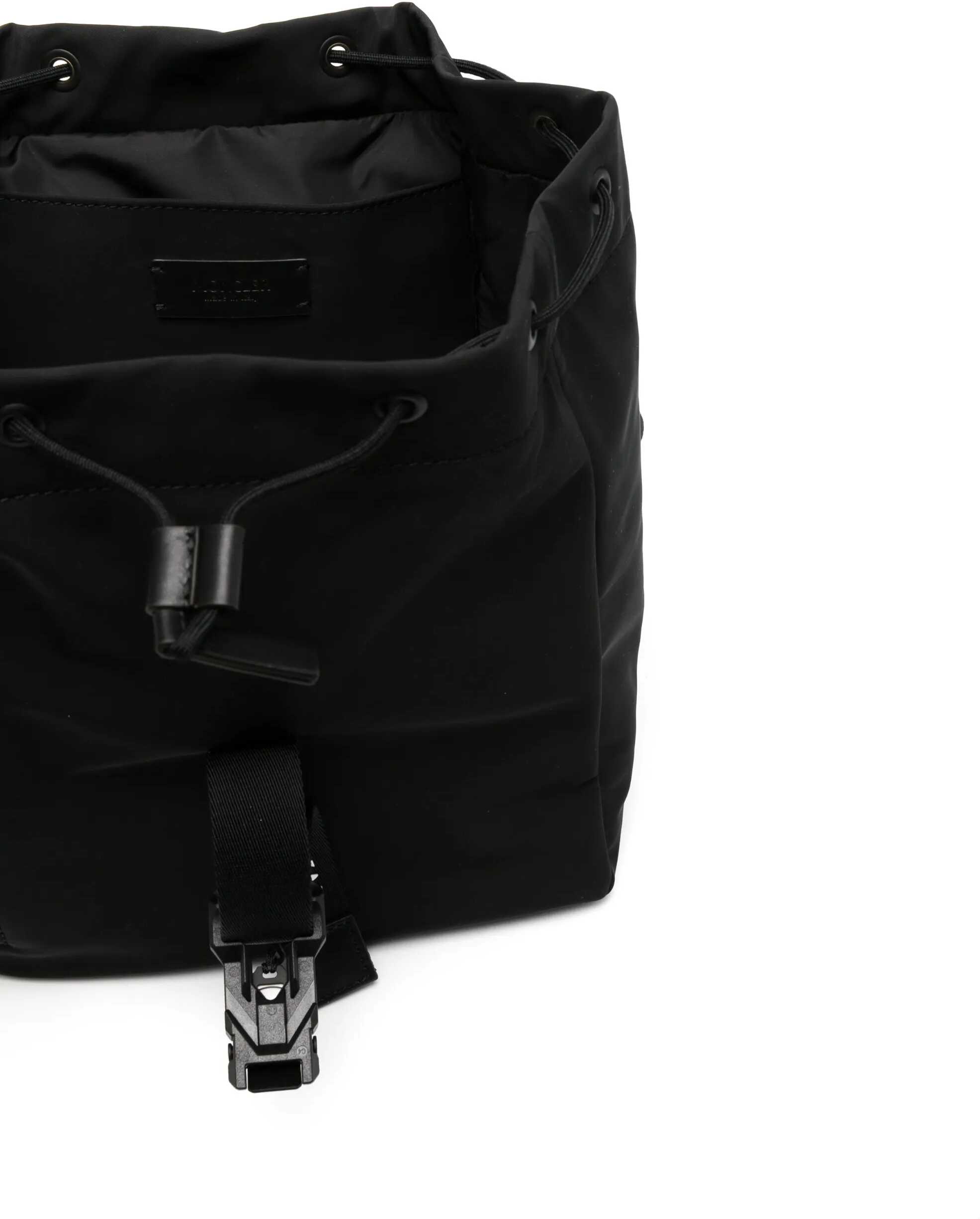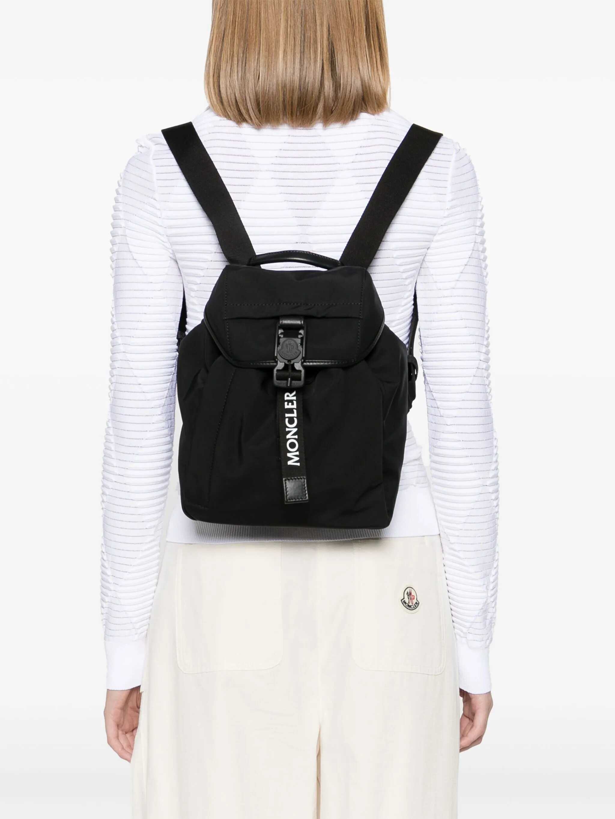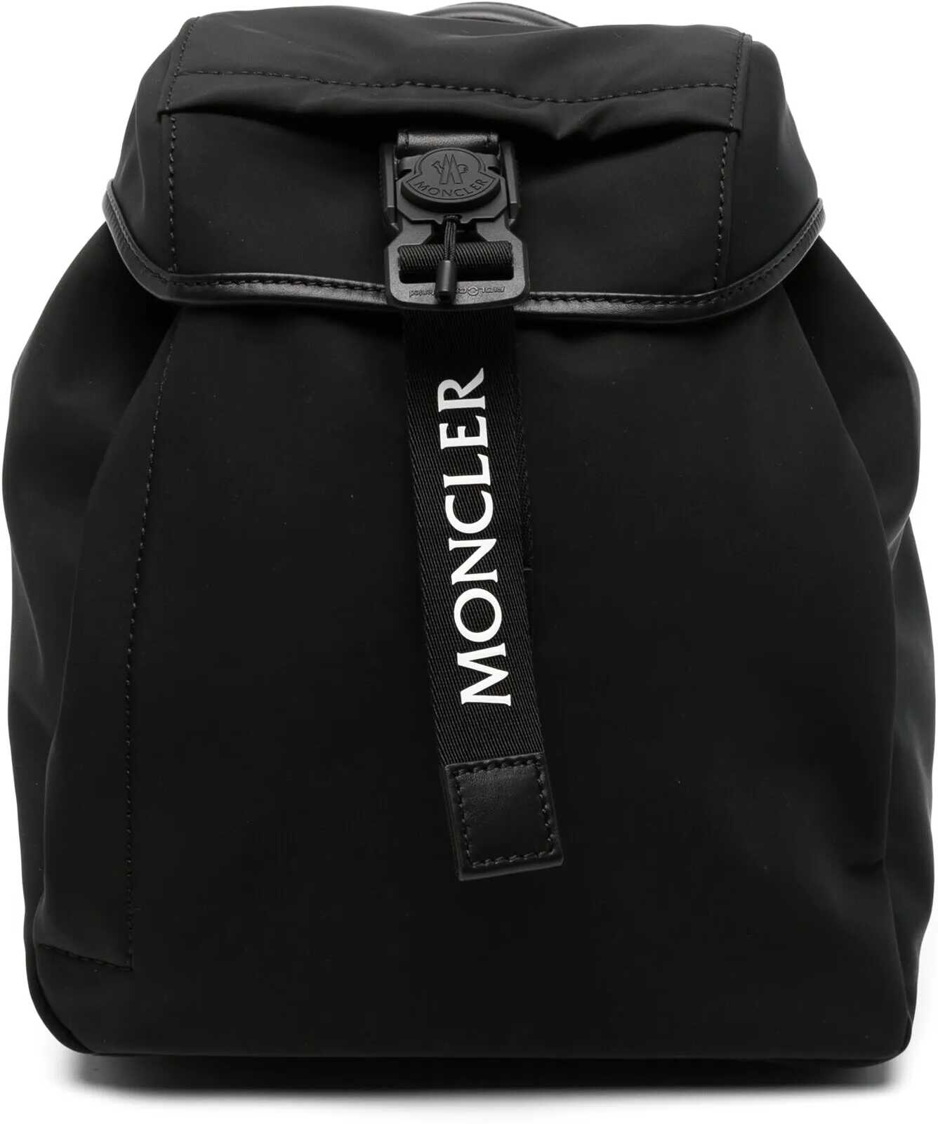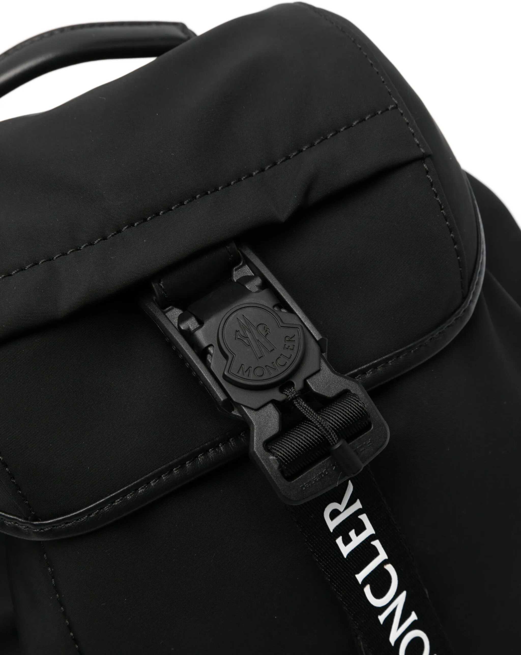 Mini Trick crossbody bag in black water-repellent nylon with leather finishes. It features a silver-tone Moncler metal logo on the flap, a buckle and drawstring closure, two external zip pockets, an adjustable fabric shoulder strap, a single internal compartment, and an internal flat pocket. Dust bag included. Any imperfections in the leather should not be considered manufacturing defects, but rather a characteristic of the material.