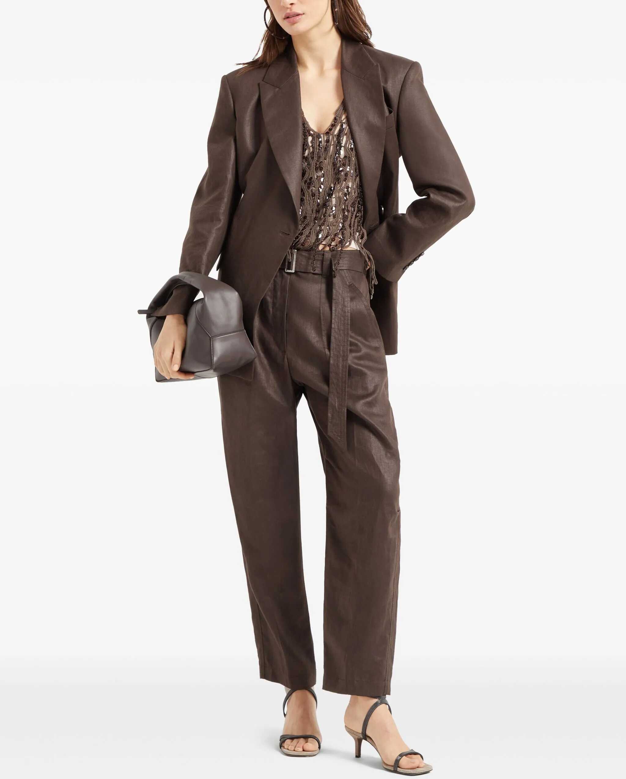 The Linen Blazer Jacket by Brunello Cucinelli is an elegant and sophisticated piece, perfect for a refined and timeless look. The peak lapel adds a touch of class, while the double-breasted front button closure gives structure and style. The slit pocket on the front and the two side welt pockets with flaps offer practicality and functionality, completing the impeccable design of the jacket. The vent on the back allows greater freedom of movement, making the garment not only beautiful, but also comfortable. Crafted from linen, this jacket is ideal for the warmer seasons, combining freshness and elegant style.