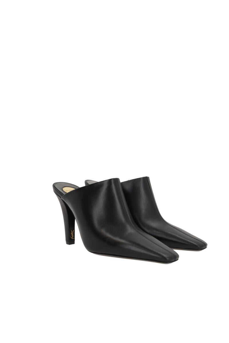 Saint Laurent mules crafted from black nappa leather. Featuring a square toe, leather lining, and a leather sole. Finished with a tapered block heel adorned with the Cassandre metal logo.