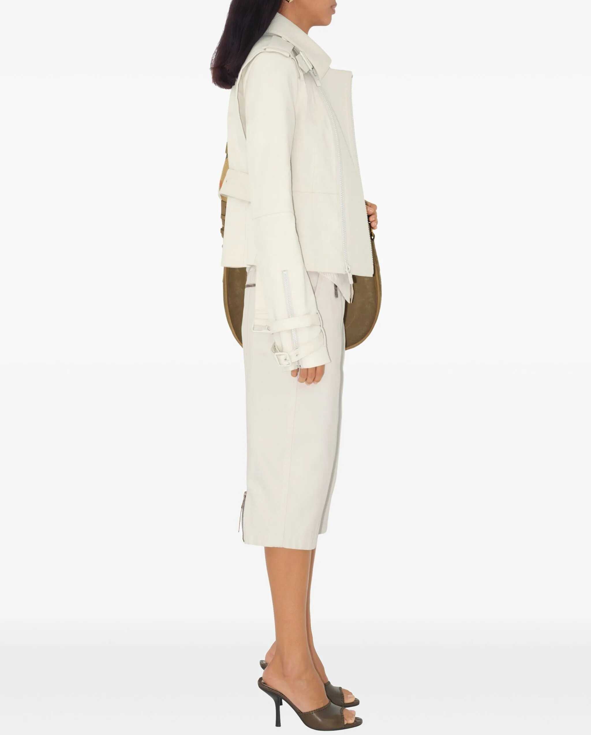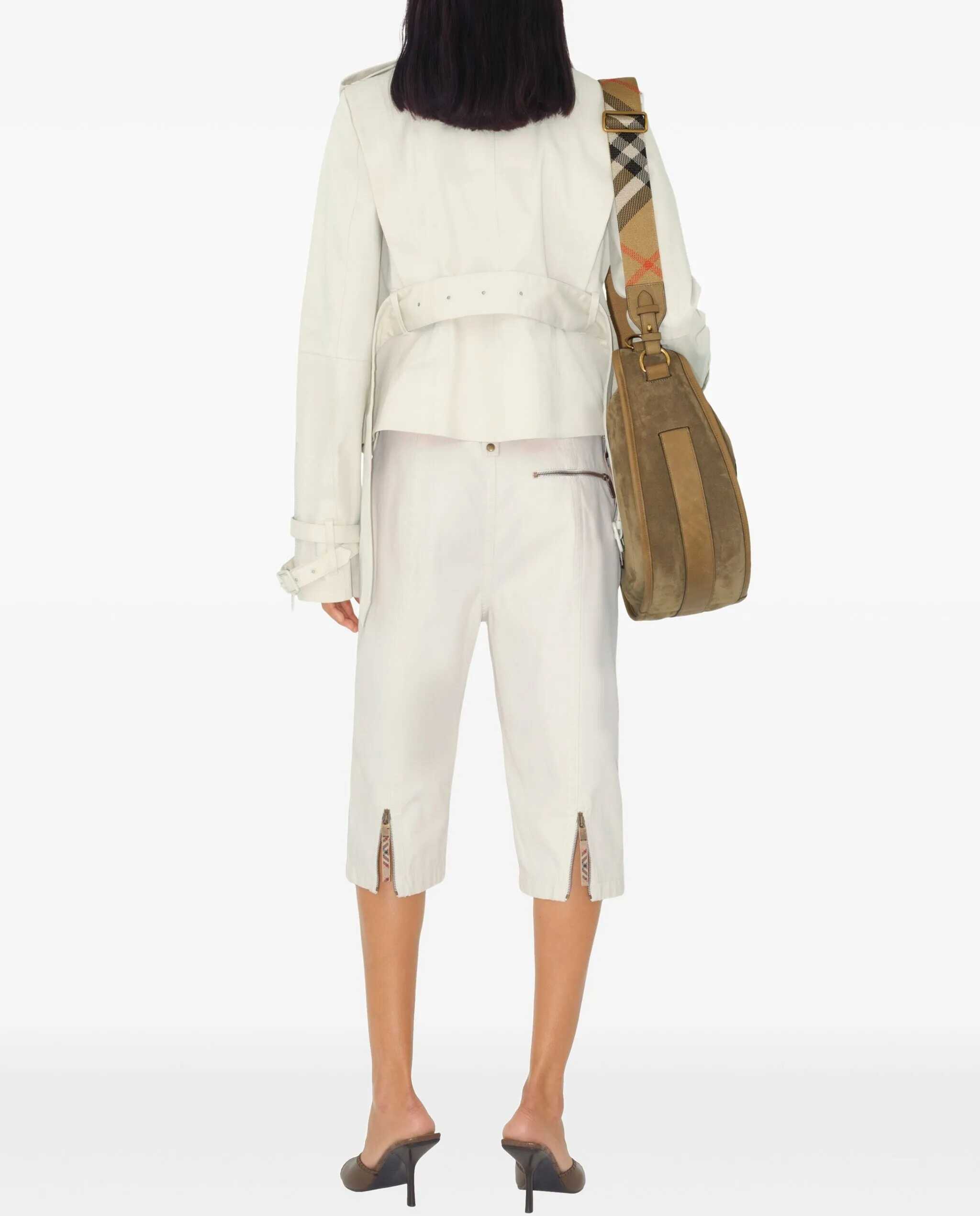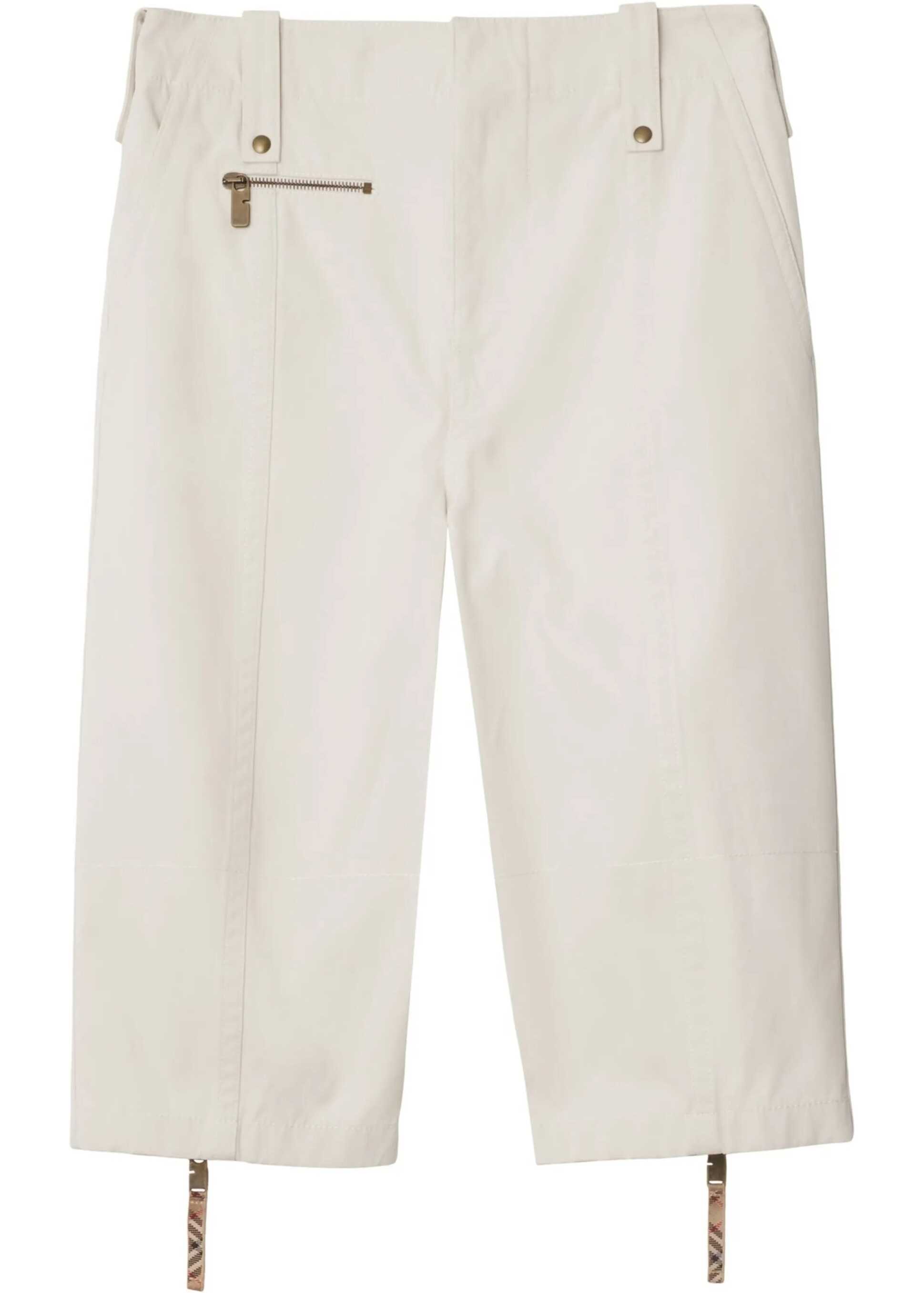 White cotton Capri pants. They feature a snap button and zip closure, belt loops, two side pockets, a small zip pocket on the front, a zip pocket at the back, and zip openings with B-cut zipper pulls in Burberry Check at the back hems. Slim fit.