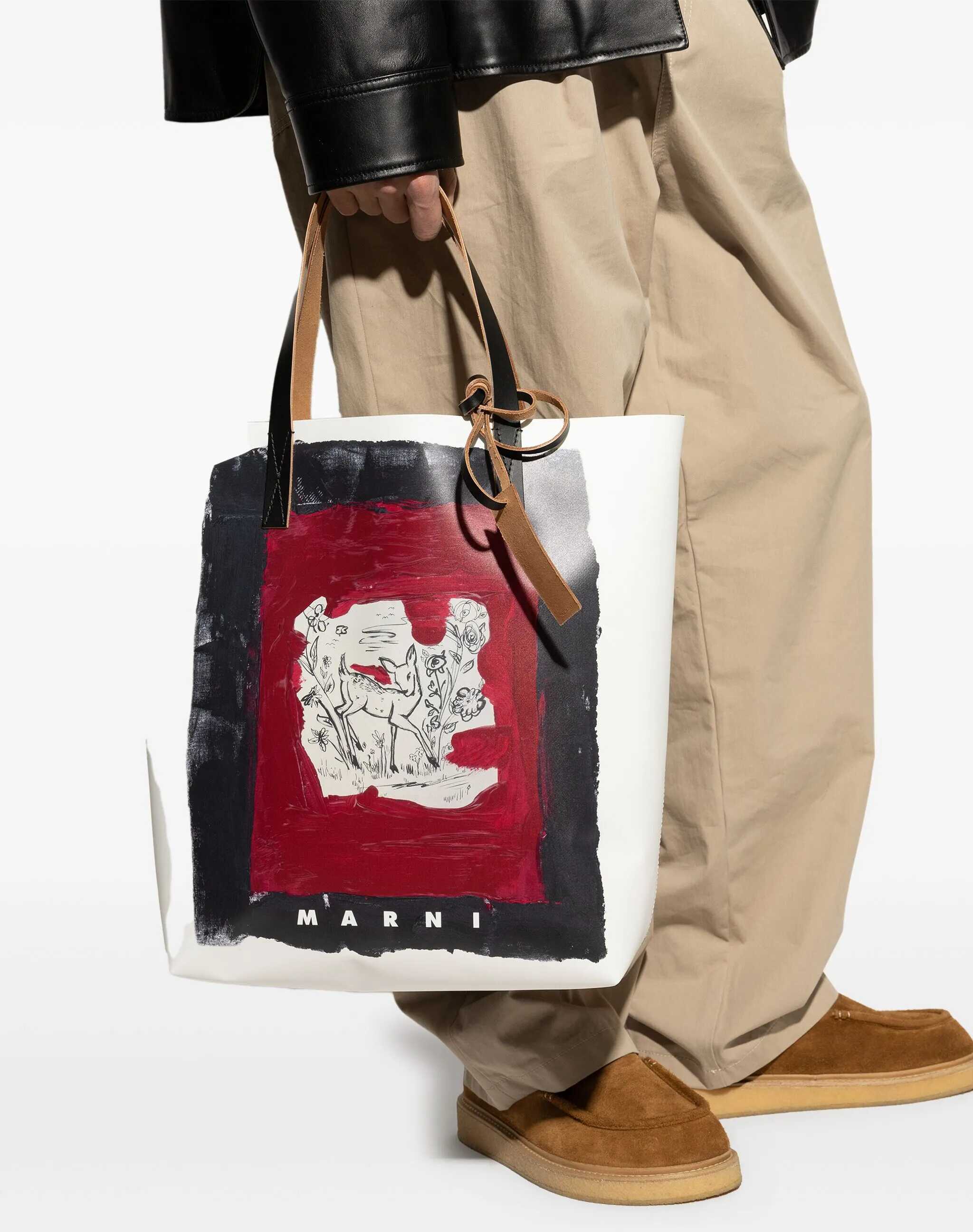 The Tribeca Tote Bag by Marni is a practical and stylish accessory, ideal for a casual and contemporary look. The two top handles allow for a comfortable grip, while the large and spacious design makes it perfect for everyday use. The maxi print on the front, embellished with the iconic monogram, adds a touch of originality and recognisability to the garment, making it immediately distinctive. The interior, with a single compartment, offers enough space to store essential items with ease.