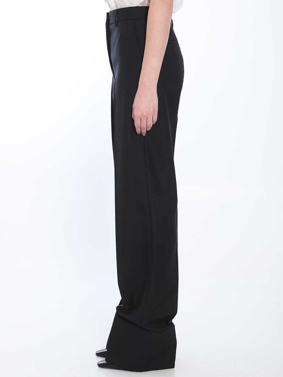 Black virgin wool straight-leg trousers. They feature a hook, button, and zip closure, belt loops, two side pockets, two welt pockets at the back, wide legs, and cuffs at the hem.