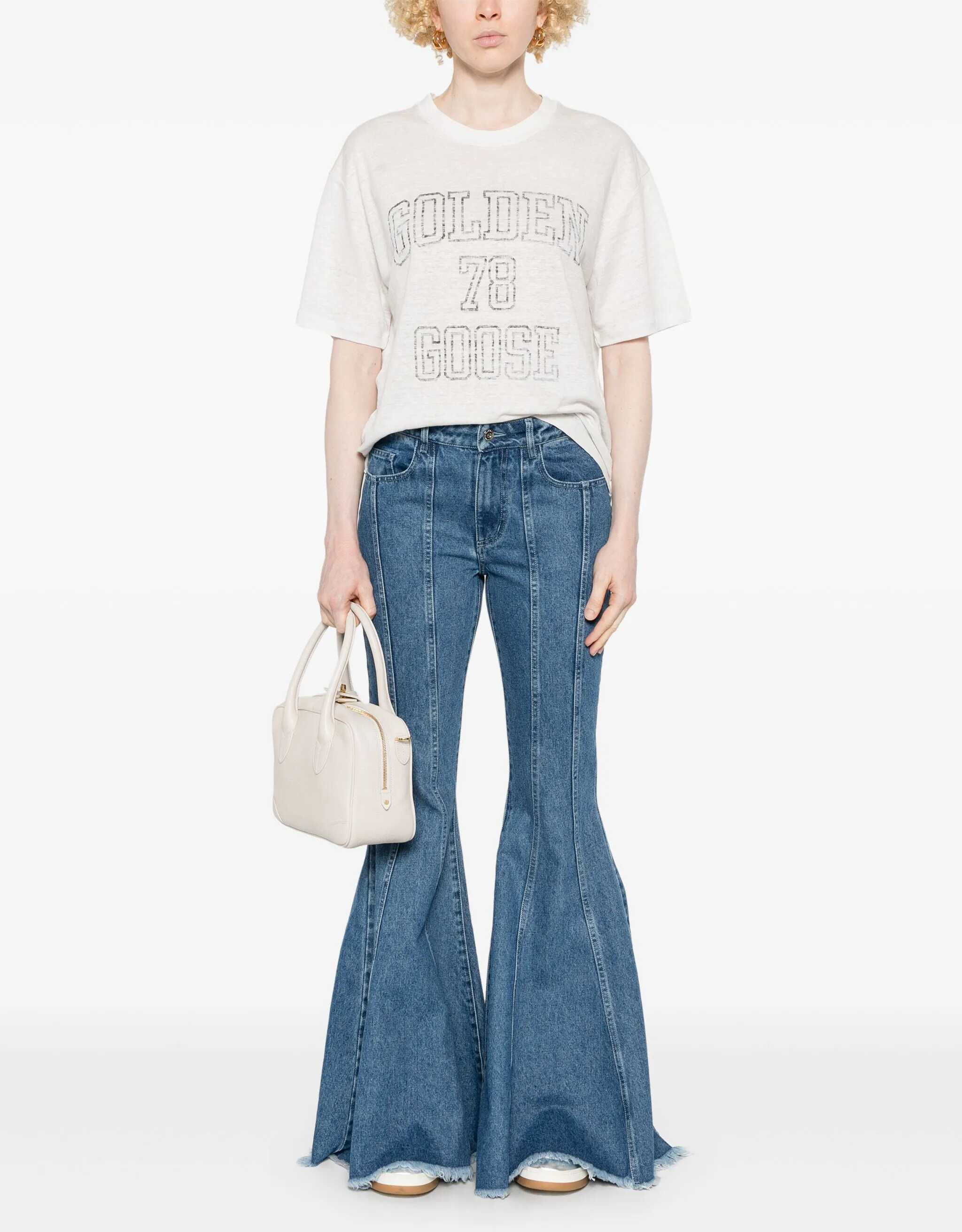 Lightweight white linen short-sleeve crewneck t-shirt. It features a faded black Golden Goose 78 logo on the front, double star detail on the back, and a ribbed crew neckline. Boxy fit.