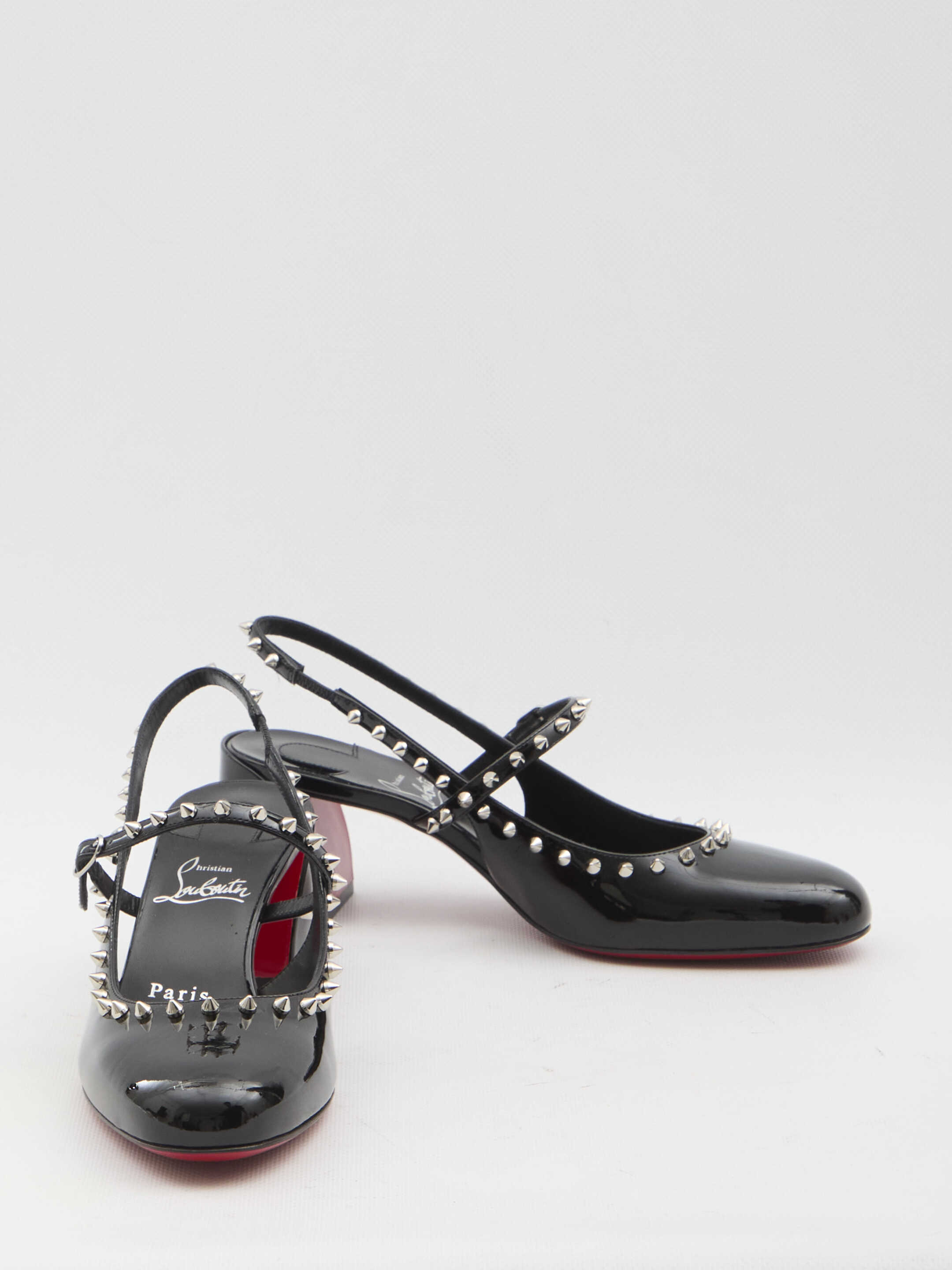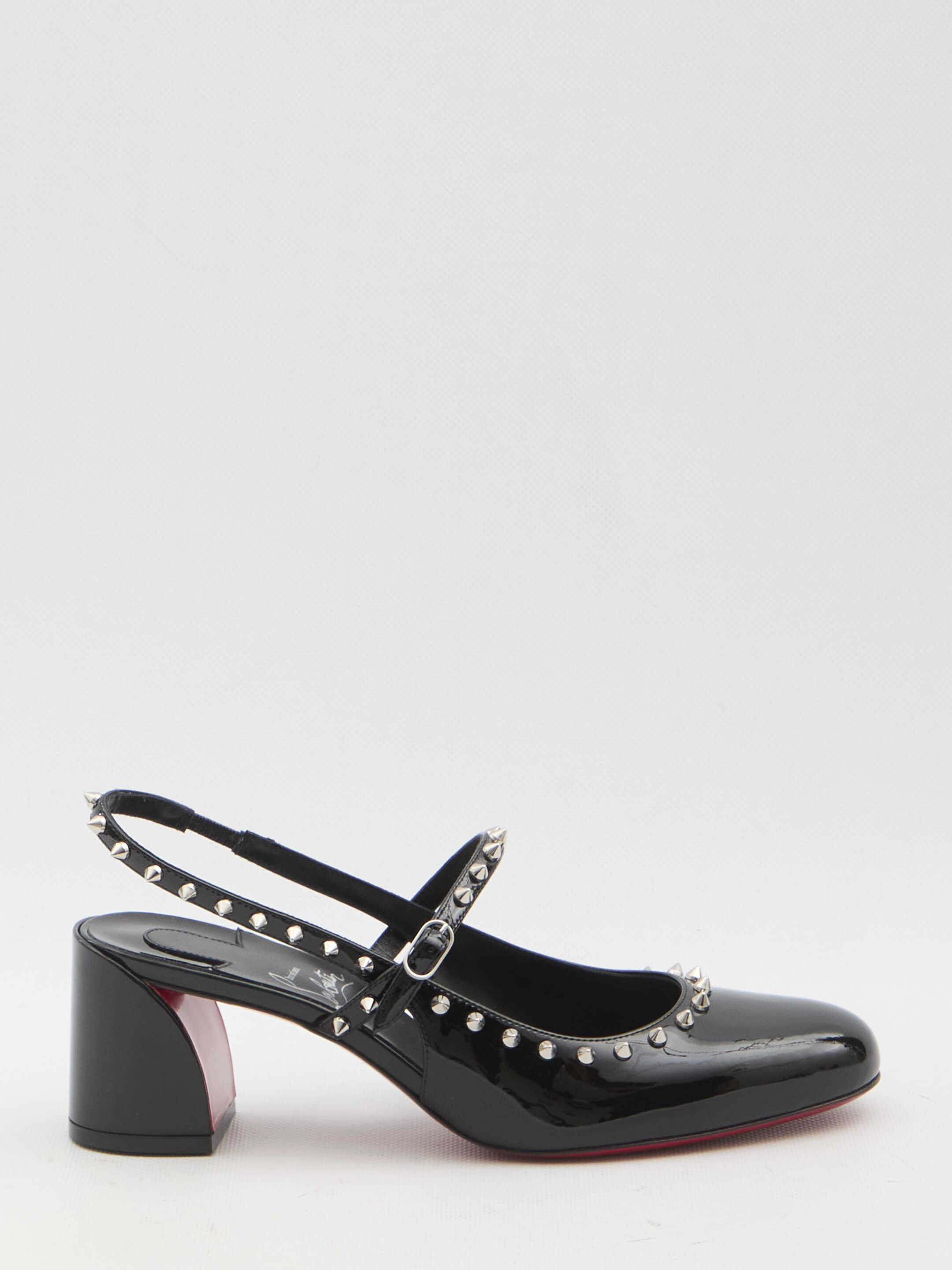 Mary Jane Janispikes in black patent leather. They feature a round toe, metal stud embellishments, an elastic back strap, an adjustable buckle strap on the upper, a block heel, an embossed logo on the insole, and a signature red leather sole. Dust bag included. Any imperfections in the leather should not be considered manufacturing defects but rather a characteristic of the material.