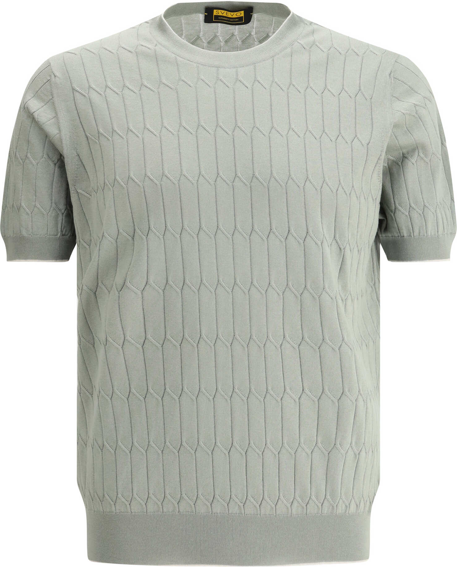 The cotton T-shirt by Svevo is a garment with a modern and sophisticated design, characterized by a ribbed crew neck that adds a touch of discreet elegance. The knitted design features geometric details, creating an interesting and contemporary visual effect. The ribbed hem completes the look, giving a delicate but defined structure. Perfect for those looking for a casual T-shirt with an accent of originality and style, suitable for both everyday looks and more elegant combinations.