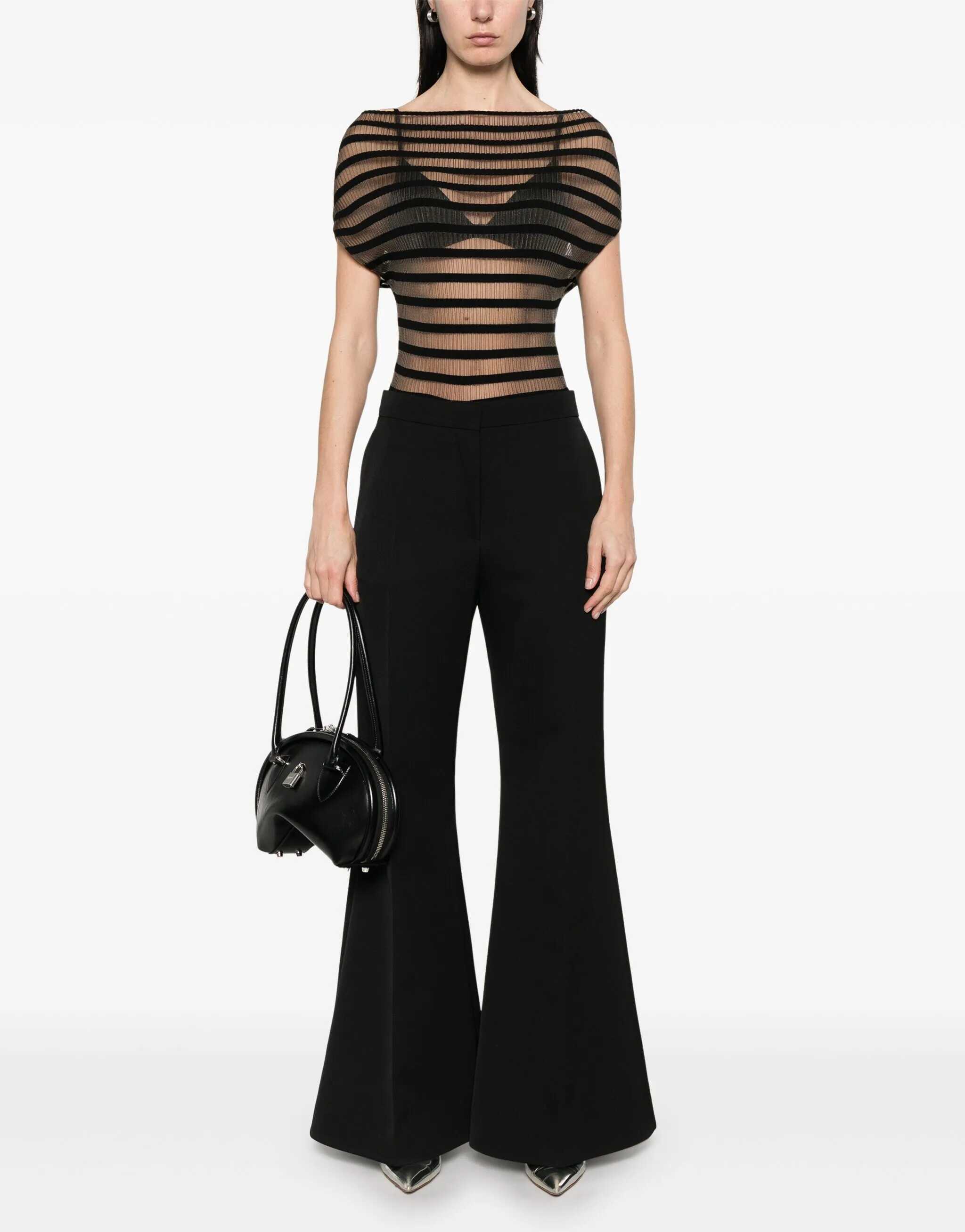 Givenchy's wool Pants are a sophisticated and versatile piece, perfect for those seeking an elegant and modern look. The front zip and hook fastening ensures an impeccable fit, while the two side welt pockets and the two back welt pockets offer a functional and elegant detail. The flare model gives a tapered and slender silhouette, creating a long and fluid effect that adds refinement to the design. Perfect for formal occasions or for a chic and classy look, these trousers are ideal for those who appreciate high-quality craftsmanship and a timeless style.