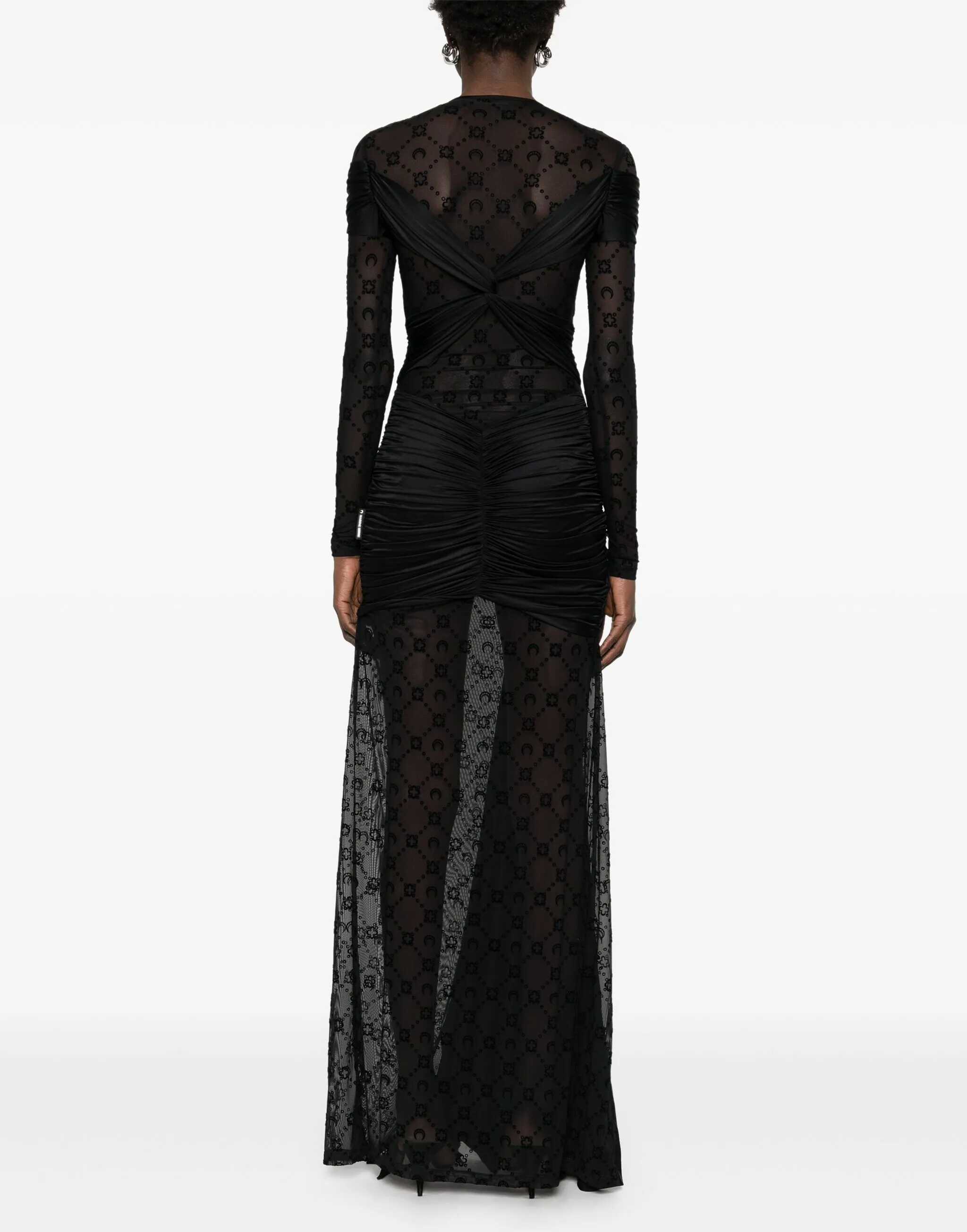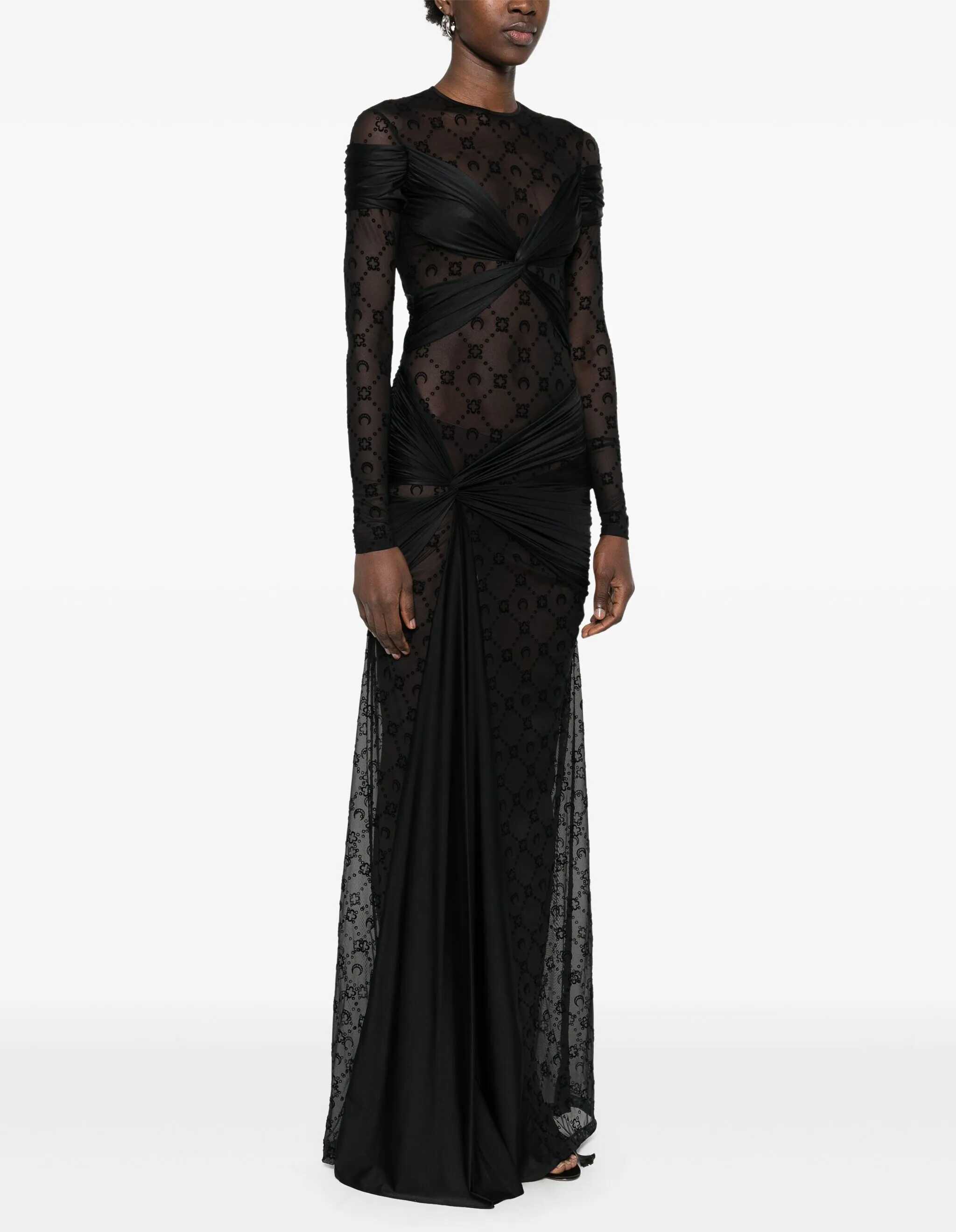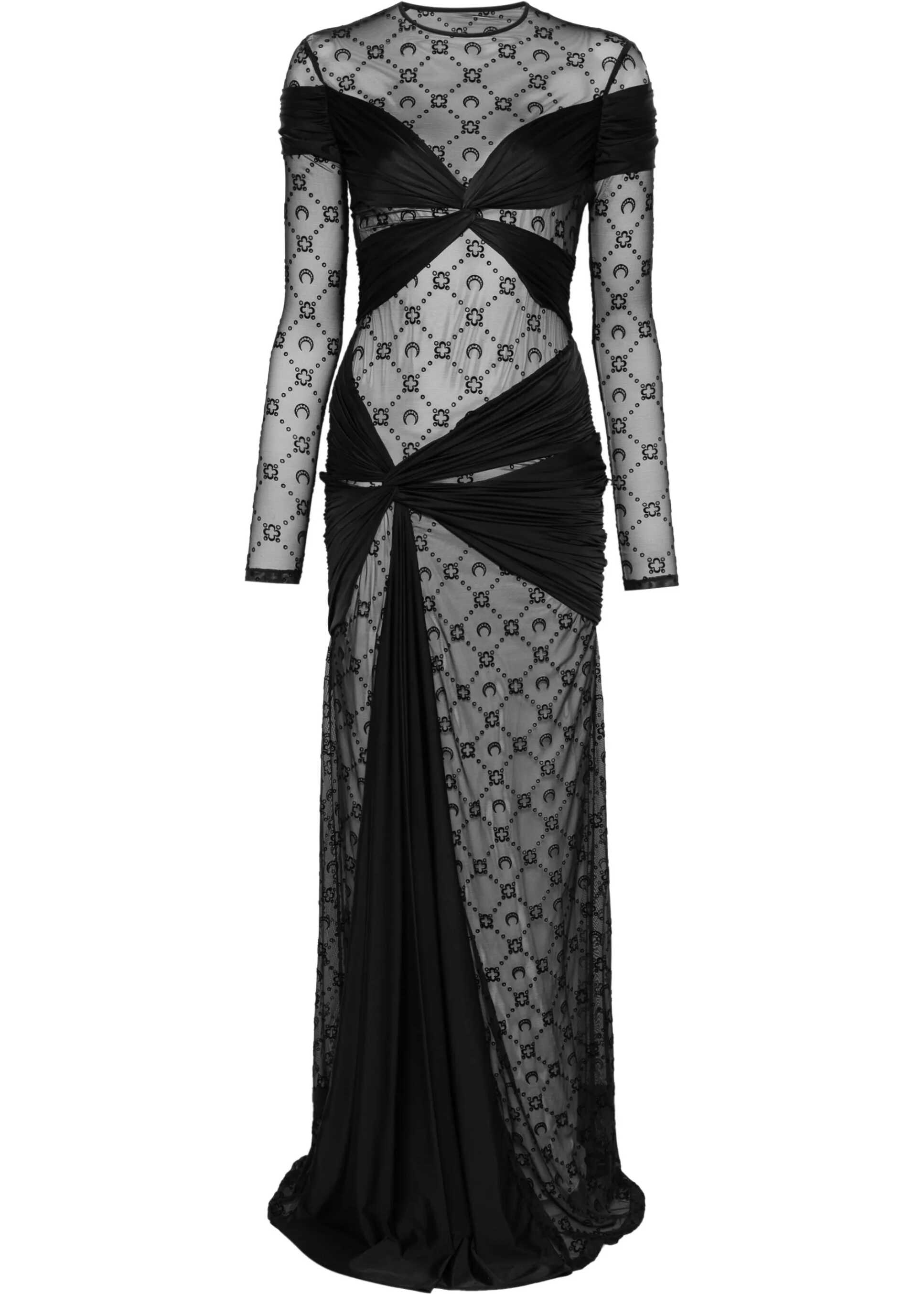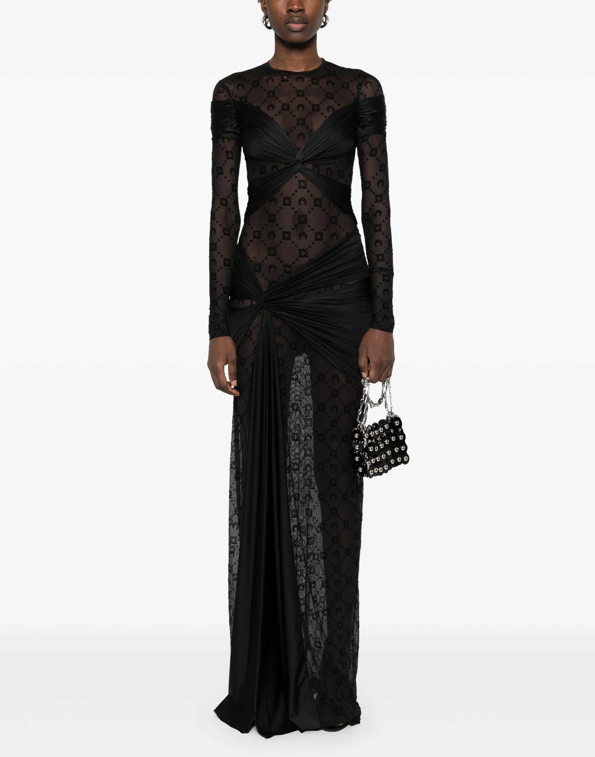 The Draped Long Dress by Marine Serre features a sophisticated design with semi-sheer long sleeves, which add a touch of sensuality and elegance. The classic crew neck balances the transparency of the sleeves, creating a harmonious look. The draping detail on the front and back gives movement and structure to the garment, while the slit on the back adds dynamism. The iconic pattern of the brand, distributed throughout the dress, adds a distinctive and bold touch, making this dress a unique and fascinating piece.
