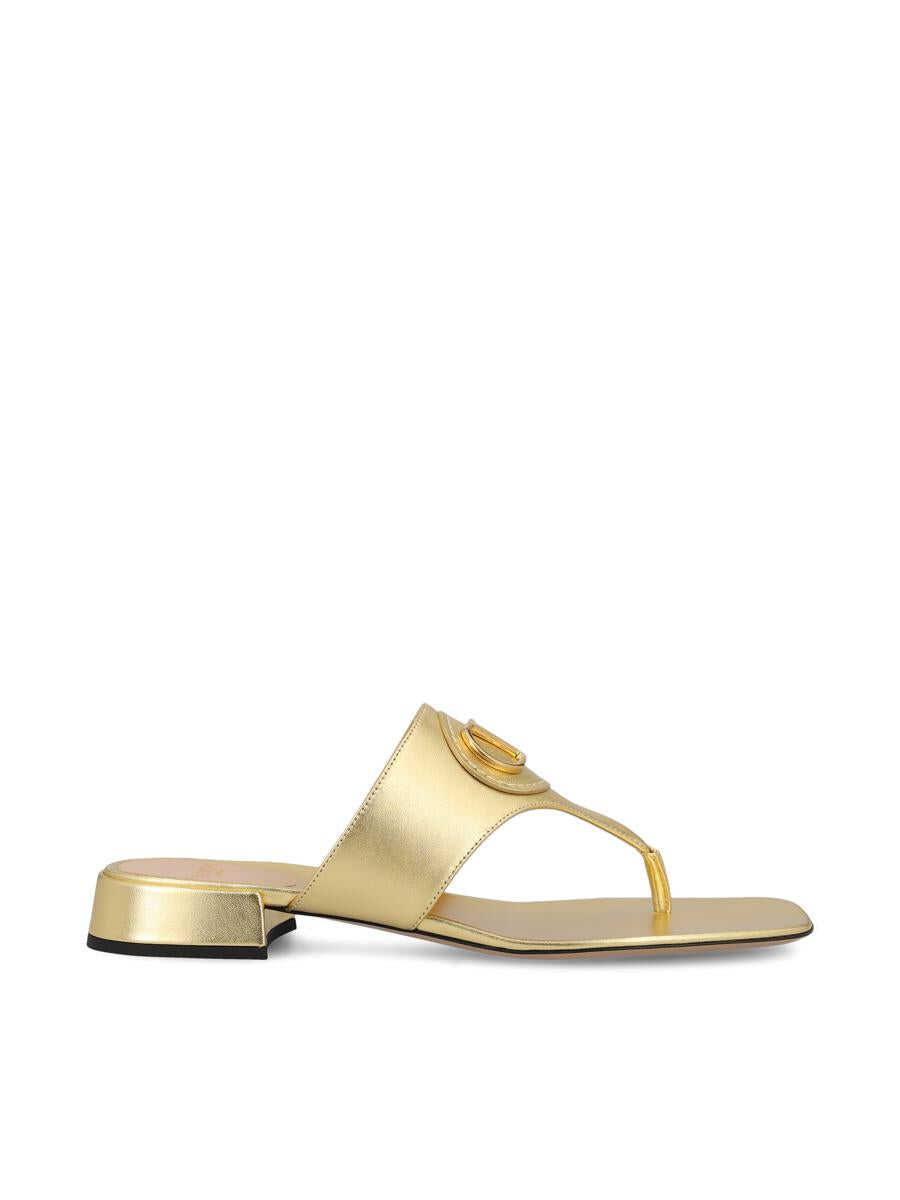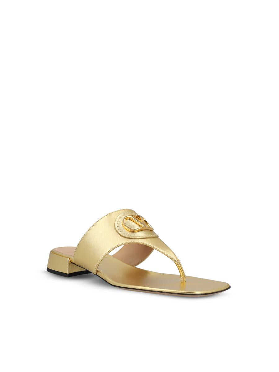 Signature VLogo thong sandals combine summer lightness with bold elegance, thanks to a minimal design enhanced by the iconic gold V logo. Made of high-quality leather, they offer a comfortable fit and a feminine silhouette. - Upper: 100% calfskin leather - Color: gold - Leather sole - Logoed insole - Heel height: 20 mm - Applied gold V logo on front - Made in Italy - Box included - Item code: 6W2S0LA9KDRI8M