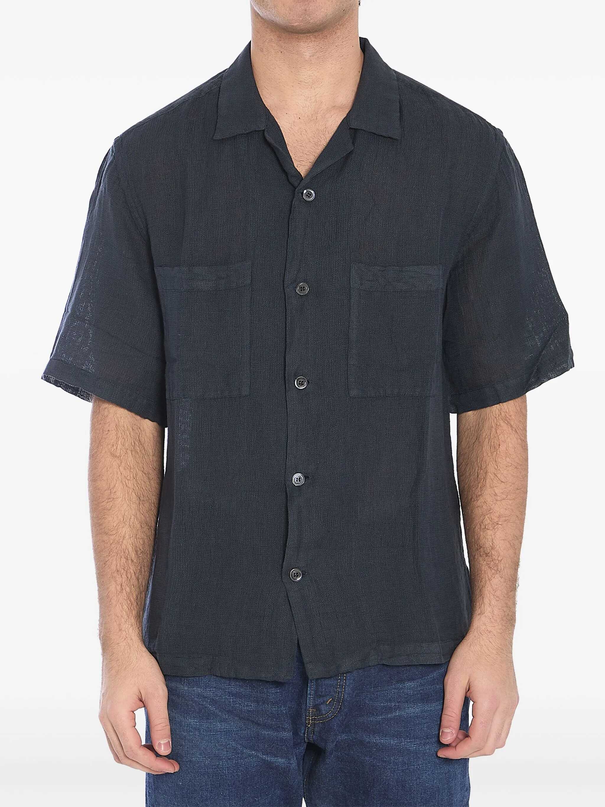 Solana Net short-sleeve shirt in a lead-colored lightweight ivory linen and cotton blend. It features a pointed collar with revers, a front button closure, and two applied chest pockets.