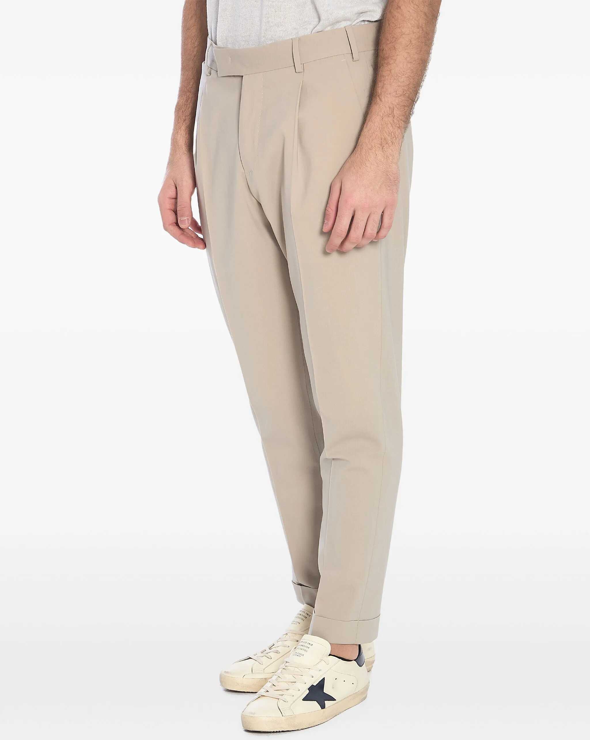 Rebel trousers in beige virgin wool blend. They feature front pleats, a hook, button, and zip closure, belt loops, two side pockets, two back welt pockets with a button, and a cuffed hem.