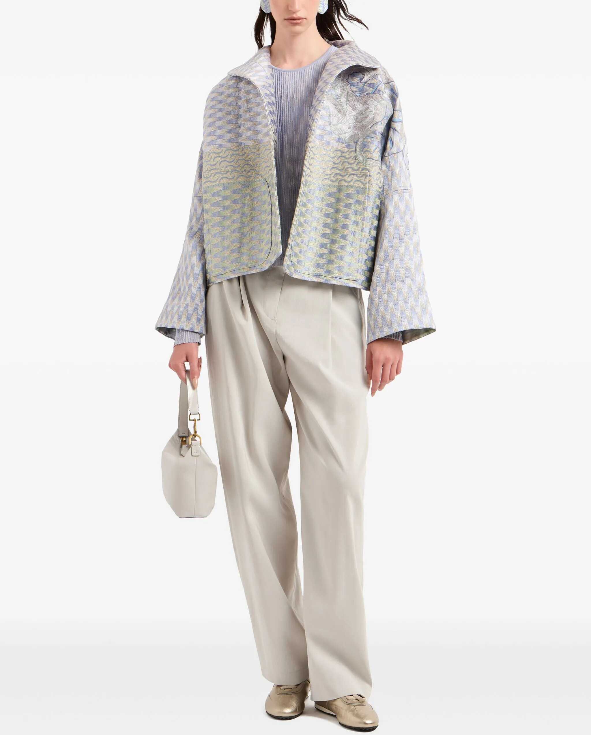 The Giorgio Armani hemp Jacket is an elegant and distinctive piece, ideal for those seeking a sophisticated yet relaxed style. The French collar adds a classic and refined touch, while the no-closure model gives a more informal and fluid look. The two welt pockets applied on the front offer functionality without compromising aesthetics. The dropped shoulders add a relaxed style detail, while the multi-colored pattern makes the jacket unique, adding liveliness and character to the look.