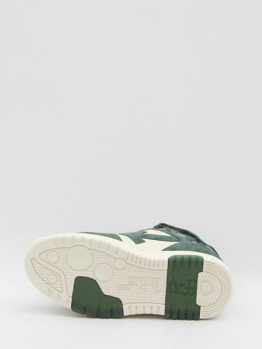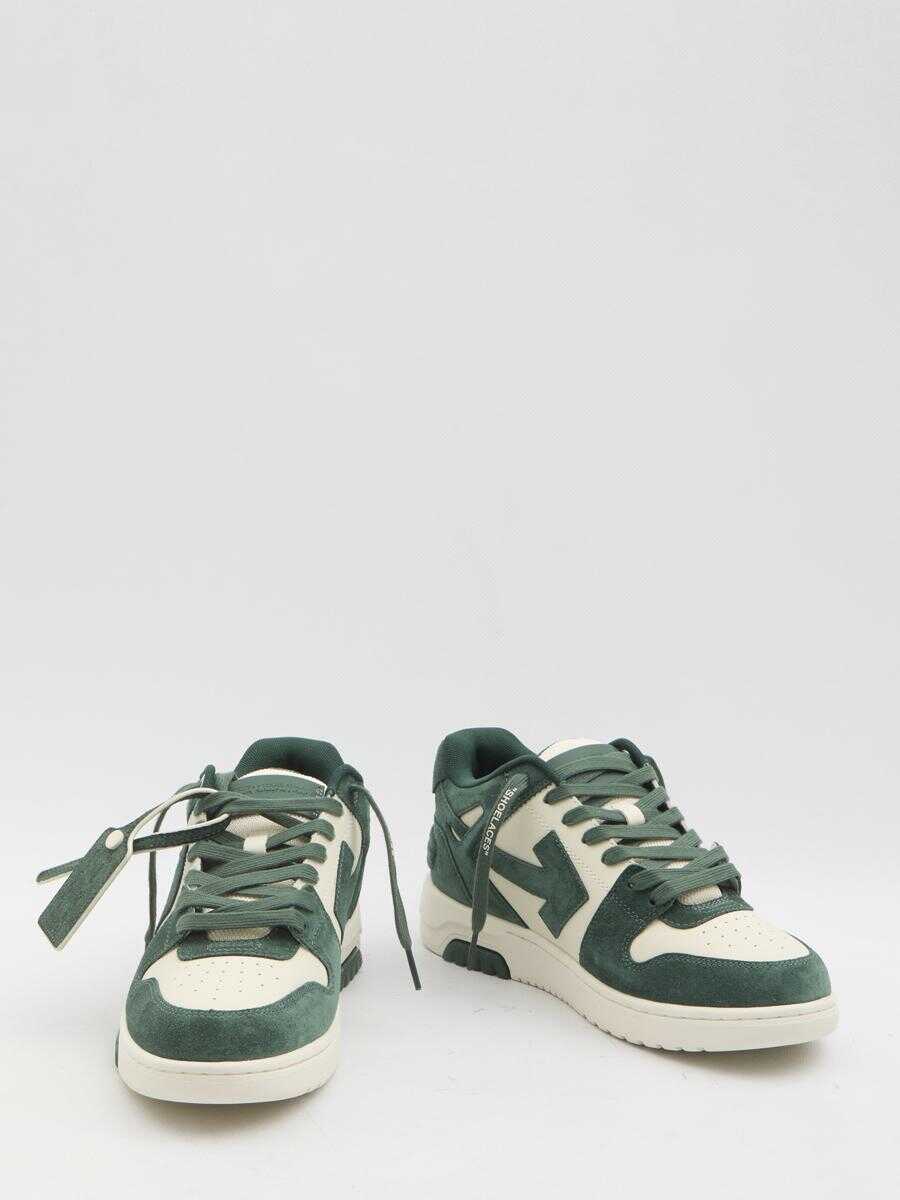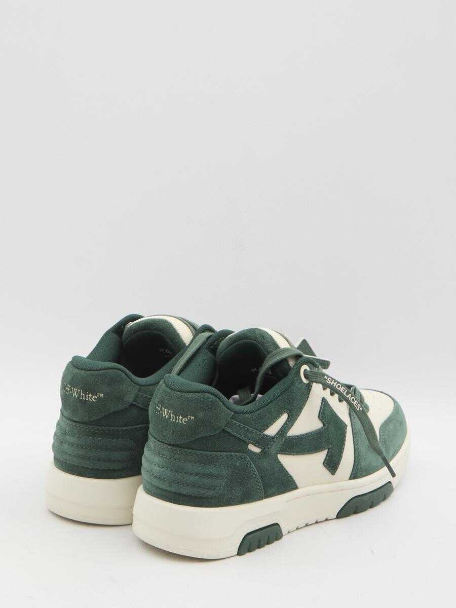 Out Of Office sneakers in ecru and green suede and polyester. They feature lace-up closure with "shoelaces," a round and perforated toe, a green suede heel tab with Off-White logo, green suede arrow details on the sides, a removable Zip Tie tag in suede, a logo on the tongue and insole, and a rubber sole. Dust bag included. Any imperfections in the leather should not be considered manufacturing defects but rather a characteristic of the material.