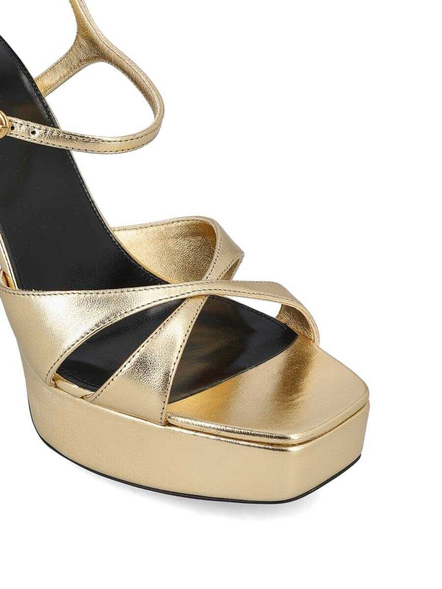 - Upper: lambskin leather - Color: gold - Leather sole - Heel height: 8.5 cm - Round metal engraved Saint-Laurent plaque on insole - Adjustable ankle strap - Made in Italy - Box included - Item number: 8205790NL008008
