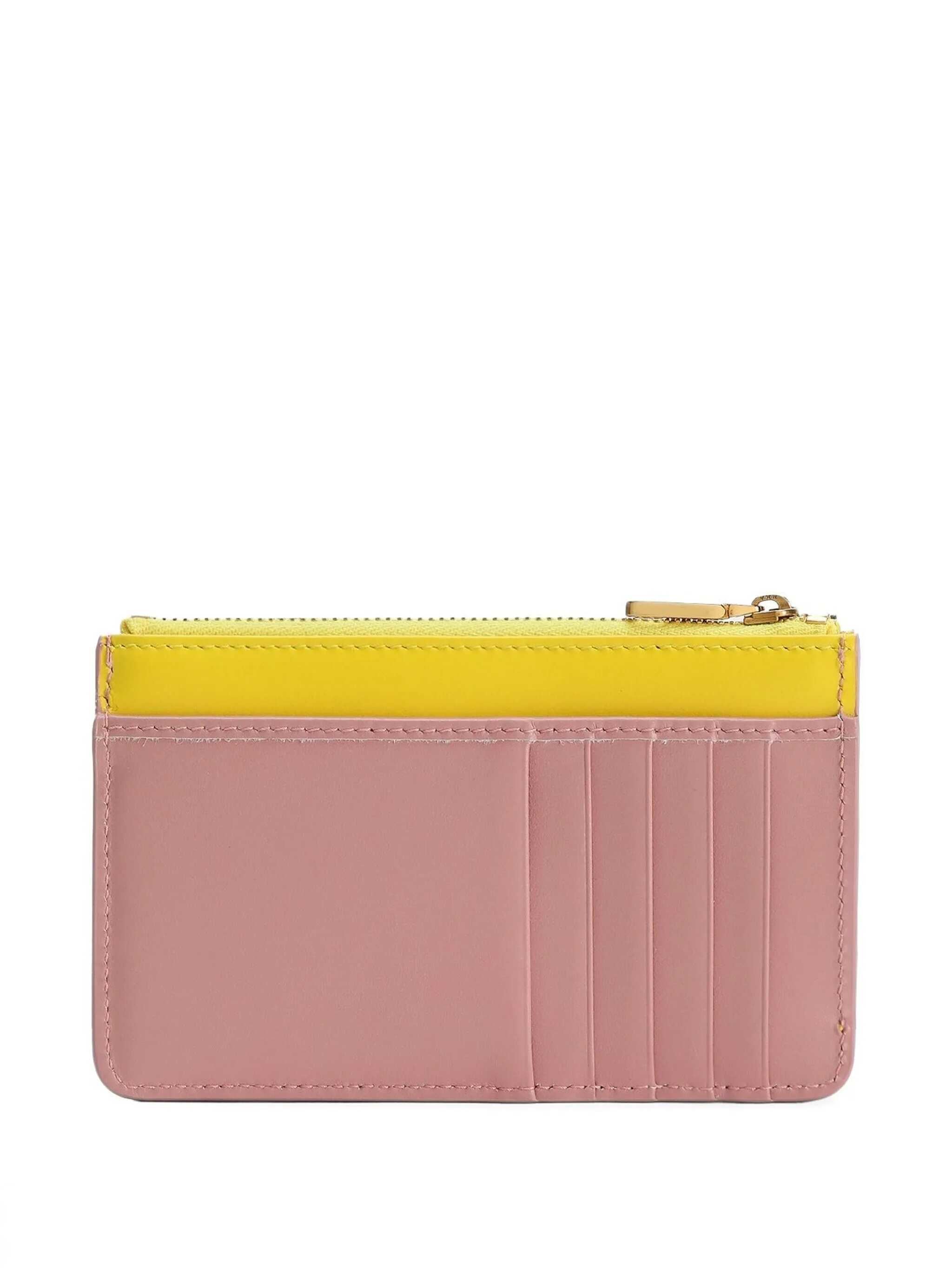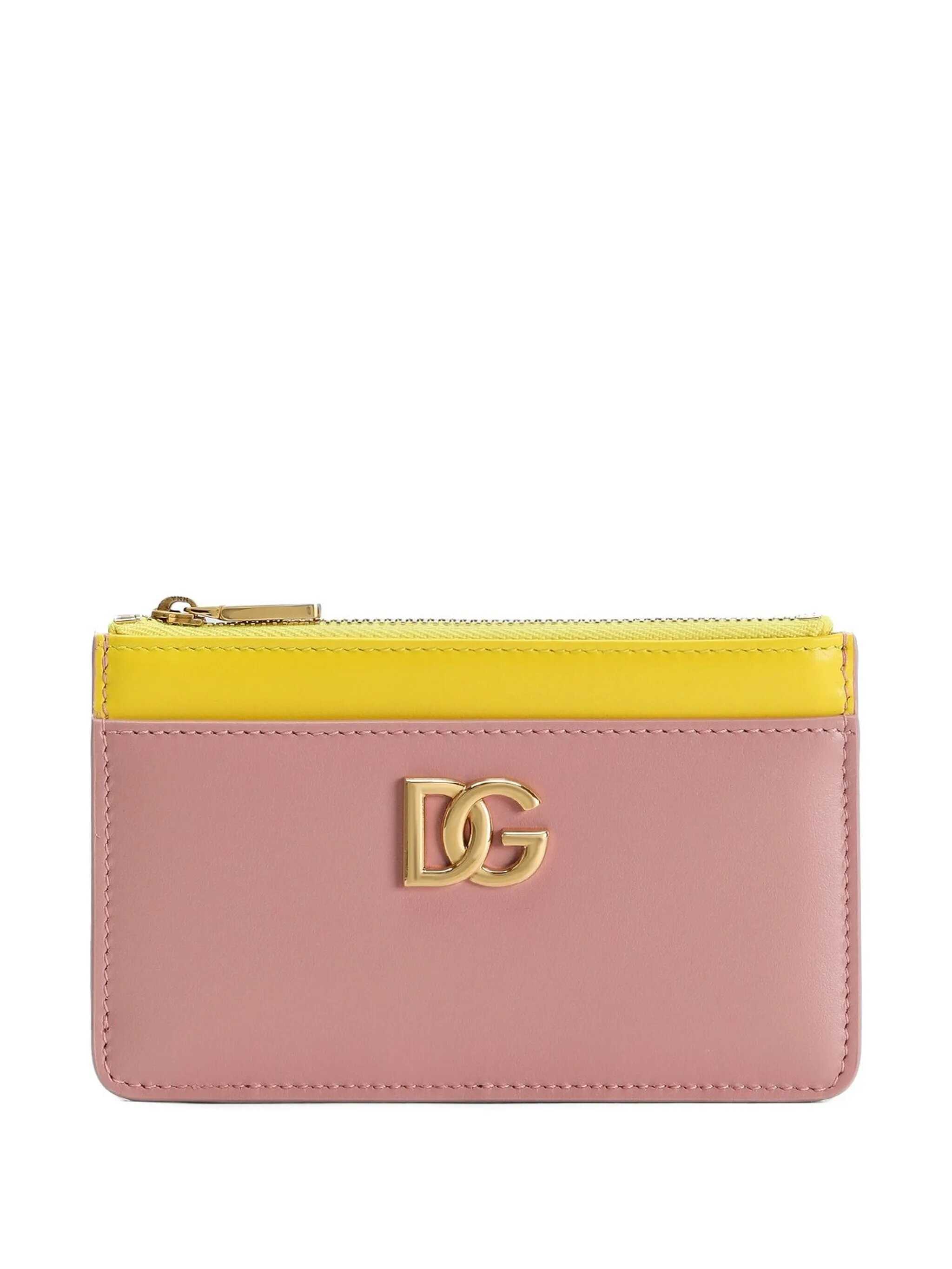 Calfskin card holder Pink and yellow color Metal DG logo 1 zip pocket 1 slit pocket on the front 1 slit pocket on the back Dimensions: Length 14 cm Height 9 cm Depth 1 cm